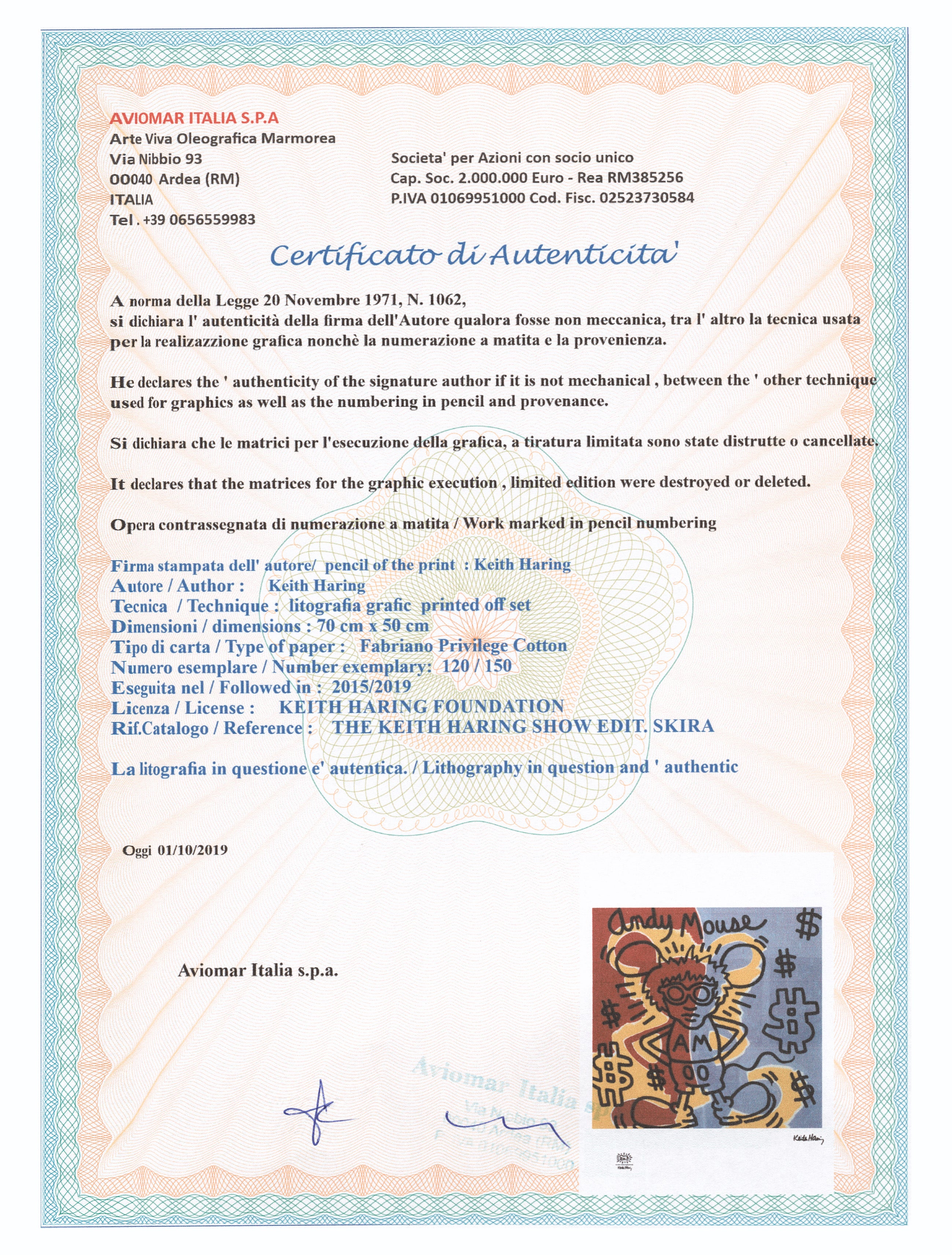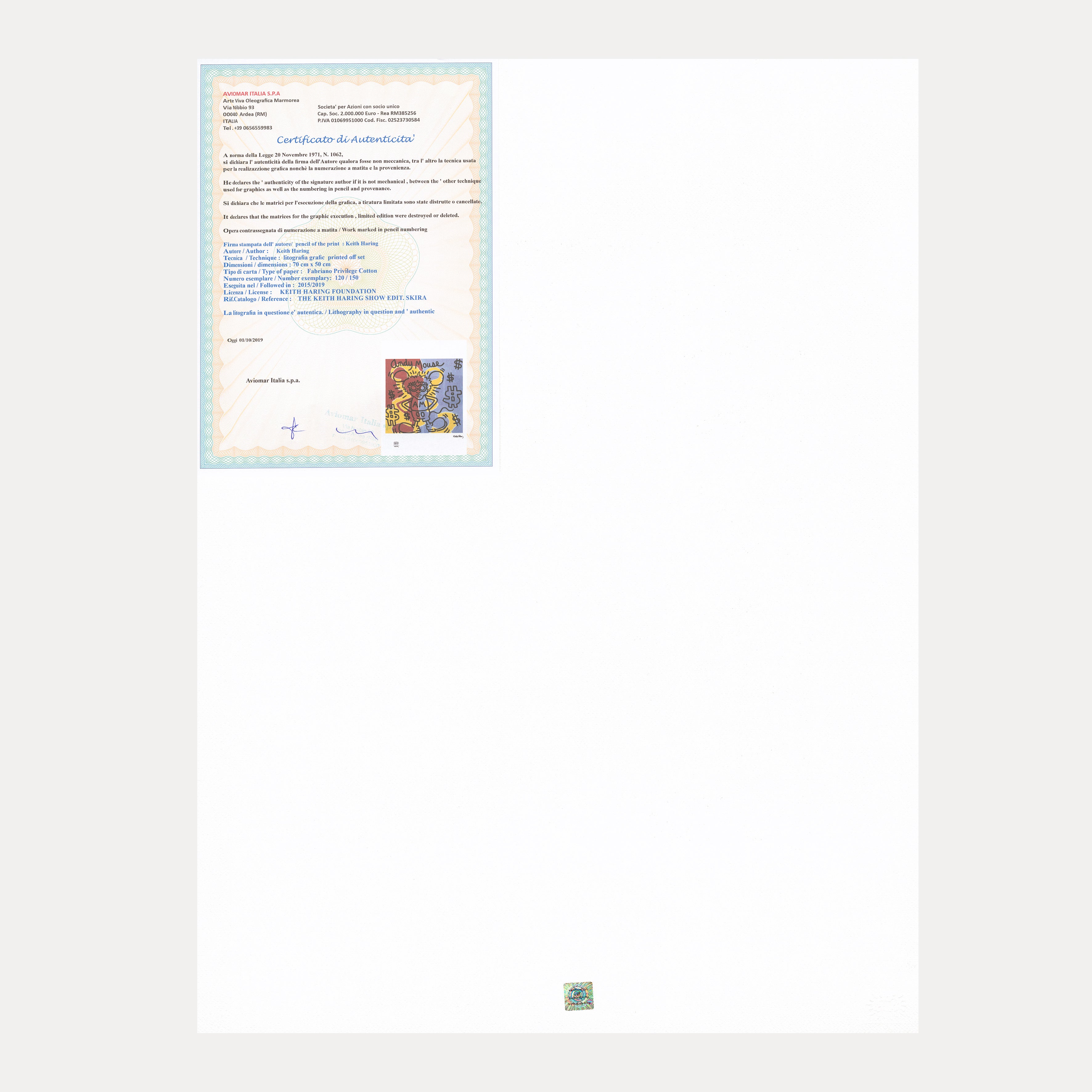 Certifikovaný grafický list, 50 x 70 cm. Číslováno 120/150. Certifikát, slepotisk a licence KEITH HARING FOUNDATION, ruční papír Fabriano Privilege Cotton. Signováno vpravo dole Keith Haring.