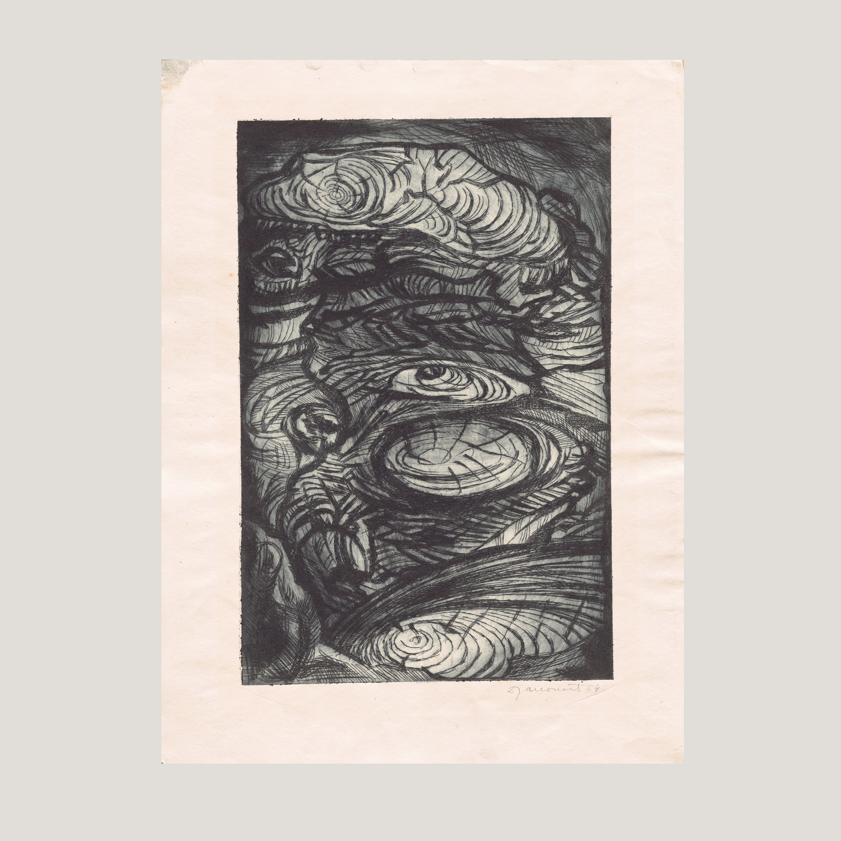 Suchá jehla. Tisková plocha 22,2x35 cm, grafický list 30,8x44,5 cm, signováno tužkou Dušan Janoušek 64, volný list.