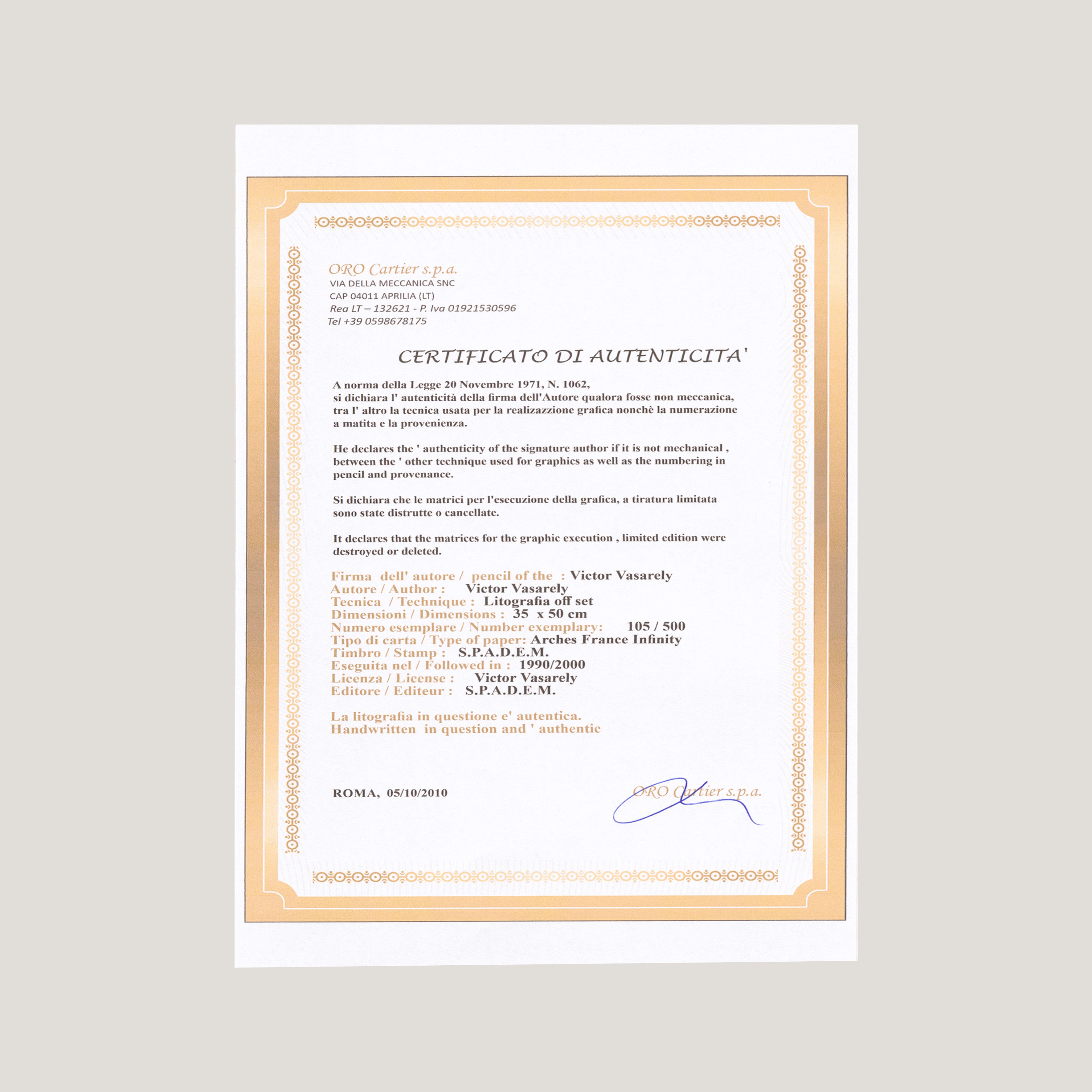 Grafický list 35x50 cm v limitovaném nákladu. Tisk č. 105/500. Slepotiskové razítko S.P.A.D.E.M. Volný list. Certifikát, ruční papír Arches France Infinity. Licence: Victor Vasarely Museum. Editor: S.P.A.D.E.M.