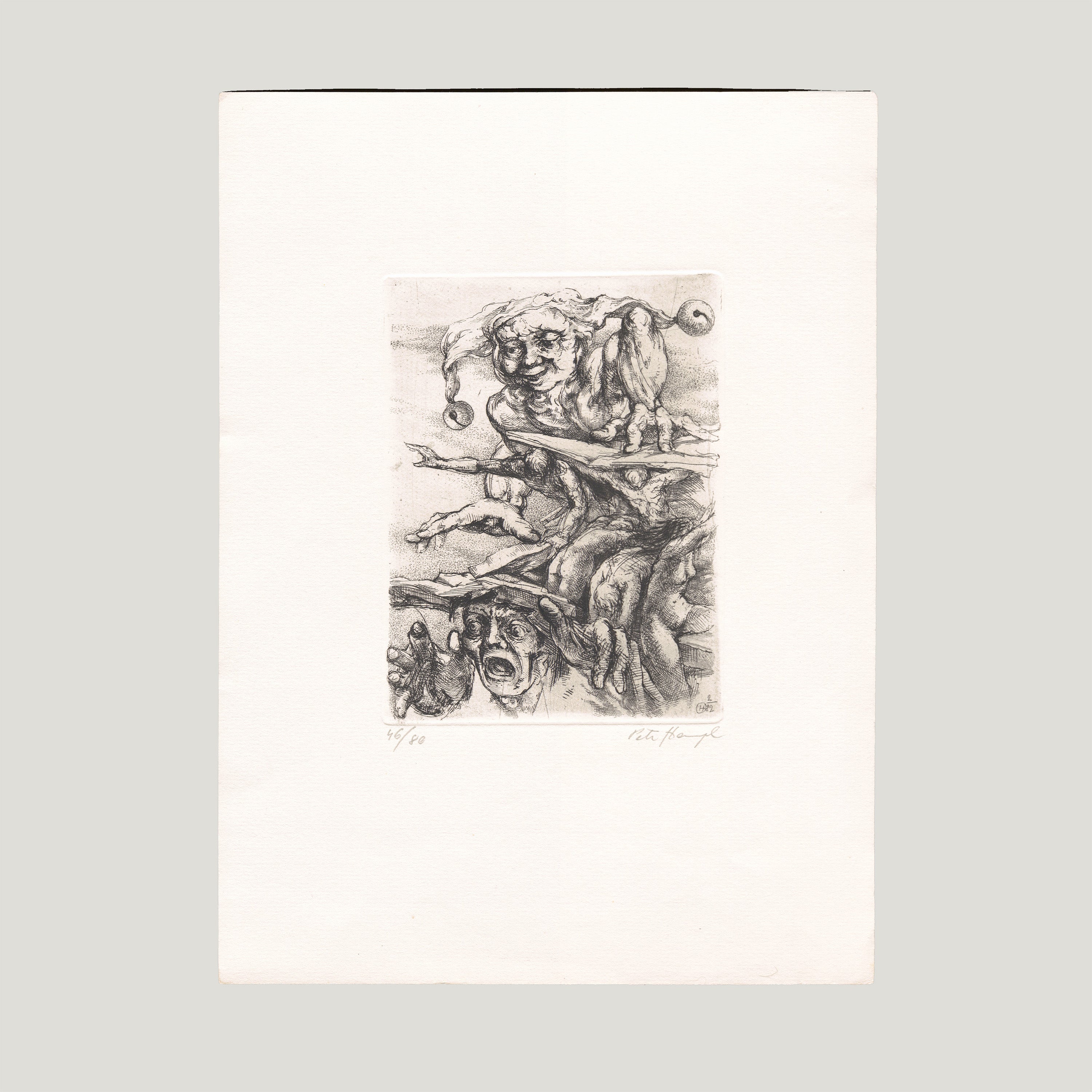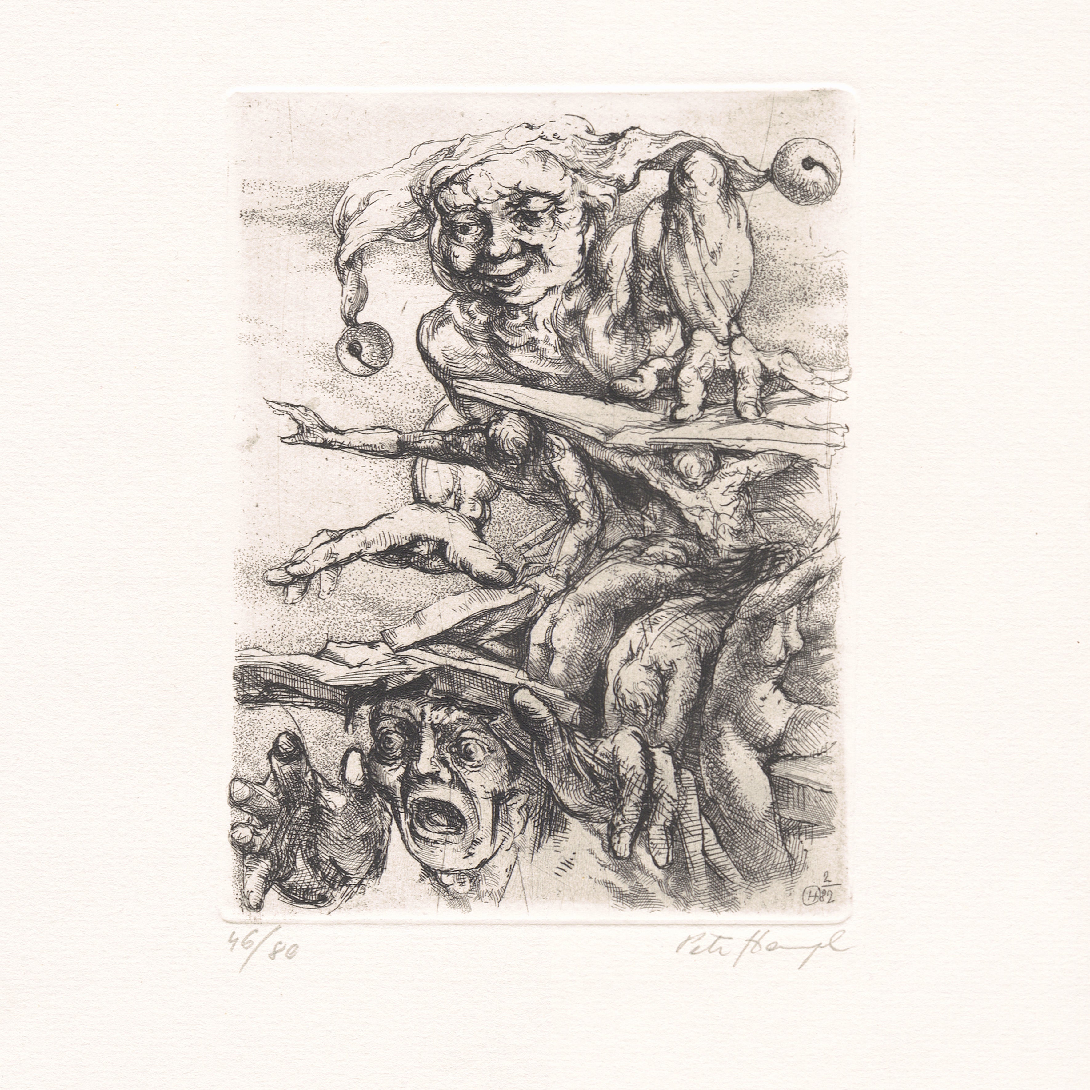Lept, 10,7x14,5 cm tisková plocha, 20,8x29,4 cm grafický list. Číslováno 46/80, datováno a signováno vpravo dole