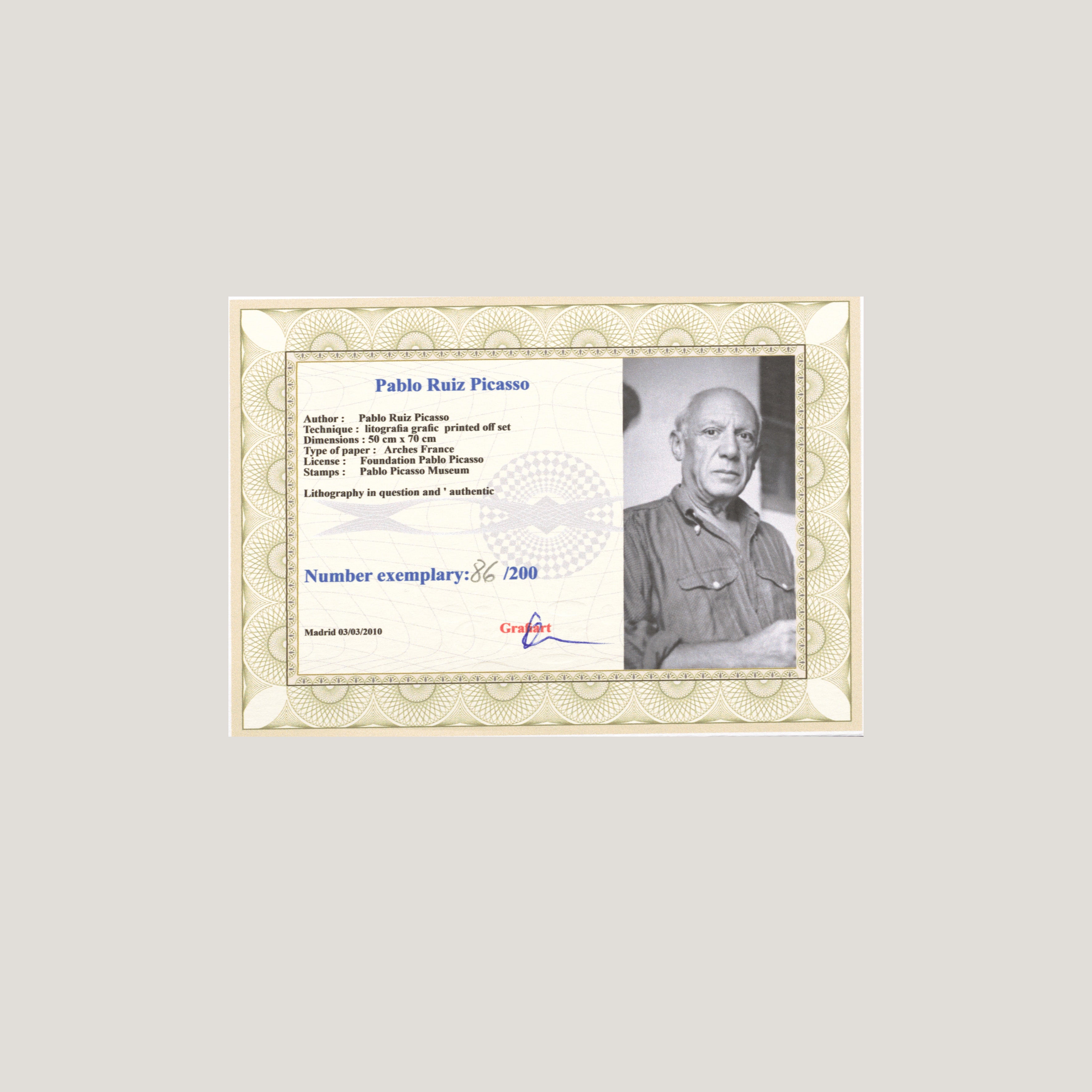 Grafický list 50x70 cm v limitovaném nákladu. Tisk č. 86/200. Slepotiskové razítko Pablo Picasso Museum. Volný list. Certifikát, ruční papír Arches France. Licence: Foundation Pablo Picasso