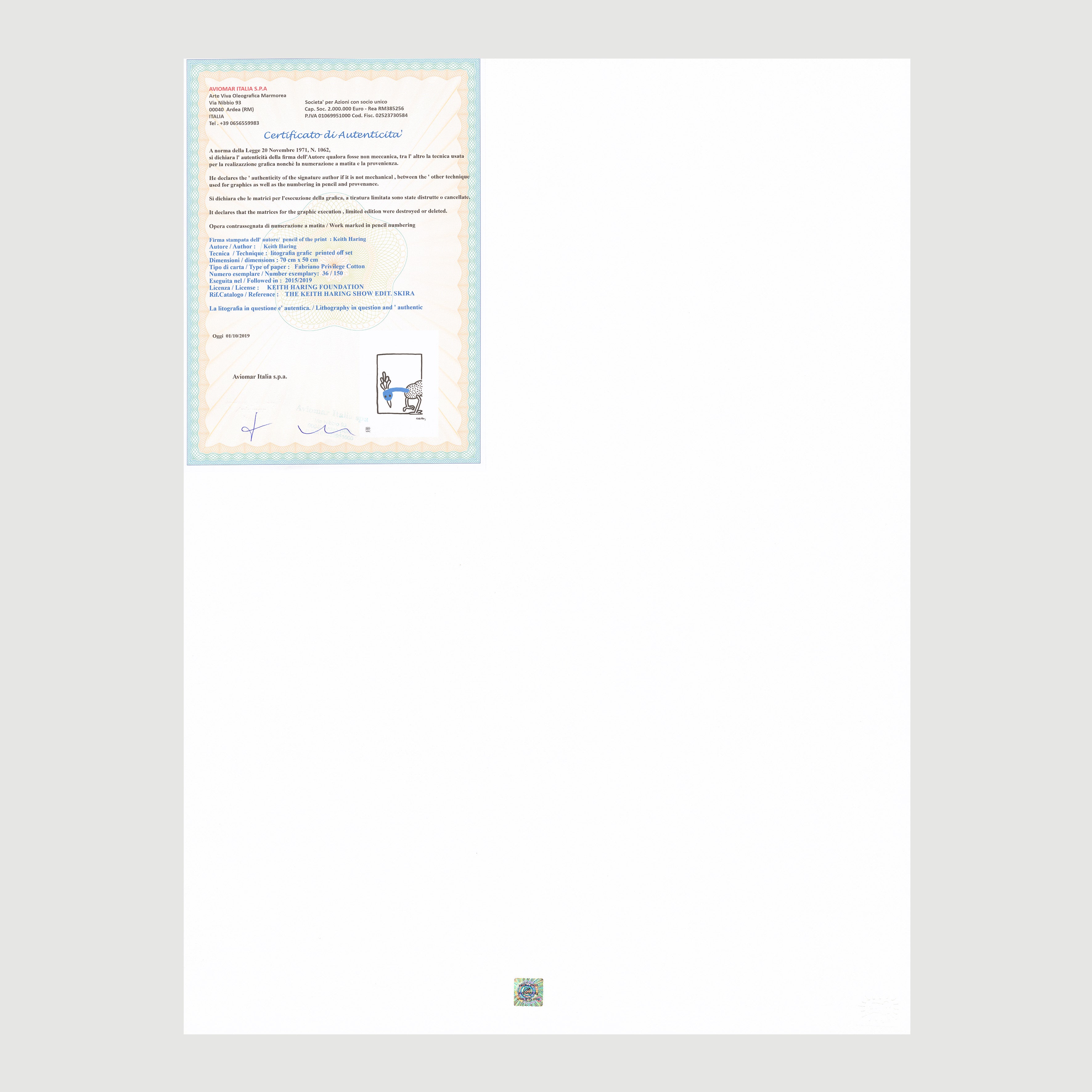 Certifikovaný grafický list, 50 x 70 cm. Číslováno 36/150. Certifikát, slepotisk a licence KEITH HARING FOUNDATION, ruční papír Fabriano Privilege Cotton. Signováno vpravo dole Keith Haring.