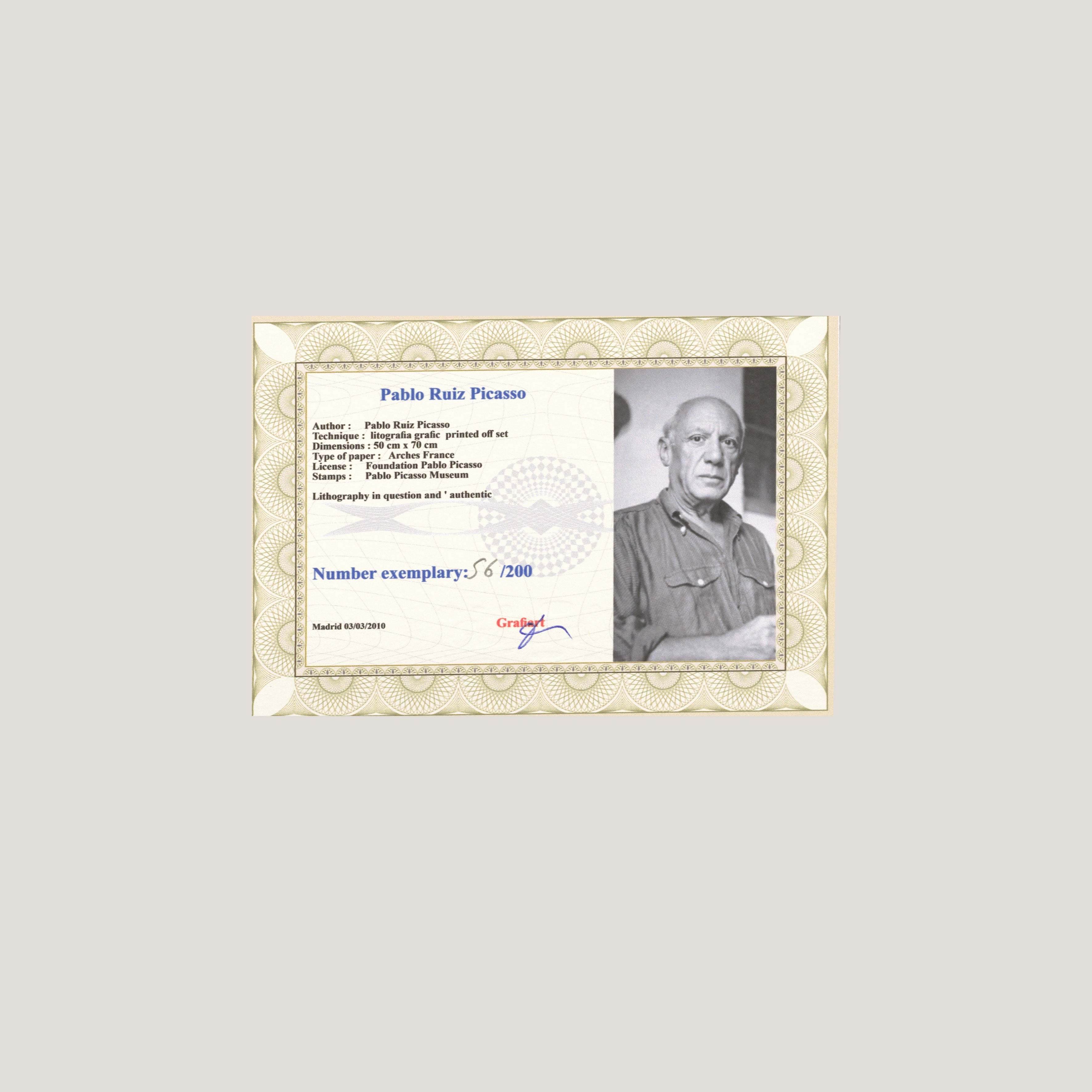 Grafický list 50x70 cm v limitovaném nákladu. Tisk č. 56/200. Slepotiskové razítko Pablo Picasso Museum. Volný list. Certifikát, ruční papír Arches France. Licence: Foundation Pablo Picasso