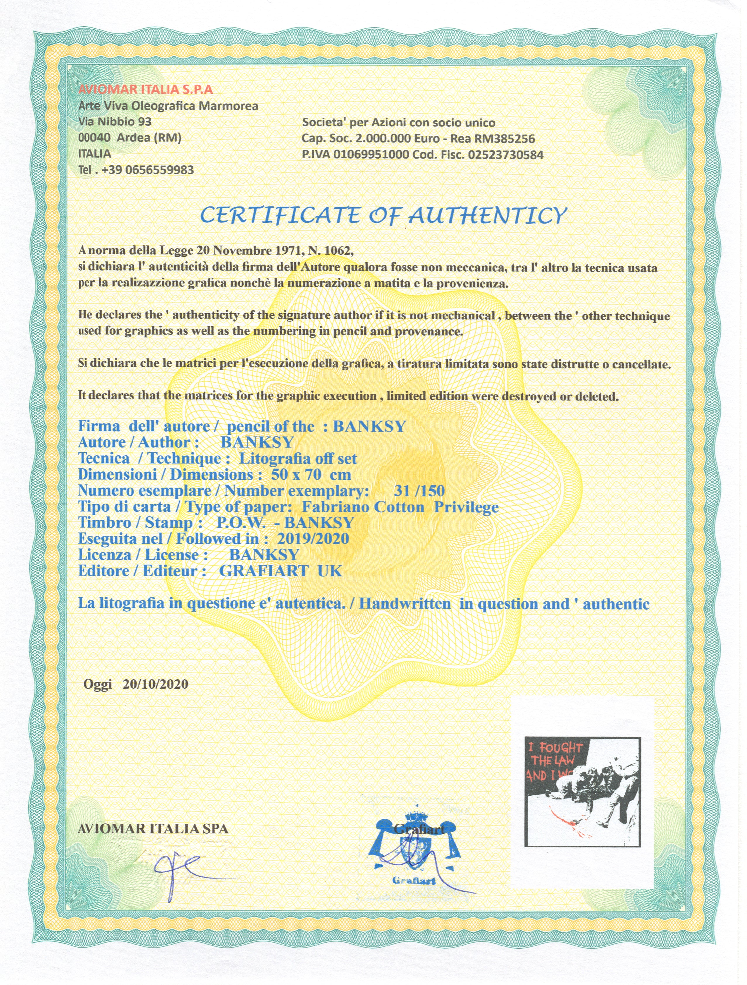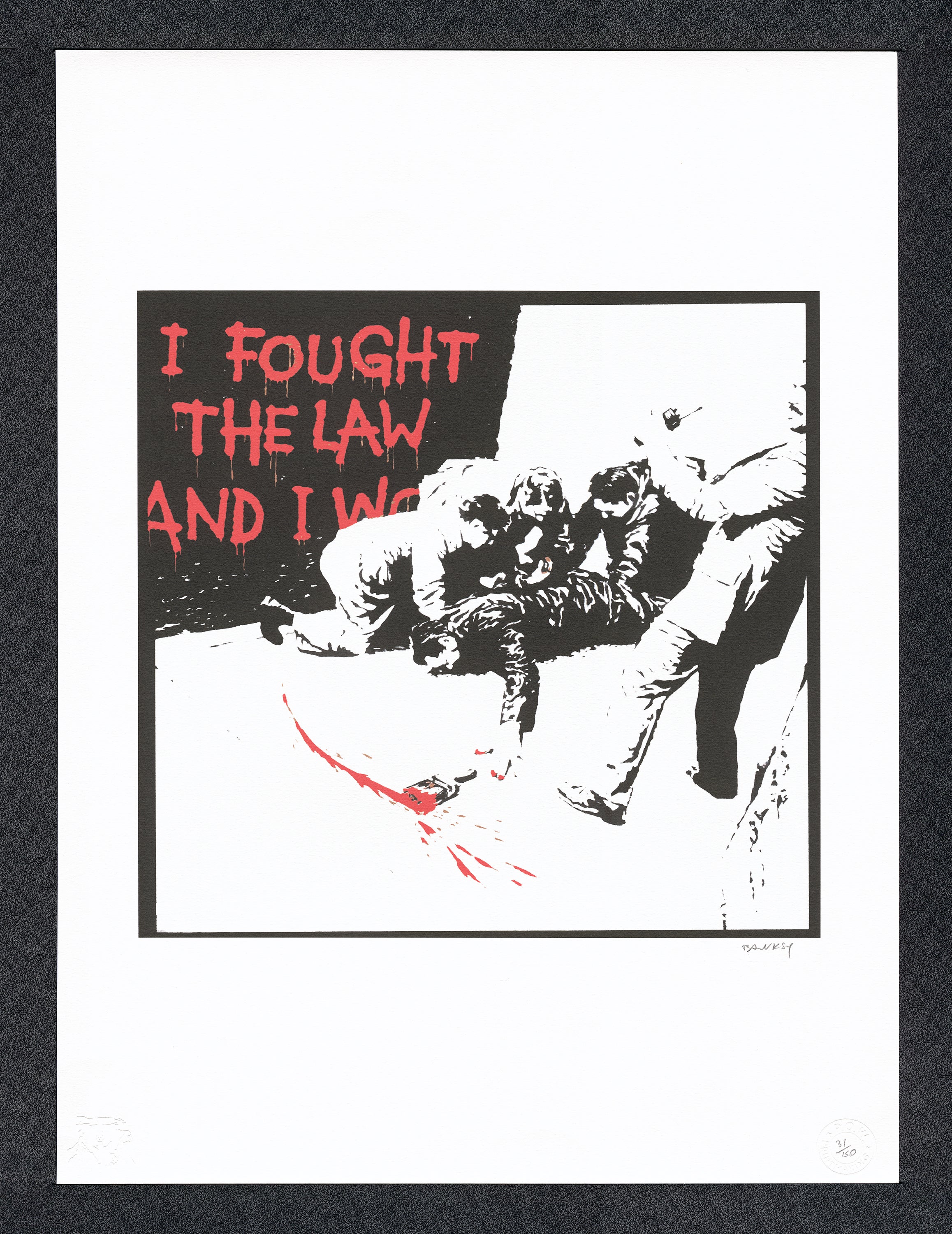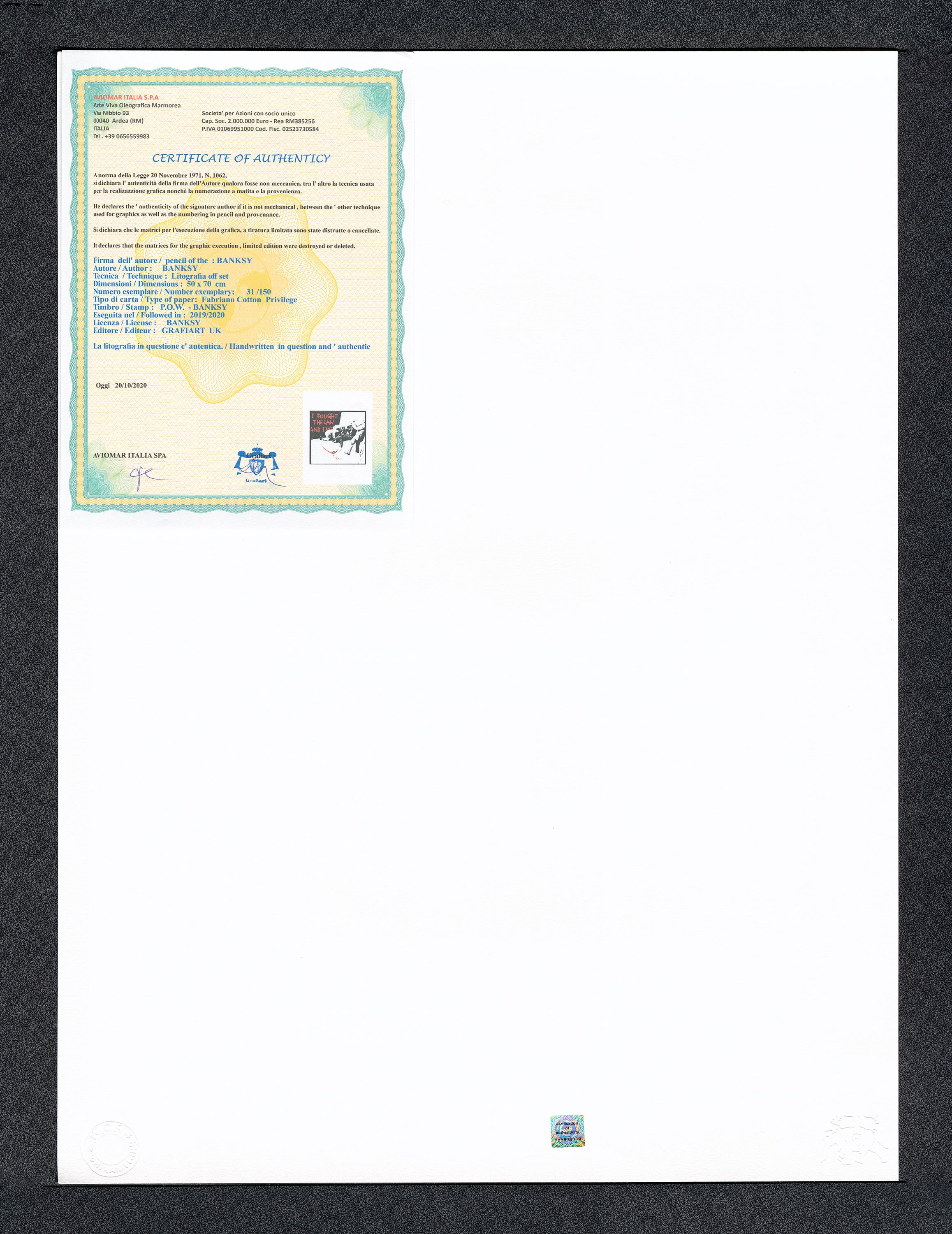 Grafický list, 50 x 70 cm. Číslováno 31/150, slepotisk P.O.W.-BANKSY, ruční papír Fabriano Cotton Privilege. Signováno vpravo dole BANKSY.