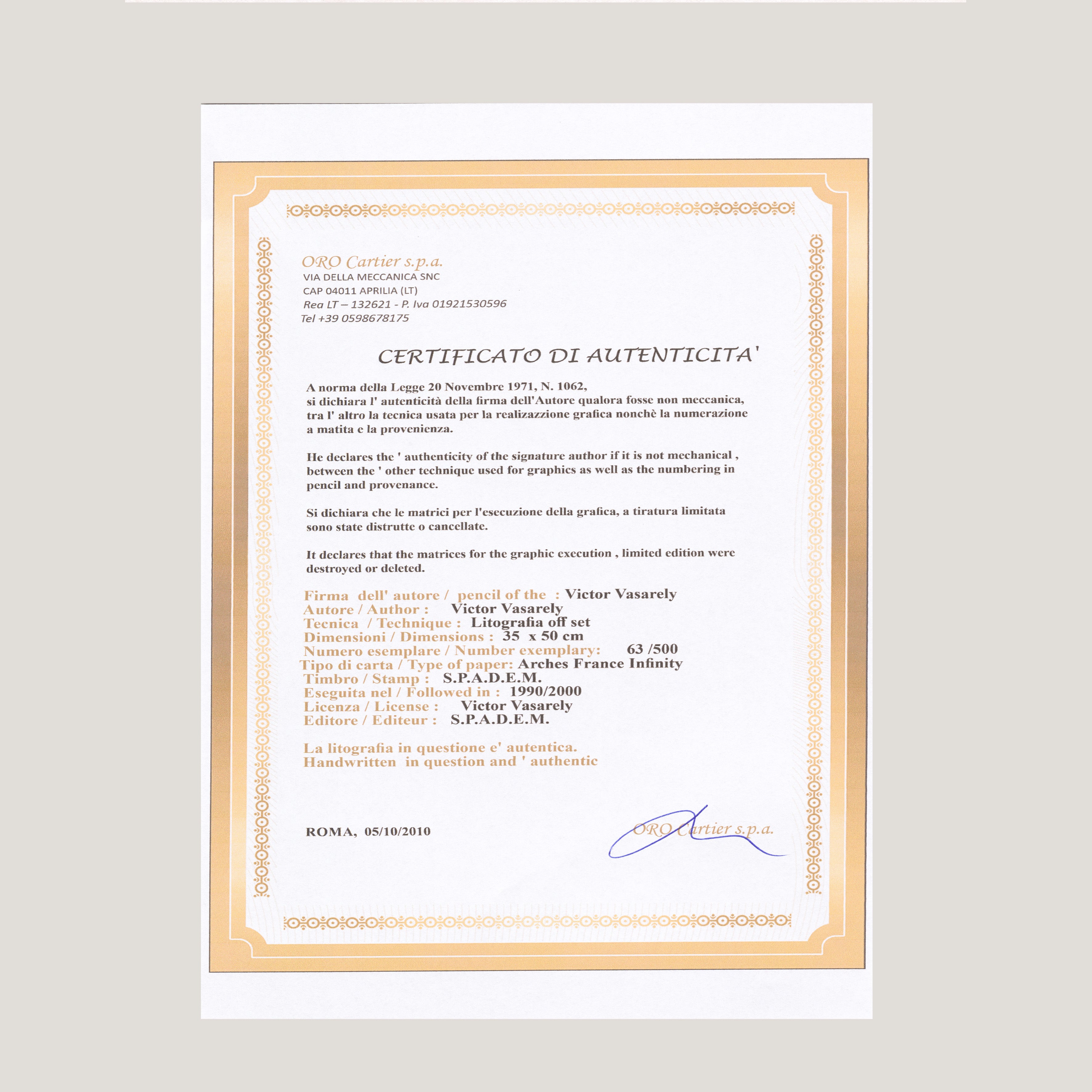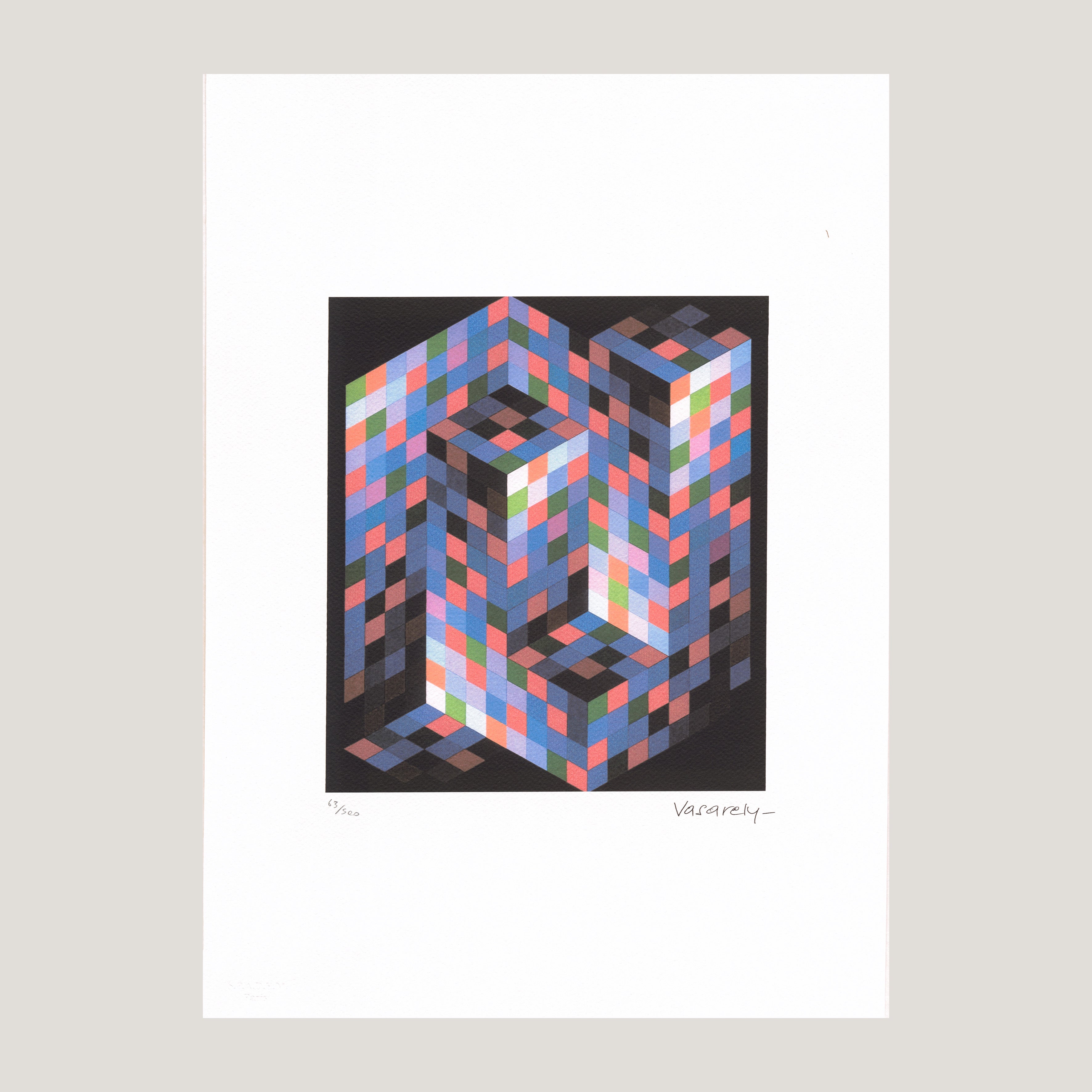 Grafický list 35x50 cm v limitovaném nákladu. Tisk č. 63/500. Slepotiskové razítko S.P.A.D.E.M. Volný list. Certifikát, ruční papír Arches France Infinity. Licence: Victor Vasarely Museum. Editor: S.P.A.D.E.M.