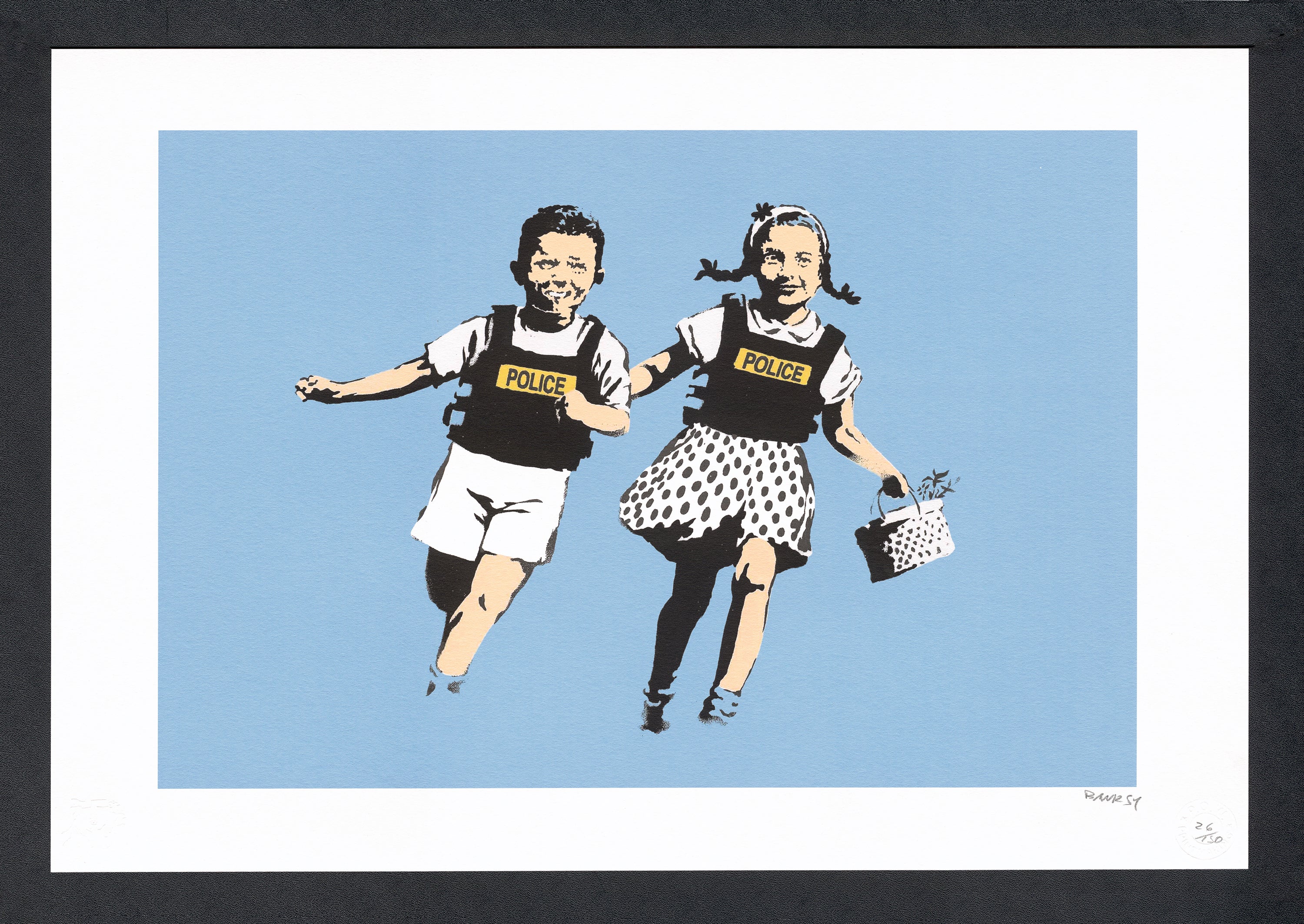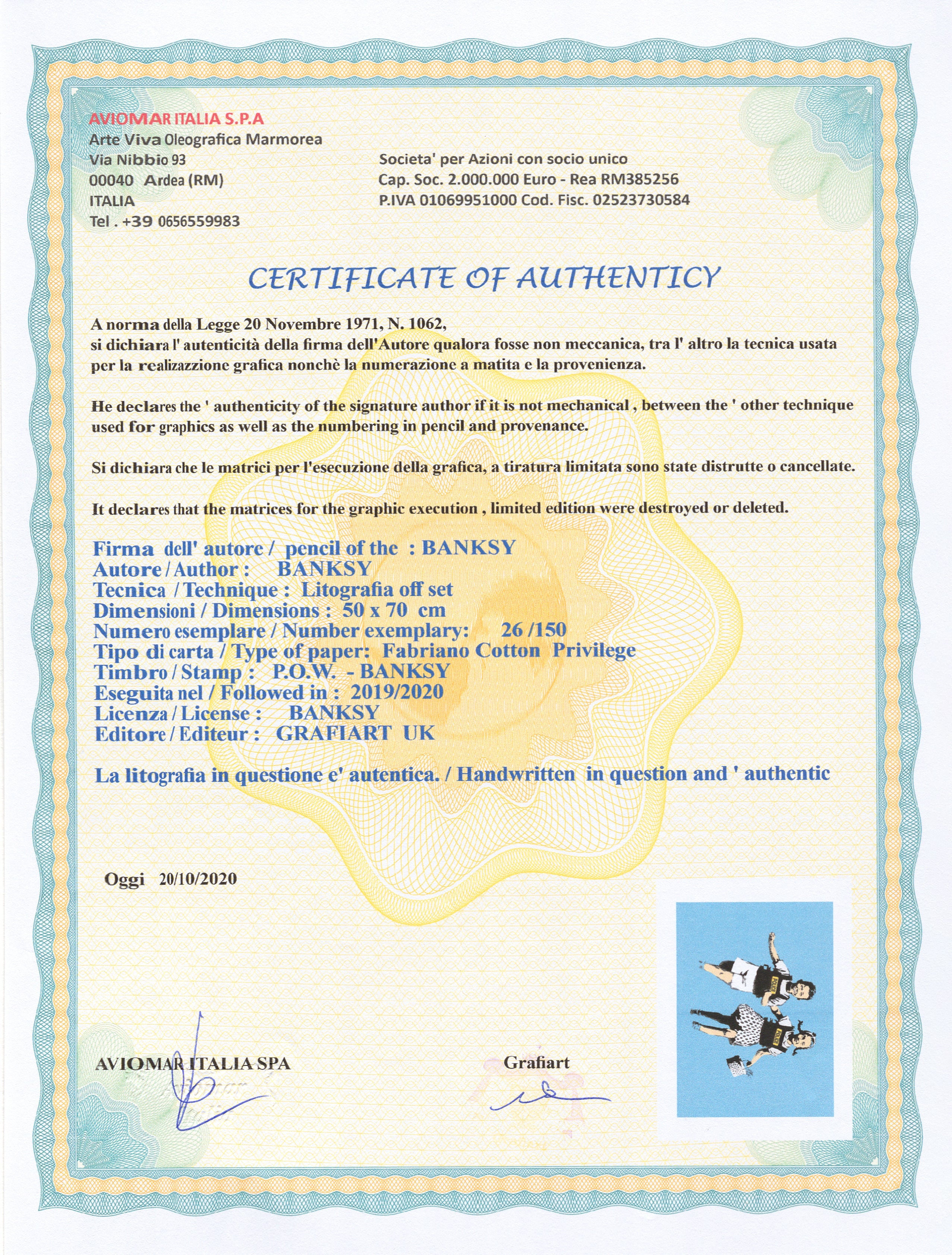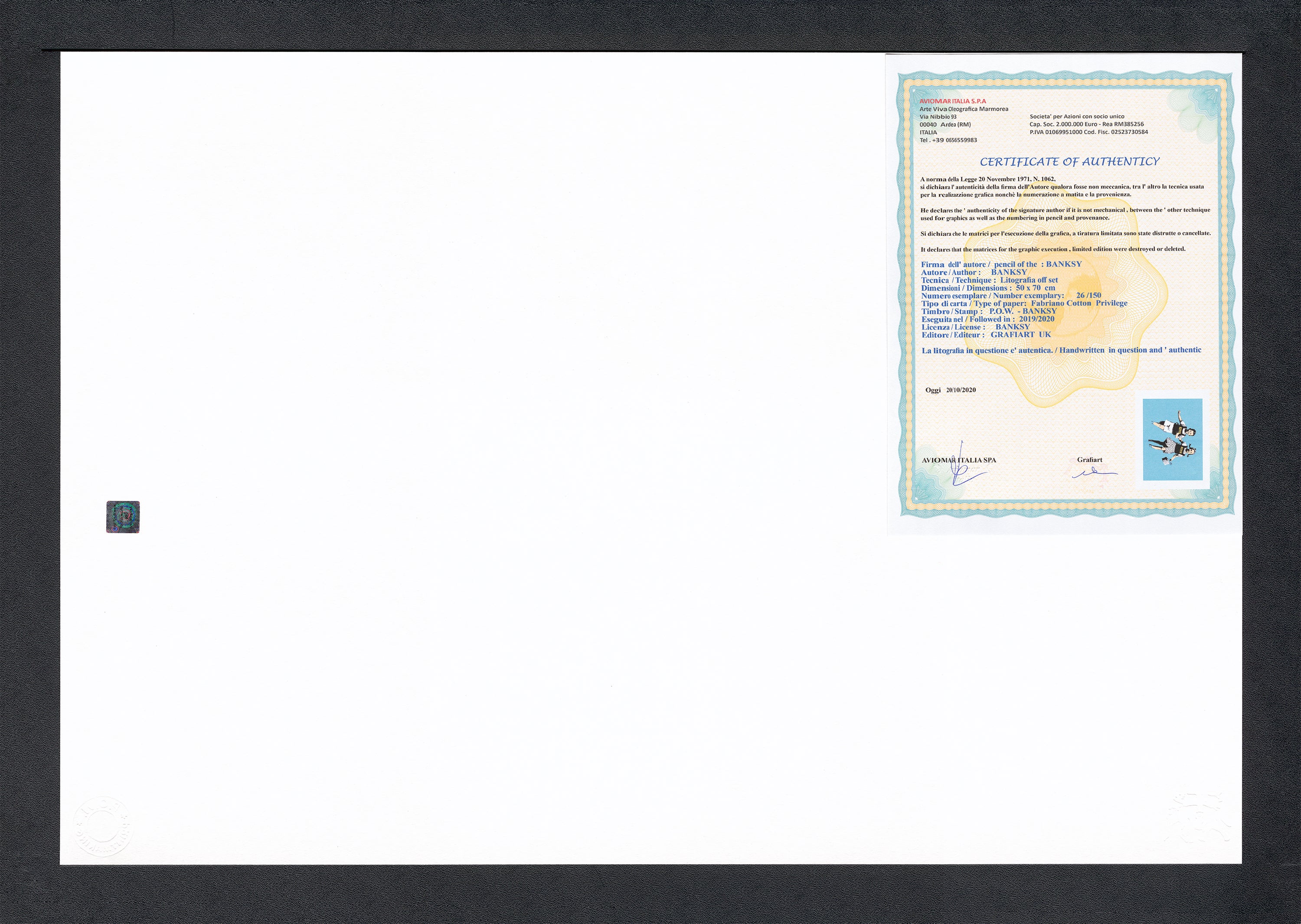 Grafický list, 50 x 70 cm. Číslováno 26/150, slepotisk P.O.W.-BANKSY, ruční papír Fabriano Cotton Privilege. Signováno vpravo dole BANKSY.