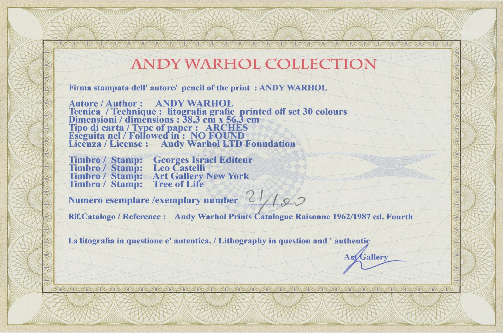Certifikovaný grafický list, 38 x 56 cm, 21/100. Certifikát, slepotisk © ANDY WARHOL, ruční papír Fabriano Privilege. Signováno vpravo dole Andy Warhol. Na zadní straně razítka: ANDY WARHOL Factory.