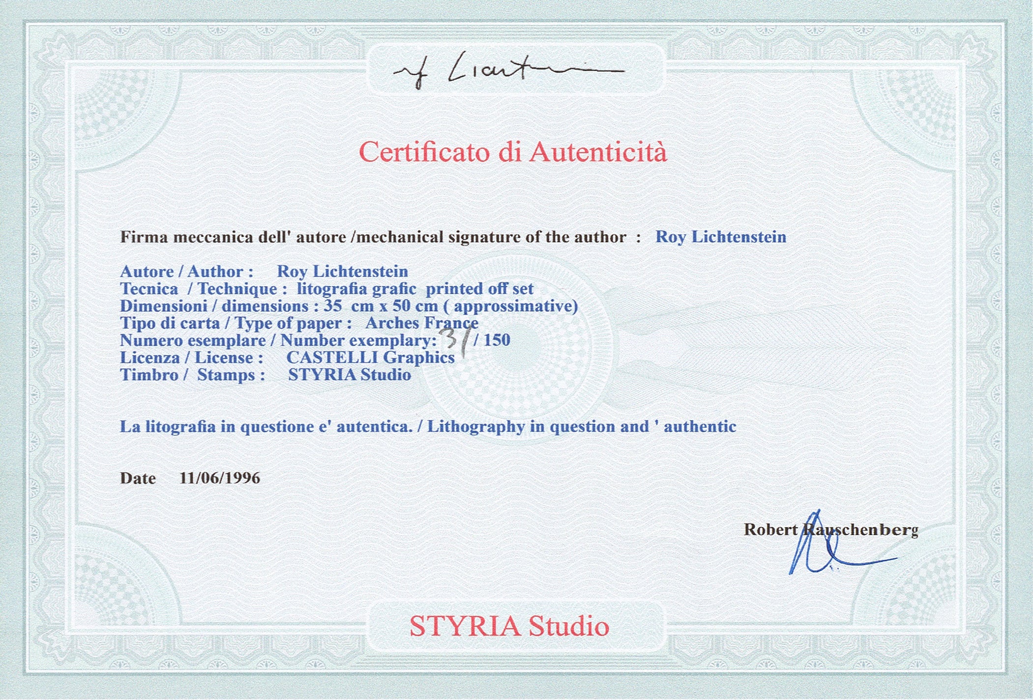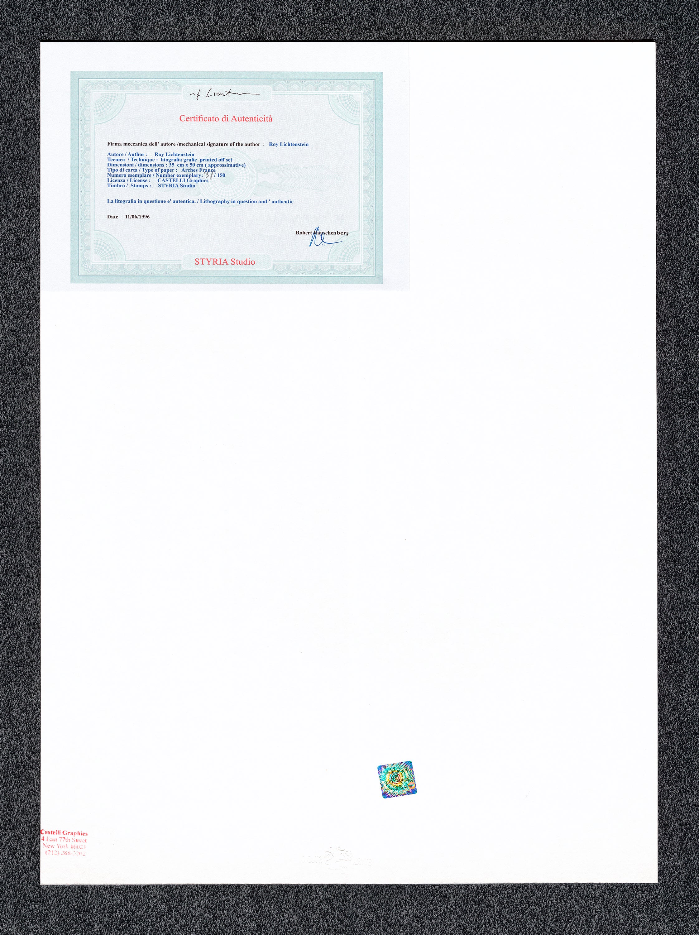 Certifikovaný grafický list, 35 x 50 cm. Certifikát, slepotisk STYRIA Studio, ruční papír Arches France. Signováno vpravo dole Roy Lichtenstein ©. Na zadní straně razítko: CASTELLI Graphics.