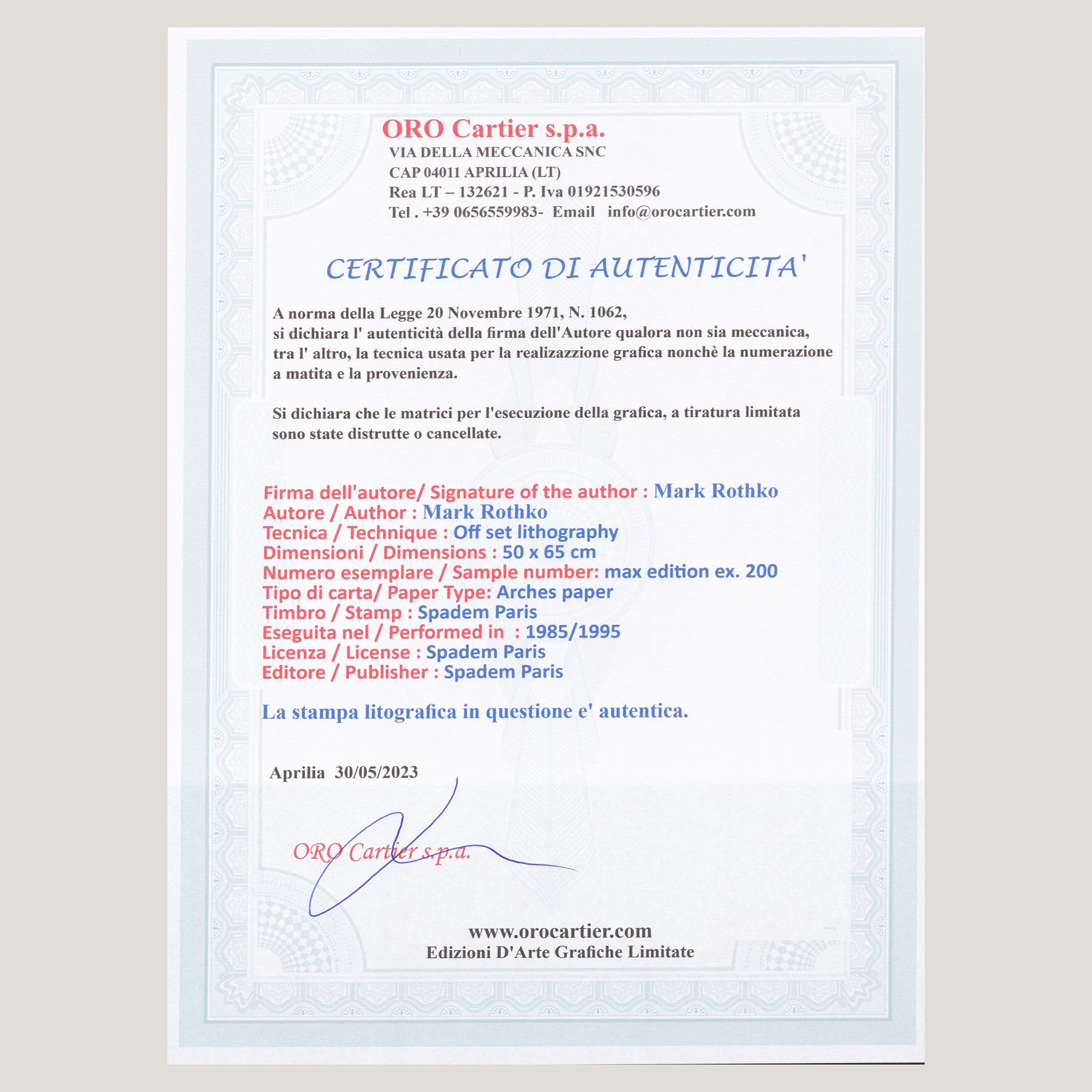 Grafický list 50x65 cm v limitovaném nákladu. Tisk č. 61/200. Slepotiskové razítko SPADEM PARIS. Volný list. Papír Arches paper. Licence: Spadem Paris