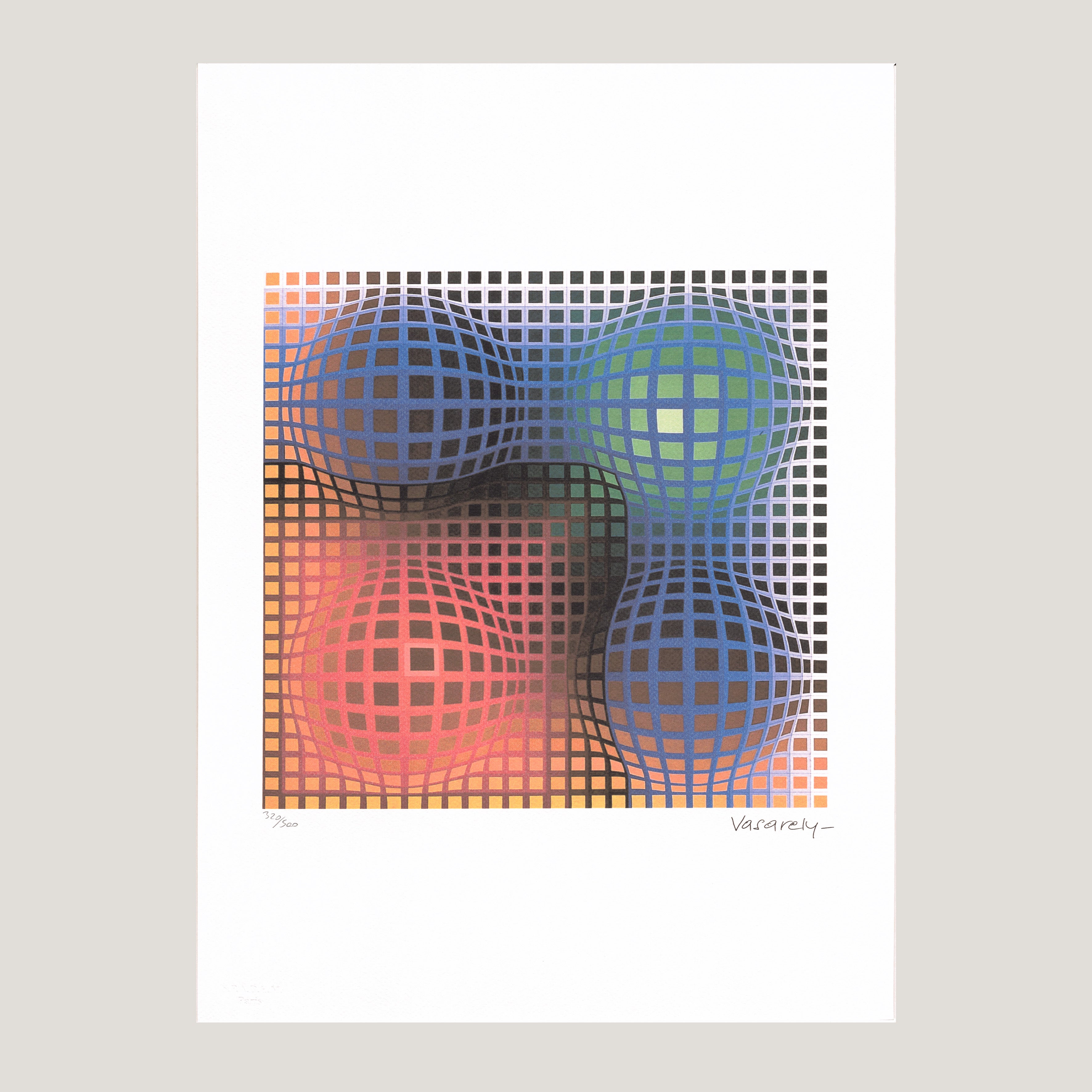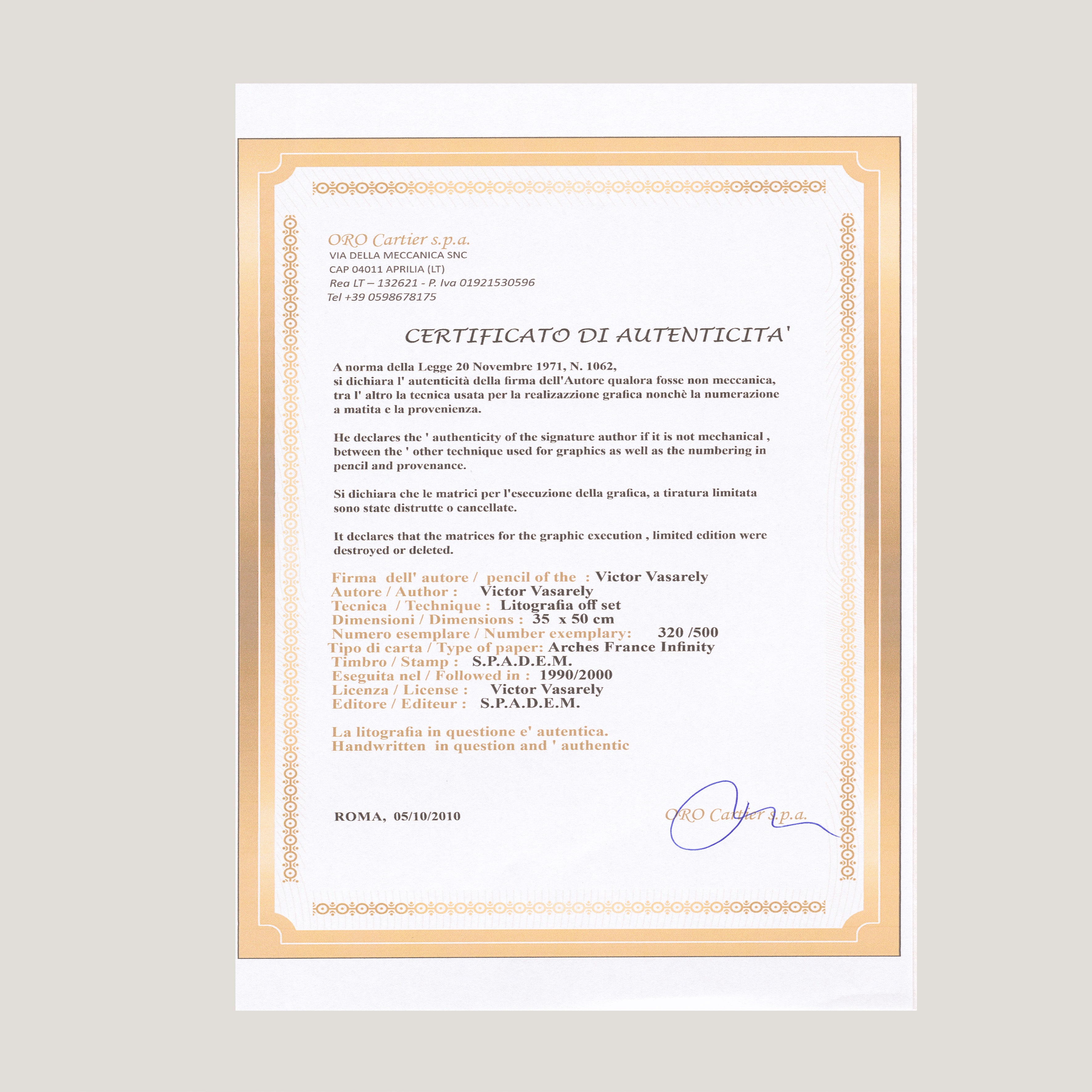 Grafický list 35x50 cm v limitovaném nákladu. Tisk č. 320/500. Slepotiskové razítko S.P.A.D.E.M. Volný list. Certifikát, ruční papír Arches France Infinity. Licence: Victor Vasarely Museum. Editor: S.P.A.D.E.M.