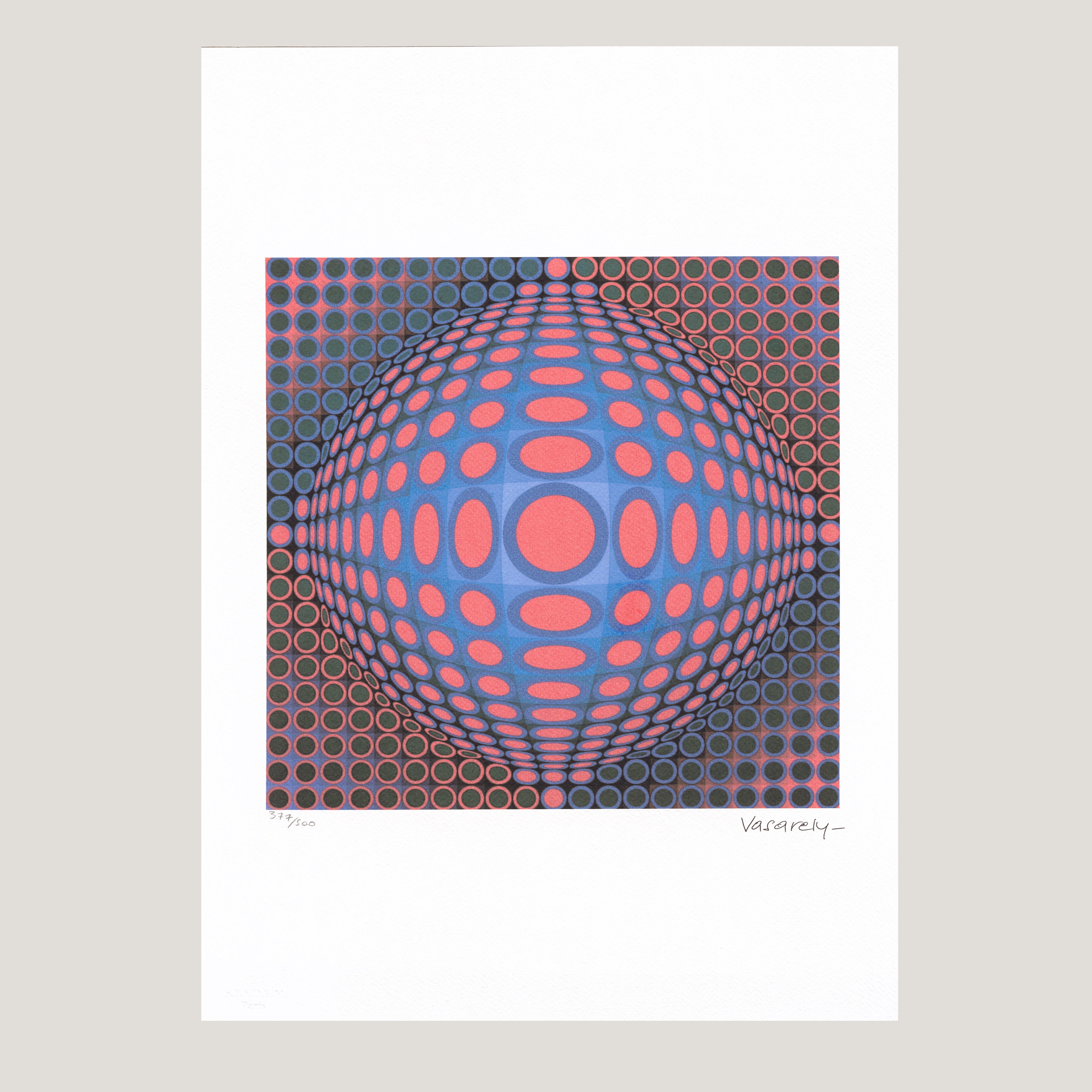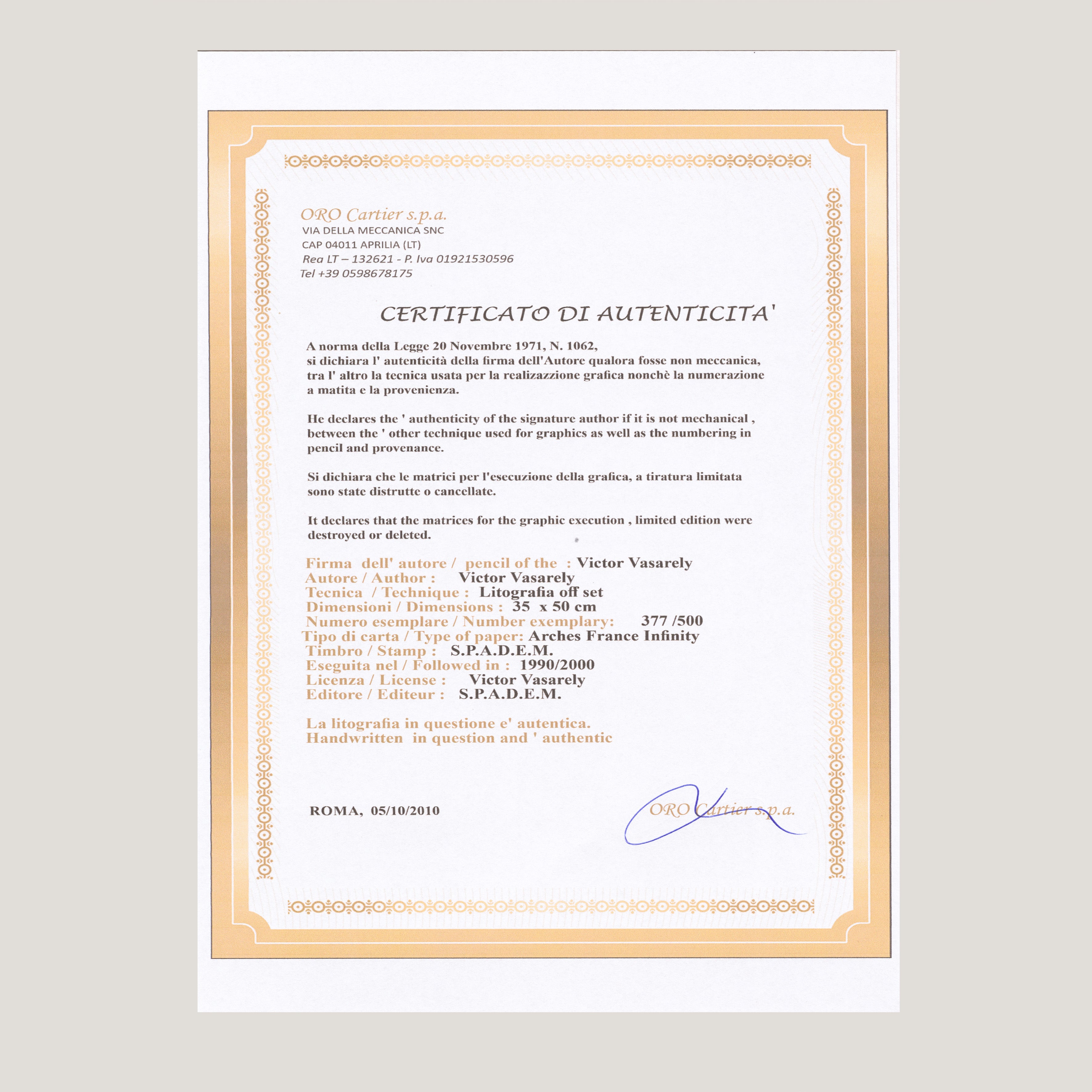 Grafický list 35x50 cm v limitovaném nákladu. Tisk č. 377/500. Slepotiskové razítko S.P.A.D.E.M. Paris. Volný list. Certifikát, ruční papír Arches France Infinity. Licence: Victor Vasarely Museum. Editor: S.P.A.D.E.M.