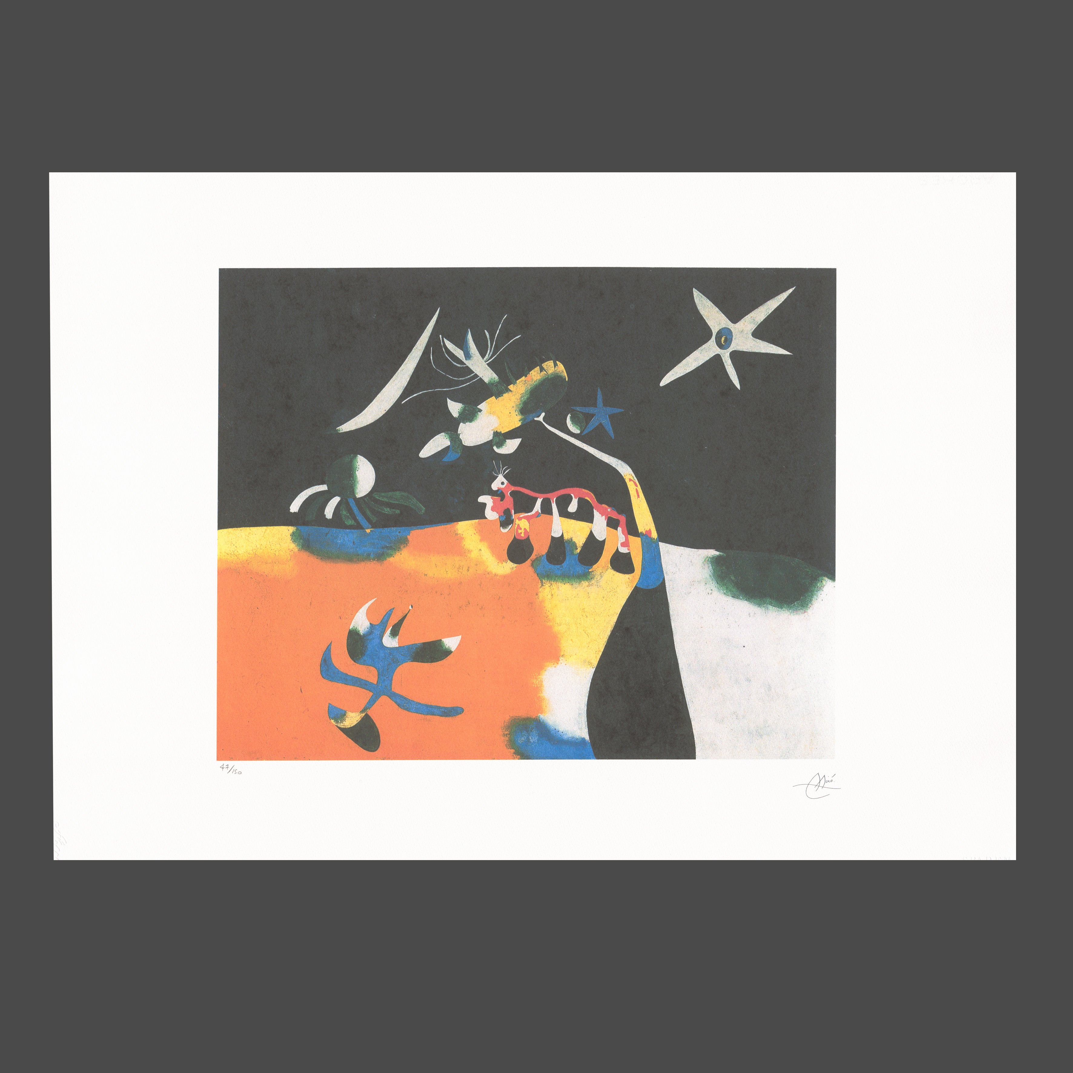 Joan Miró (1893-1983) byl významným katalánským malířem, sochařem a keramikem. Navštěvoval školu Escuelu de Bellas Artes, na které studoval i Pablo Picasso dvanáct let před ním. Jeho učitelé byli nadšeni jeho talentem, Miró však trpěl depresemi a nervovými problémy. Po pobytu na venkovském statku v Mont-roig del Camp se definitivně rozhodl stát se malířem. Studoval na Škole umění v Barceloně a následně se seznámil se surrealismem, což mělo významný vliv na jeho tvorbu. Miró byl známý svým osobitým stylem - kombinoval abstrakci s poetickými prvky. Jeho díla jsou plná barevnosti a rytmu, který vytvářel geometrickými tvary. Miró se stal blízkým přítelem Pabla Picassa, který ho podporoval v jeho uměleckém snažení. Byl aktivní v surrealistickém hnutí, ale jeho přístup k němu byl odlišný. Zatímco ostatní surrealisté se zaměřovali na snovou a halucinační stránku, Miró se nechával vést svou vlastní představivostí. Vytvořil řadu grafických děl včetně litografií. Během druhé světové války se jeho díla stala reakcí na politické události, a to zejména v jeho vlastní Španělsku. Později se přestěhoval do Normandie a vytvořil několik významných nástěnných maleb. Joan Miró byl významným umělcem 20. století, jehož dílo ovlivnilo moderní uměleckou scénu.