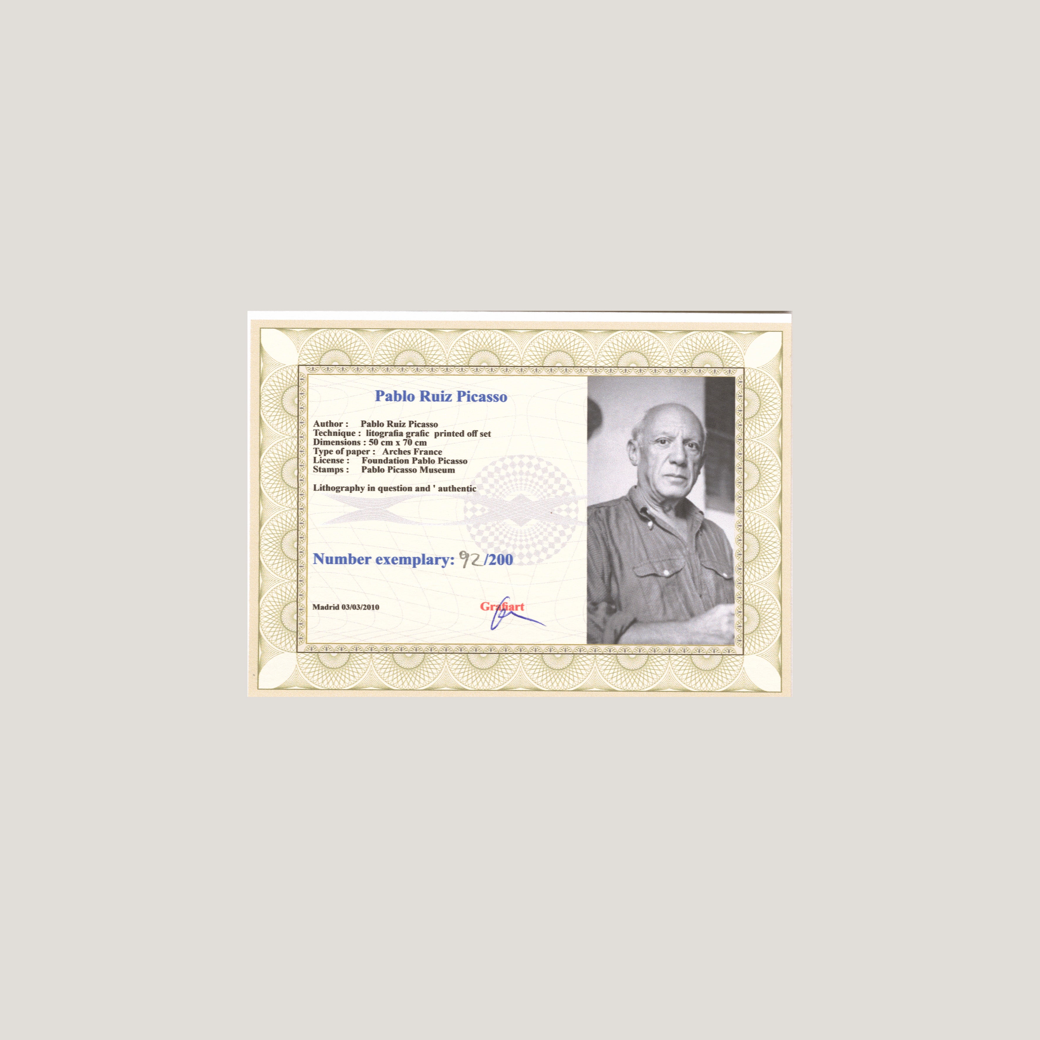 Grafický list 50x70 cm v limitovaném nákladu. Tisk č. 100/200. Slepotiskové razítko Pablo Picasso Museum. Volný list. Certifikát, ruční papír Arches France. Licence: Foundation Pablo Picasso