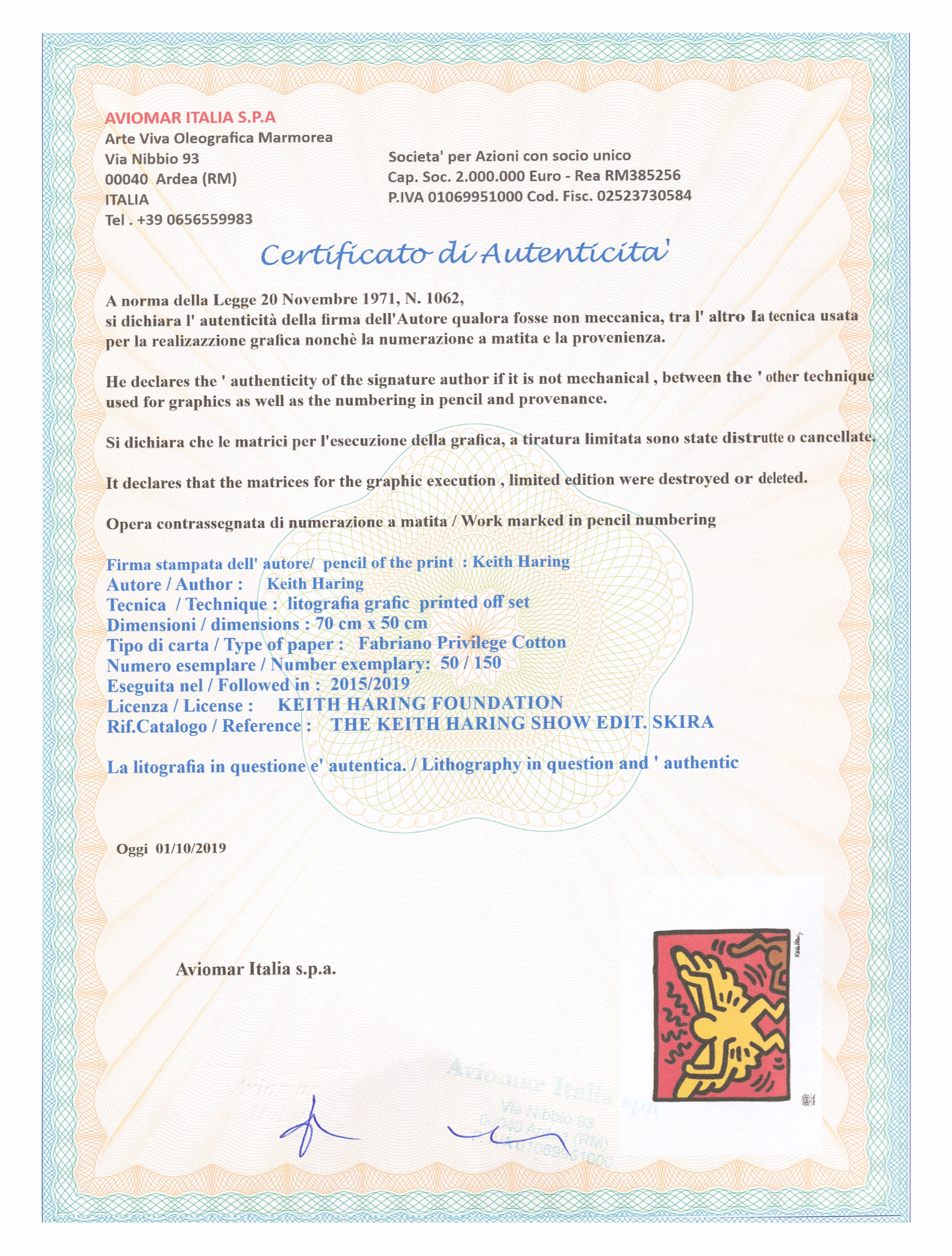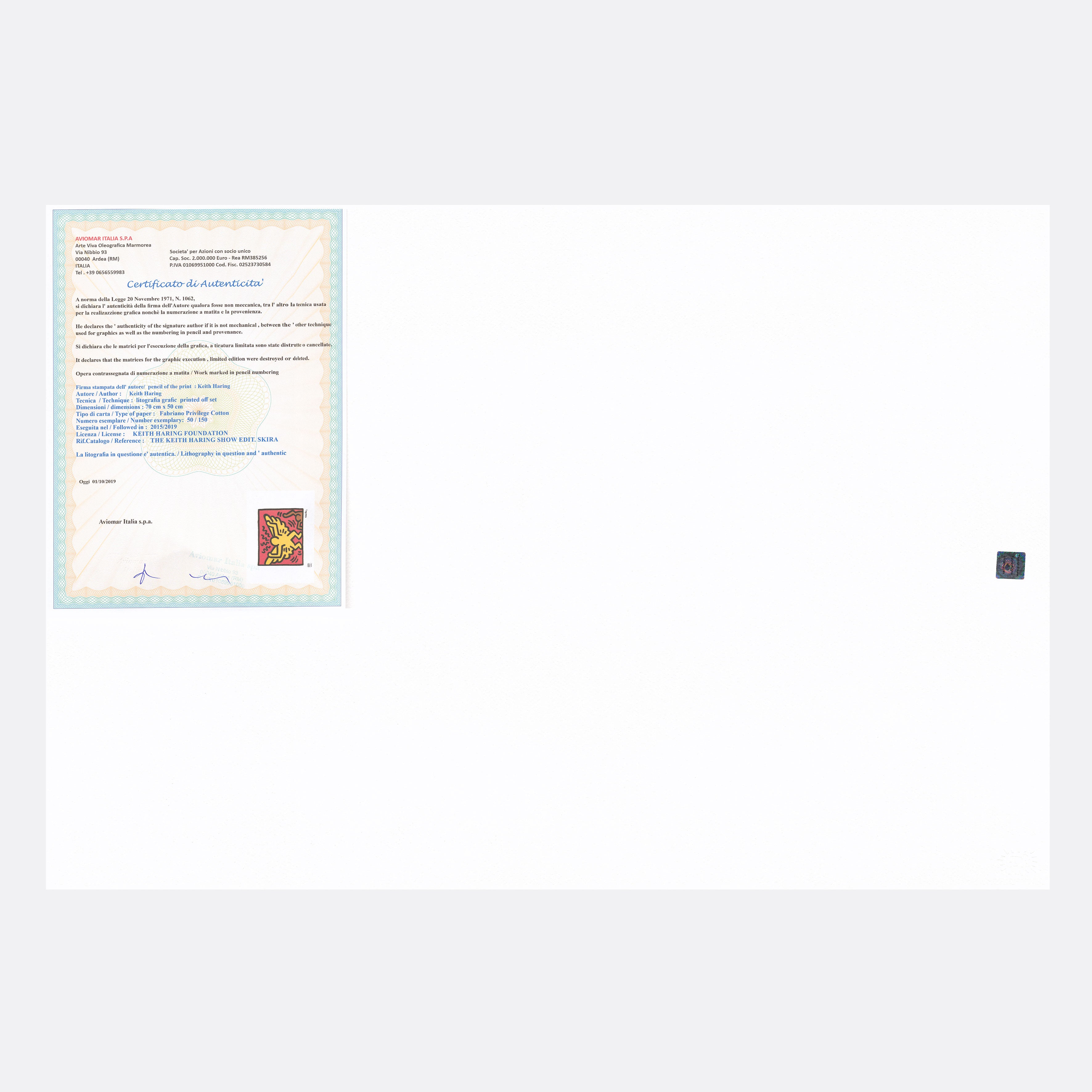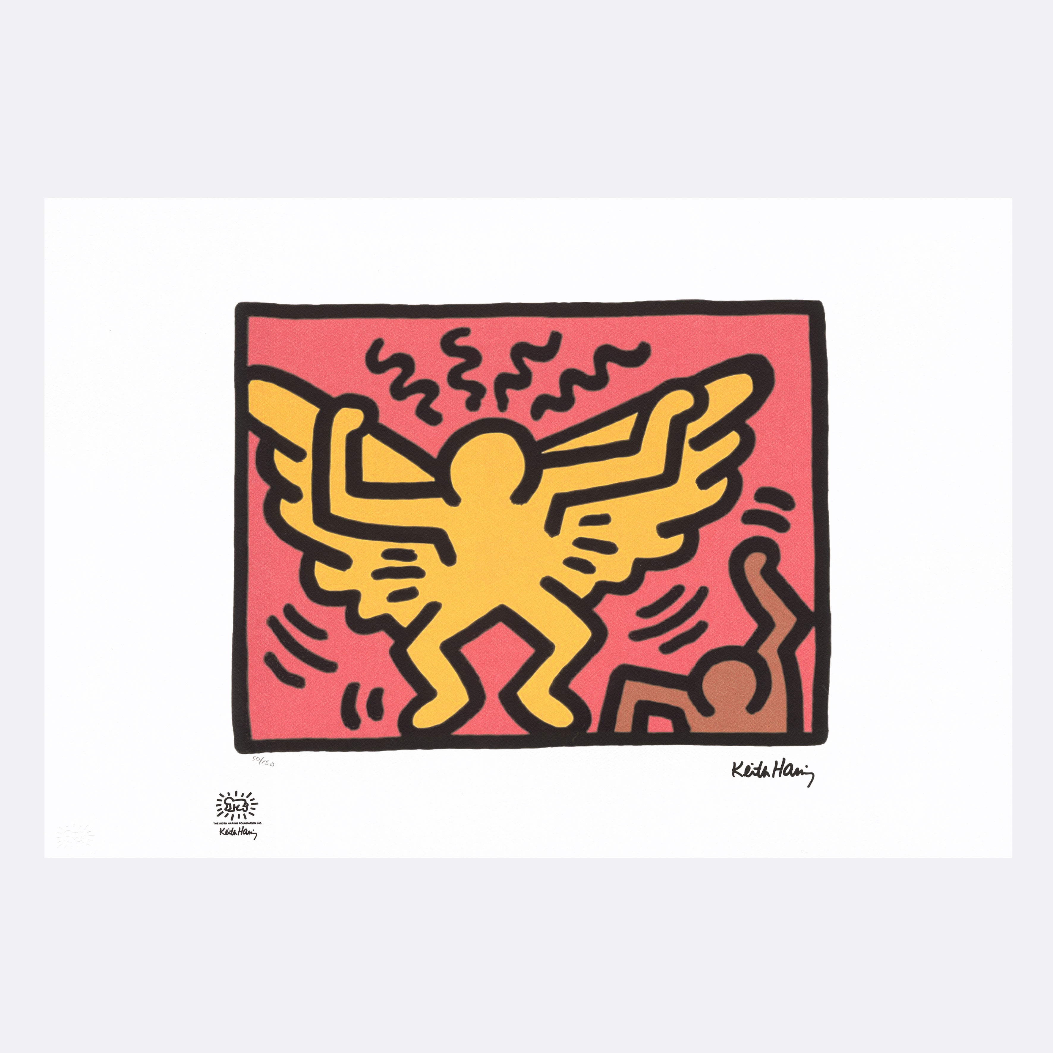 Certifikovaný grafický list, 50 x 70 cm. Číslováno 50/150. Certifikát, slepotisk a licence KEITH HARING FOUNDATION, ruční papír Fabriano Privilege Cotton. Signováno vpravo dole Keith Haring.
