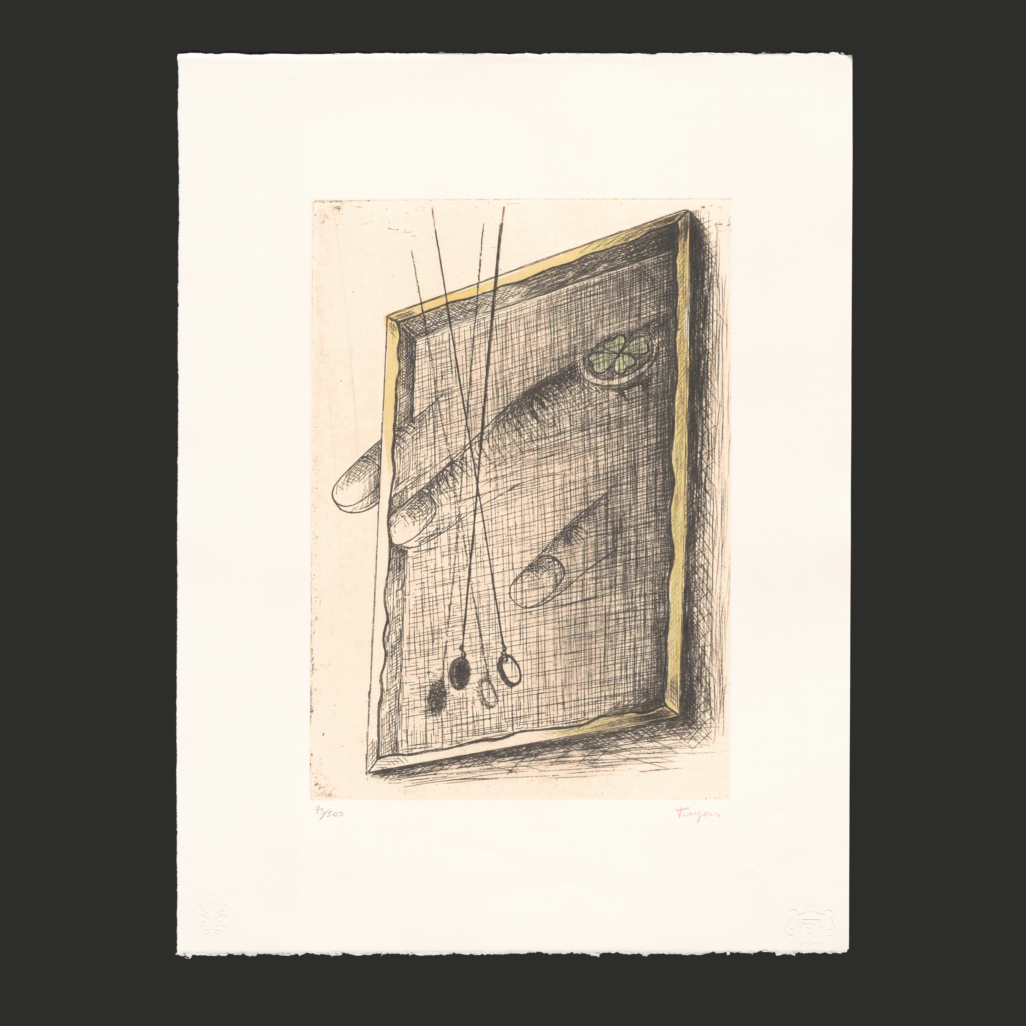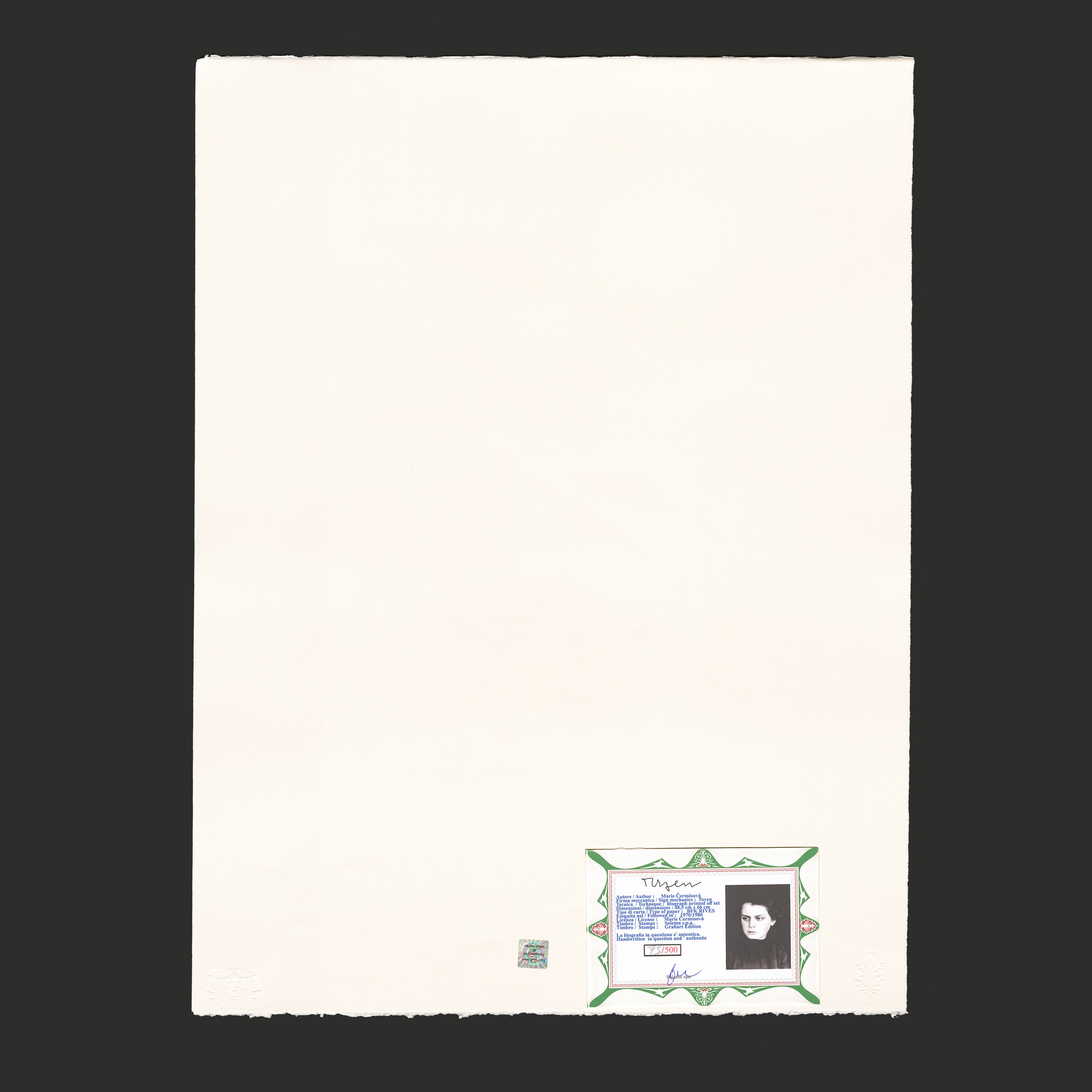 Certifikovaný grafický list, 47,7 x 66,5 cm. Číslováno 44/500. Certifikát, ruční papír BFK RIVES. Signováno vpravo dole Toyen. Slepotiskové razítko: Solema s.p.a., Grafiart Edition.