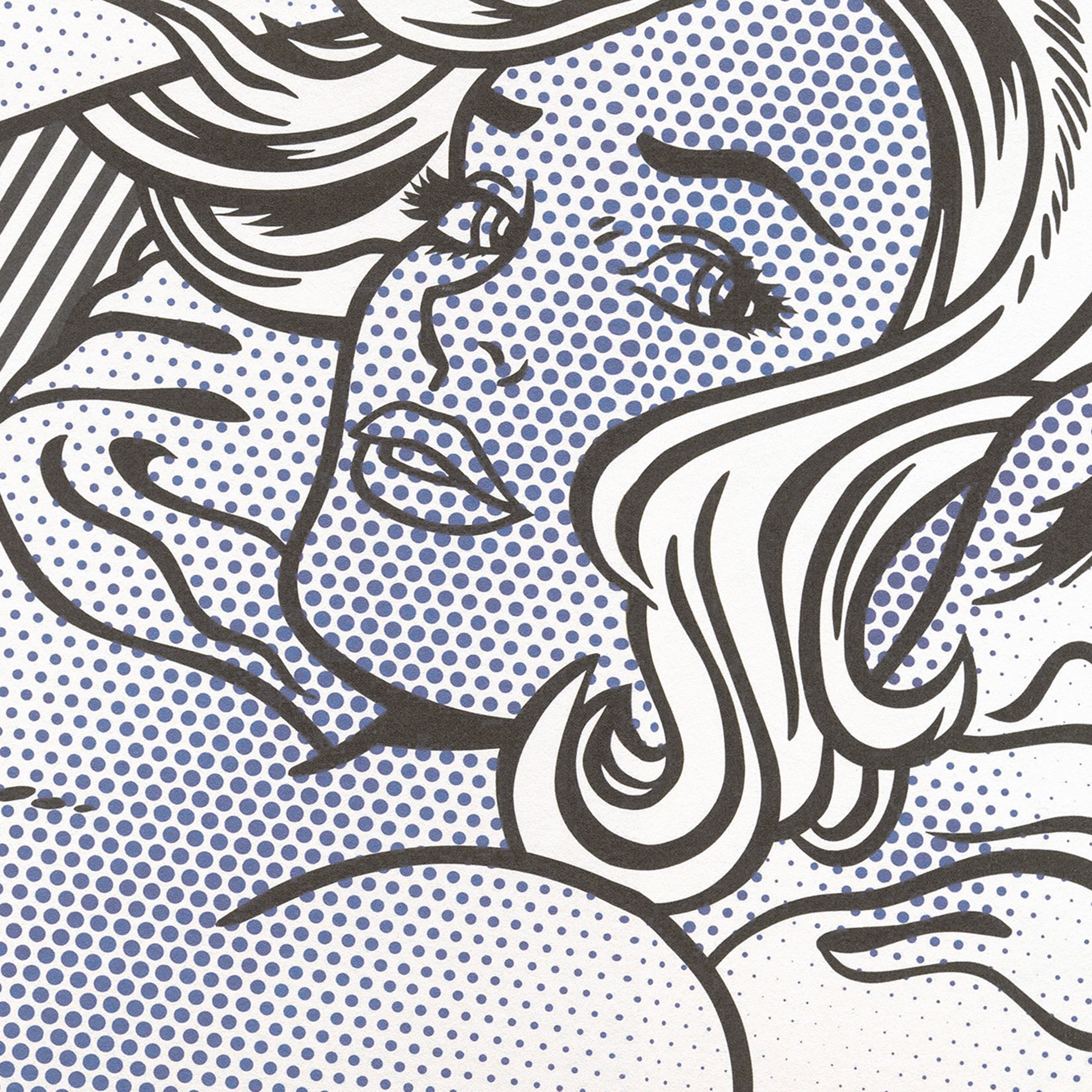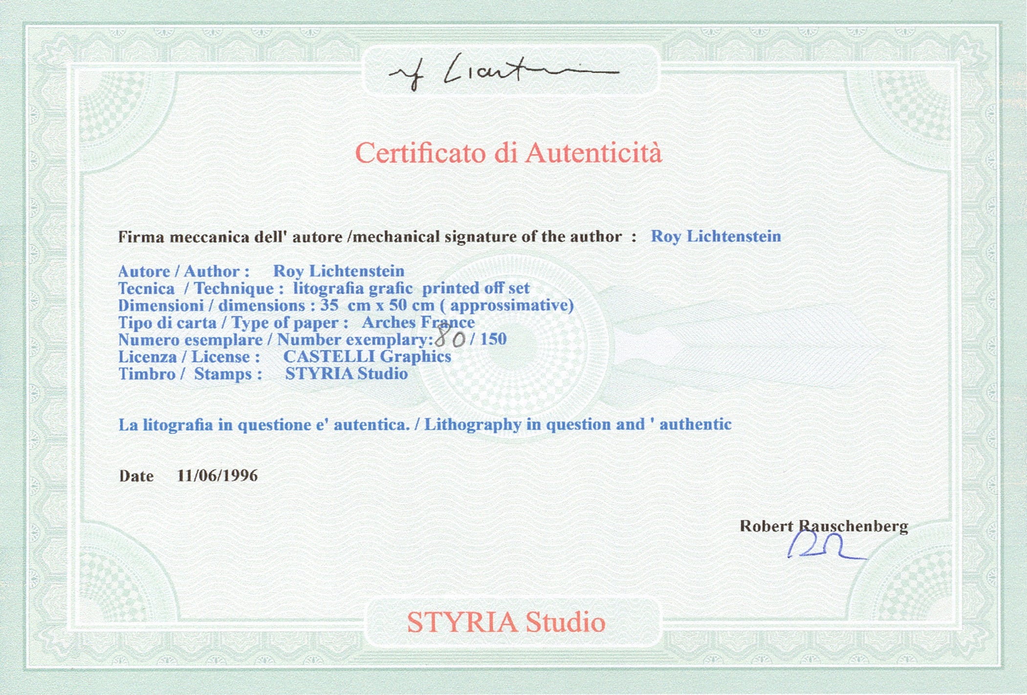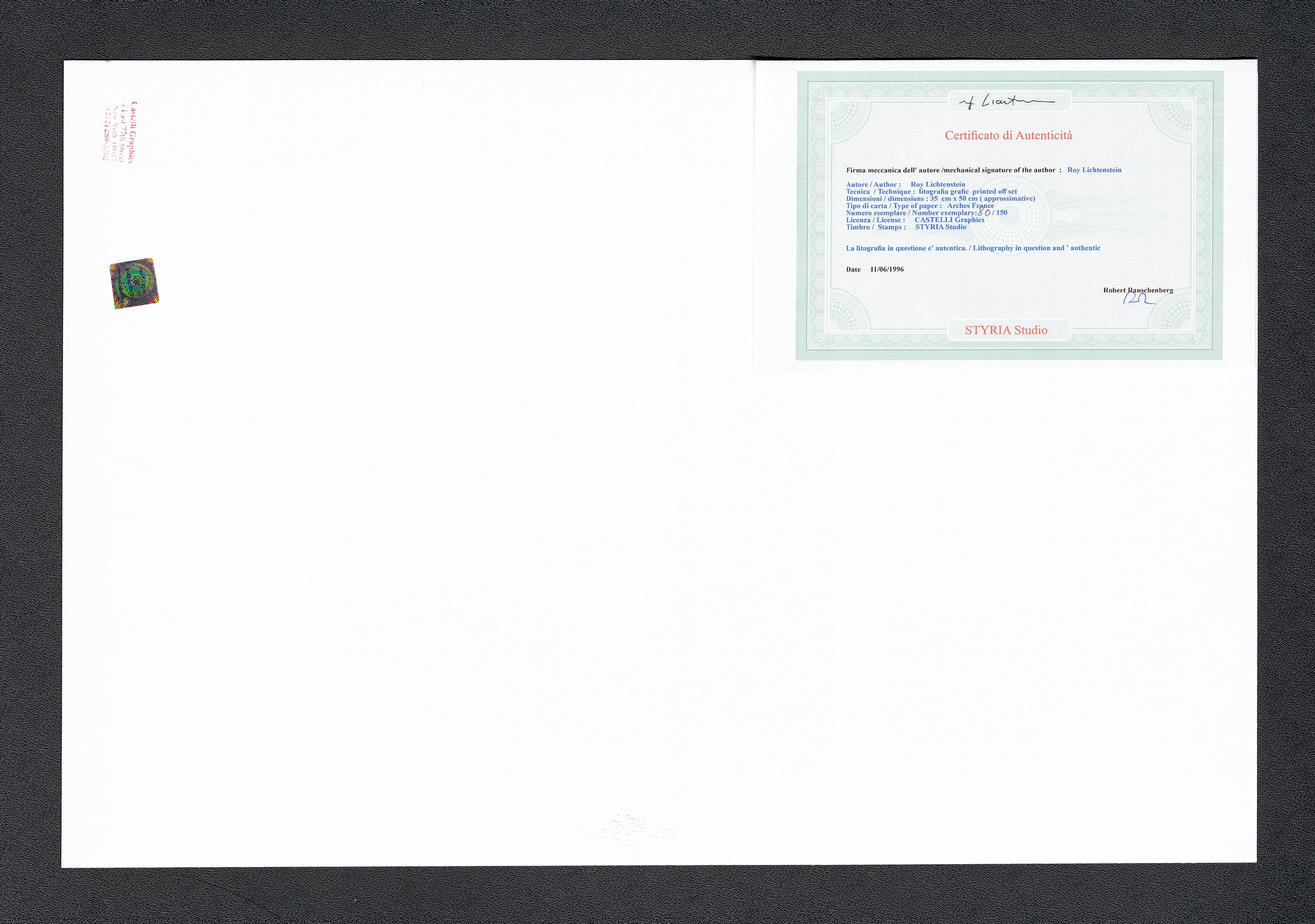 Certifikovaný grafický list, 35 x 50 cm. Certifikát, slepotisk STYRIA Studio, ruční papír Arches France. Signováno vpravo dole Roy Lichtenstein ©. Na zadní straně razítko: CASTELLI Graphics.