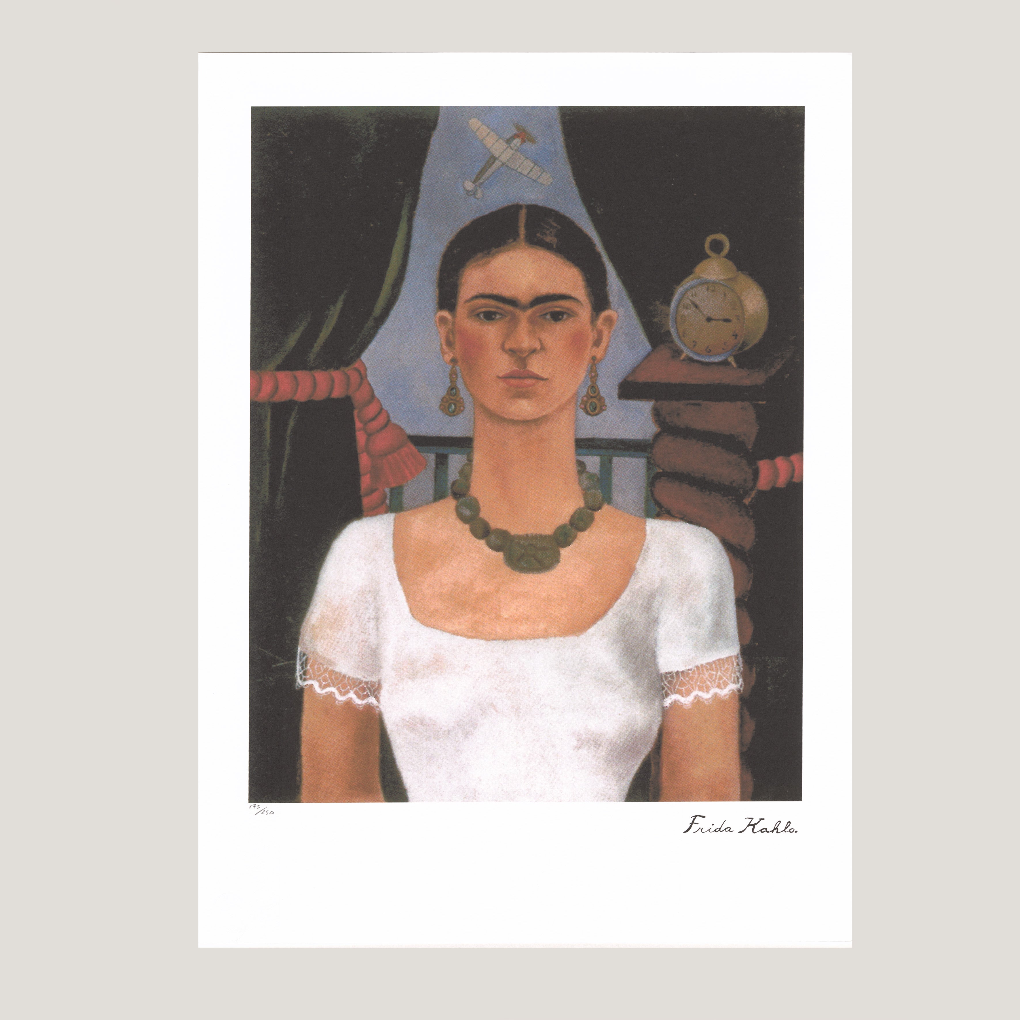 Grafický list 50x70 cm v limitovaném nákladu. Tisk č. 175/250. Slepotiskové razítko Leonardo Artis. Volný list. Certifikát, ruční papír Arches. Licence: Frida Kahlo Museum. Editor: Oro Cartier Limited Editions