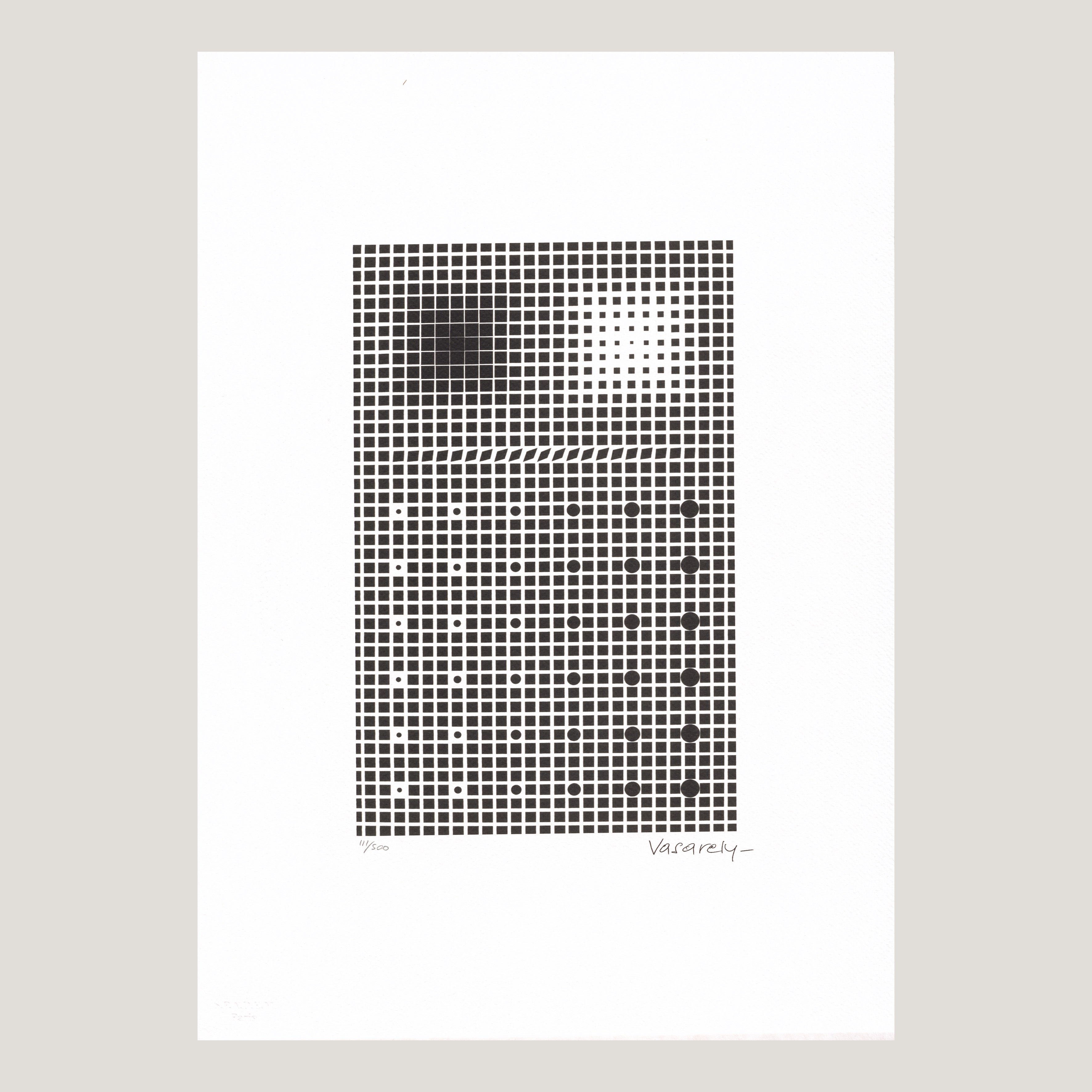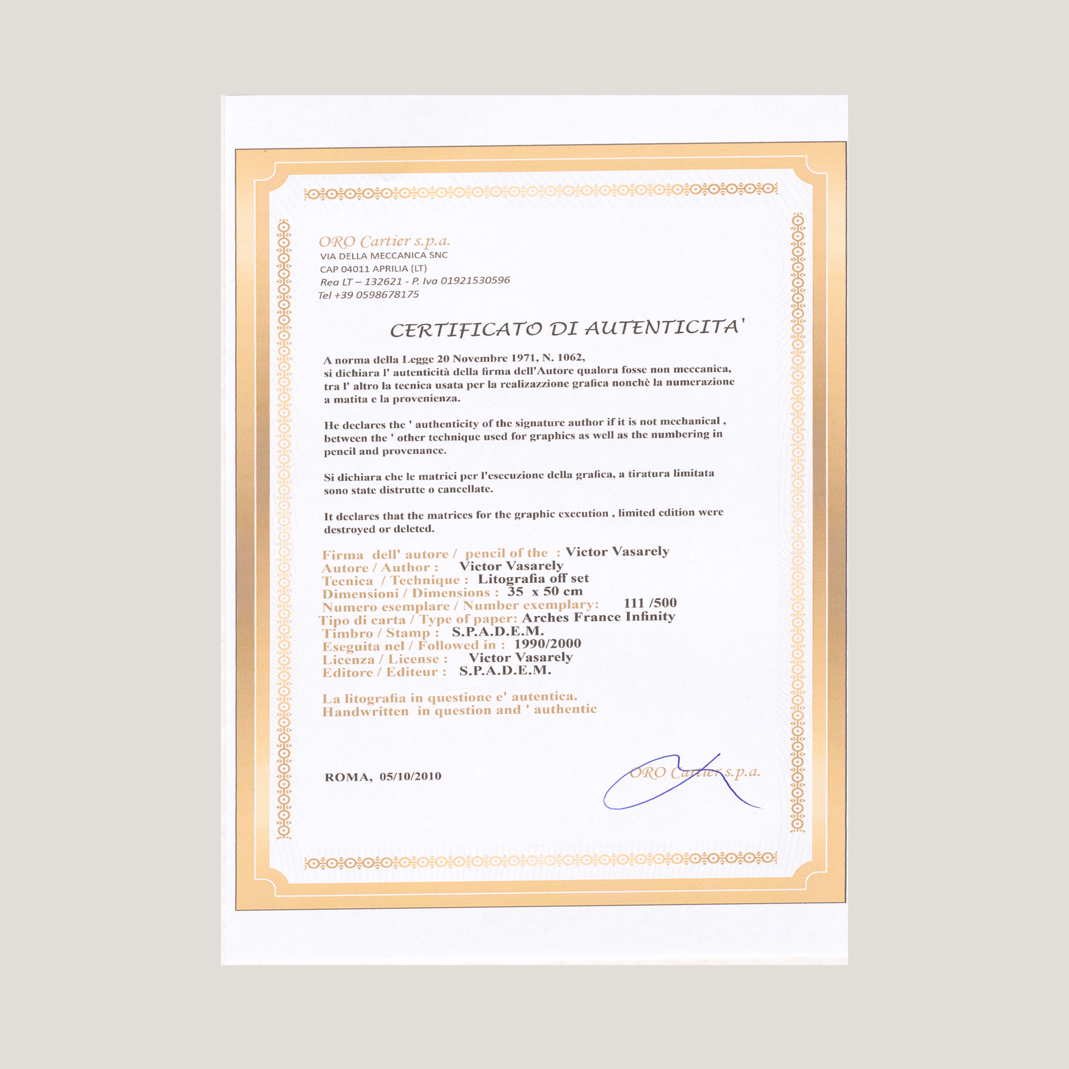 Grafický list 35x50 cm v limitovaném nákladu. Tisk č. 111/500. Slepotiskové razítko S.P.A.D.E.M. Volný list. Certifikát, ruční papír Arches France Infinity. Licence: Victor Vasarely Museum. Editor: S.P.A.D.E.M.
