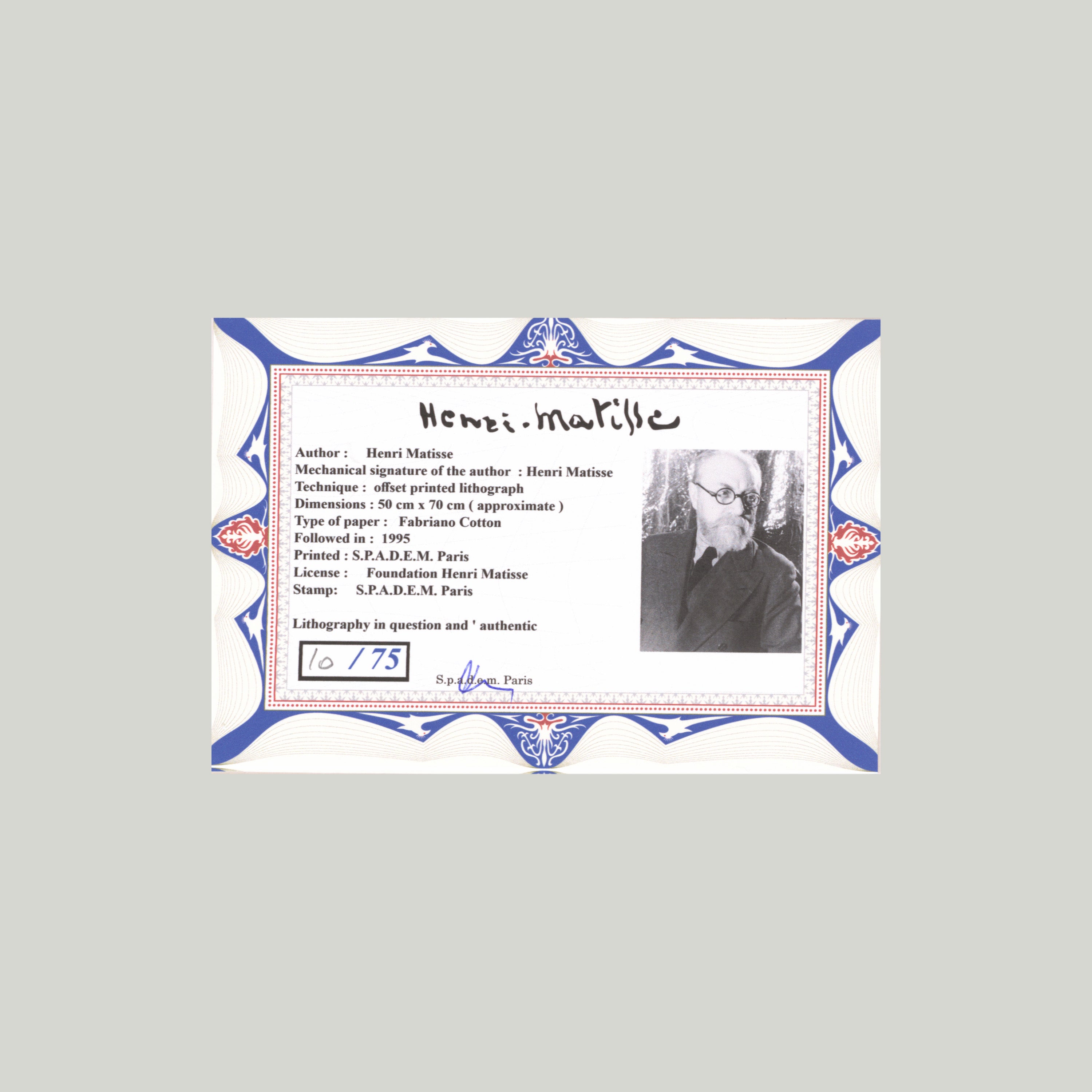 Certifikovaný grafický list, 50x70 cm. Číslováno 10/75. Certifikát, ruční papír Fabriano Cotton. Signováno vpravo dole Henri Matisse. Slepotisk S.P.A.D.E.M. Paris. Číslováno tužkou