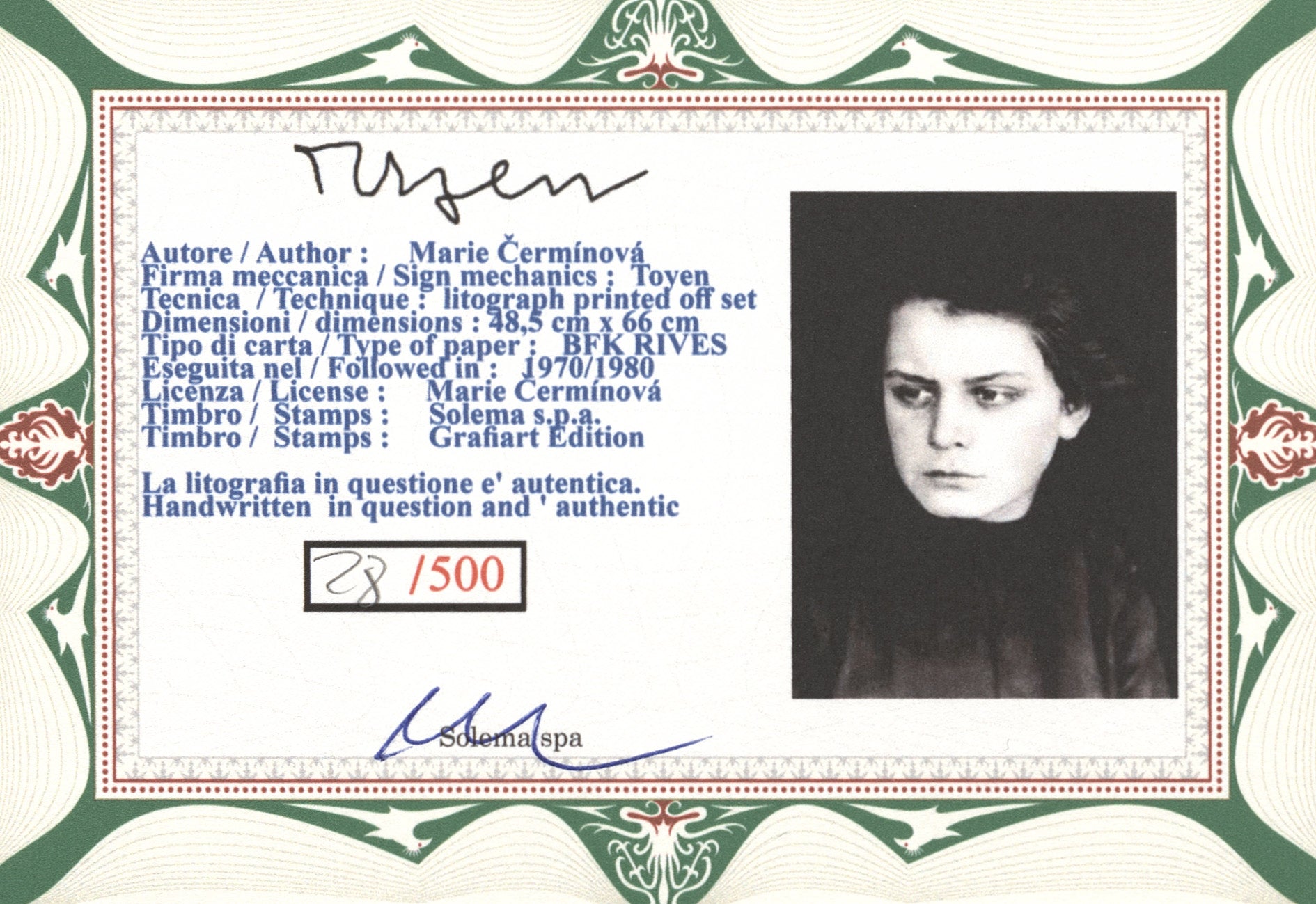 Certifikovaný grafický list, 47,7 x 66,5 cm. Číslováno 28/500. Certifikát, ruční papír BFK RIVES. Signováno vpravo dole Toyen. Slepotiskové razítko: Solema s.p.a., Grafiart Edition.