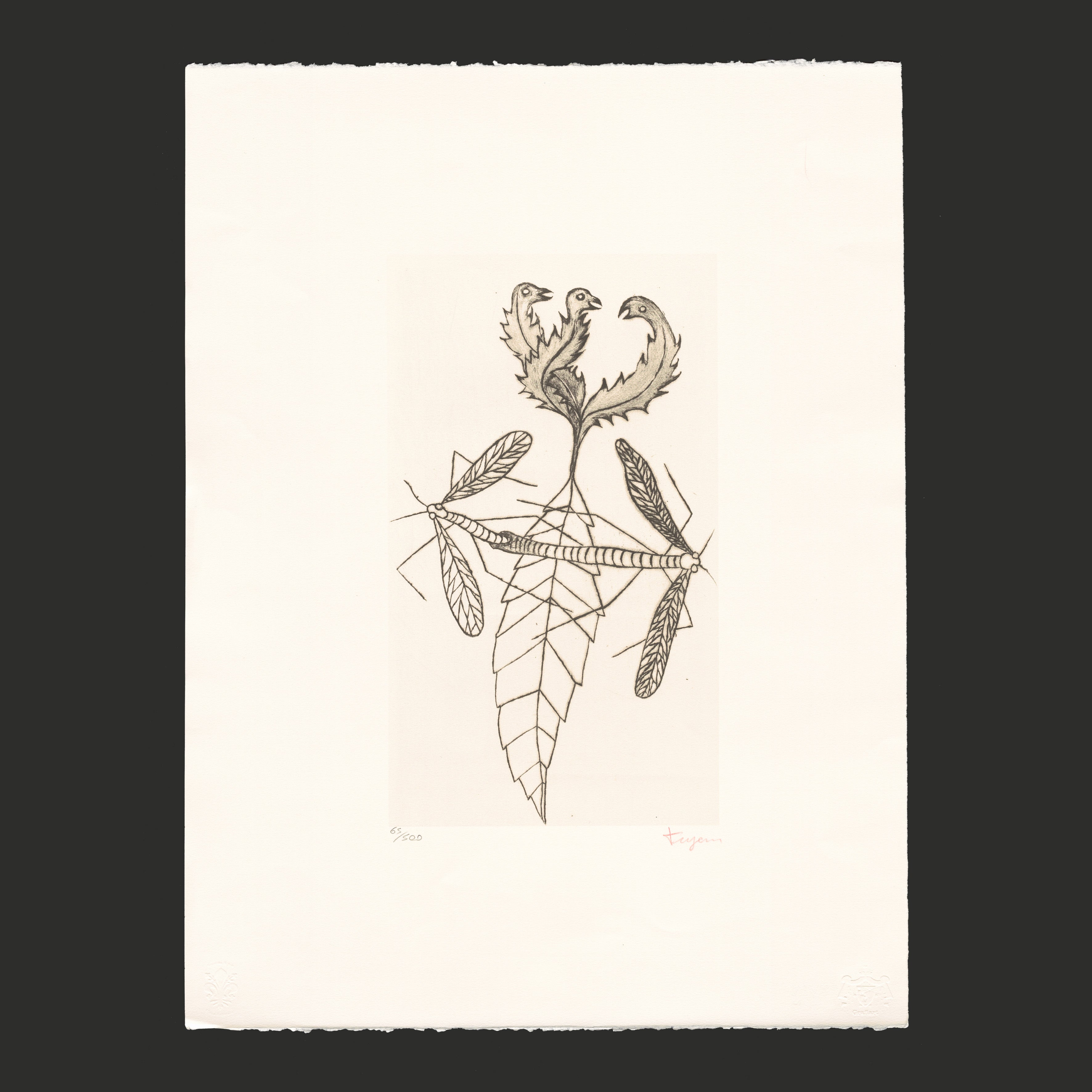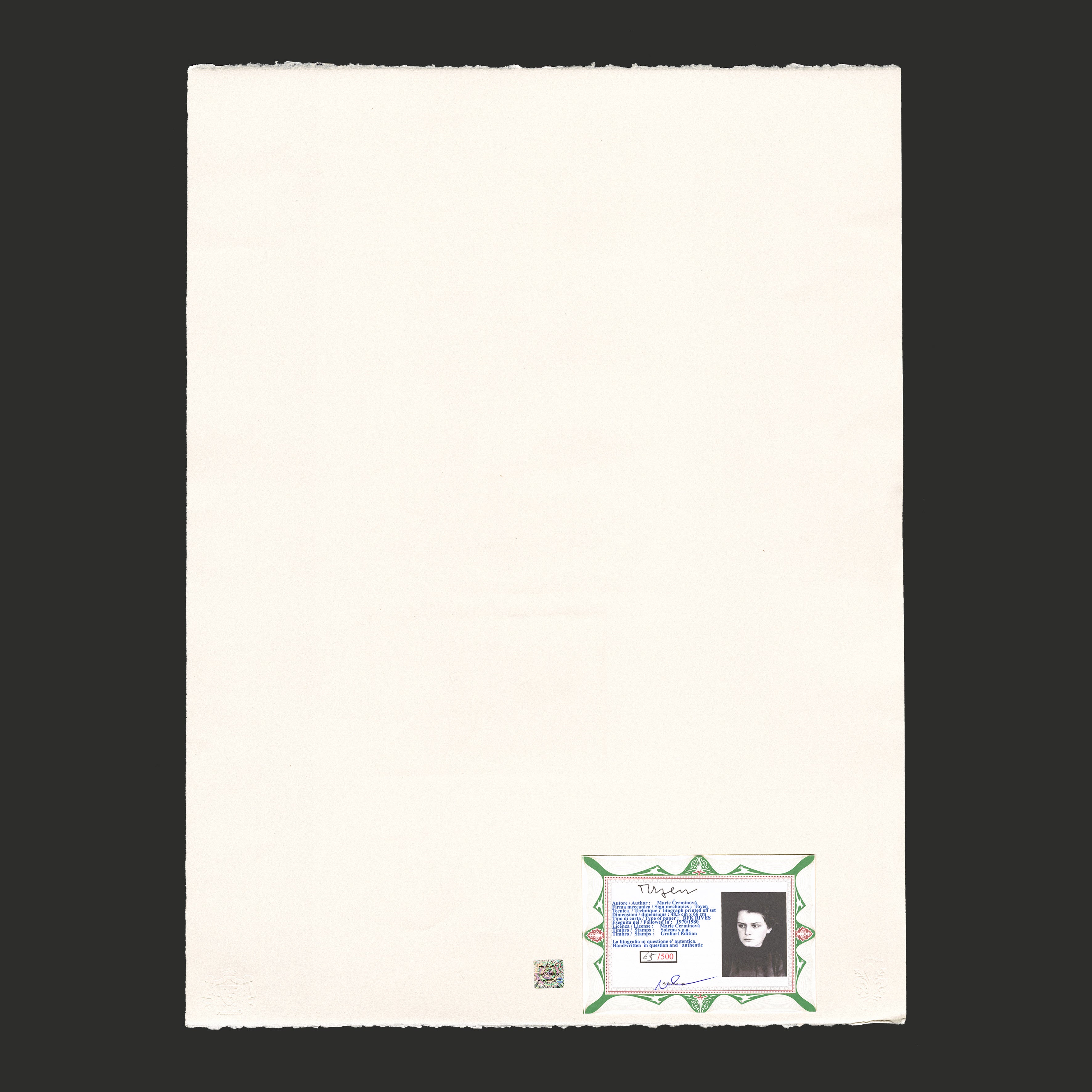 Certifikovaný grafický list, 47,7 x 66,5 cm. Číslováno 65/500. Certifikát, ruční papír BFK RIVES. Signováno vpravo dole Toyen. Slepotiskové razítko: Solema s.p.a., Grafiart Edition.