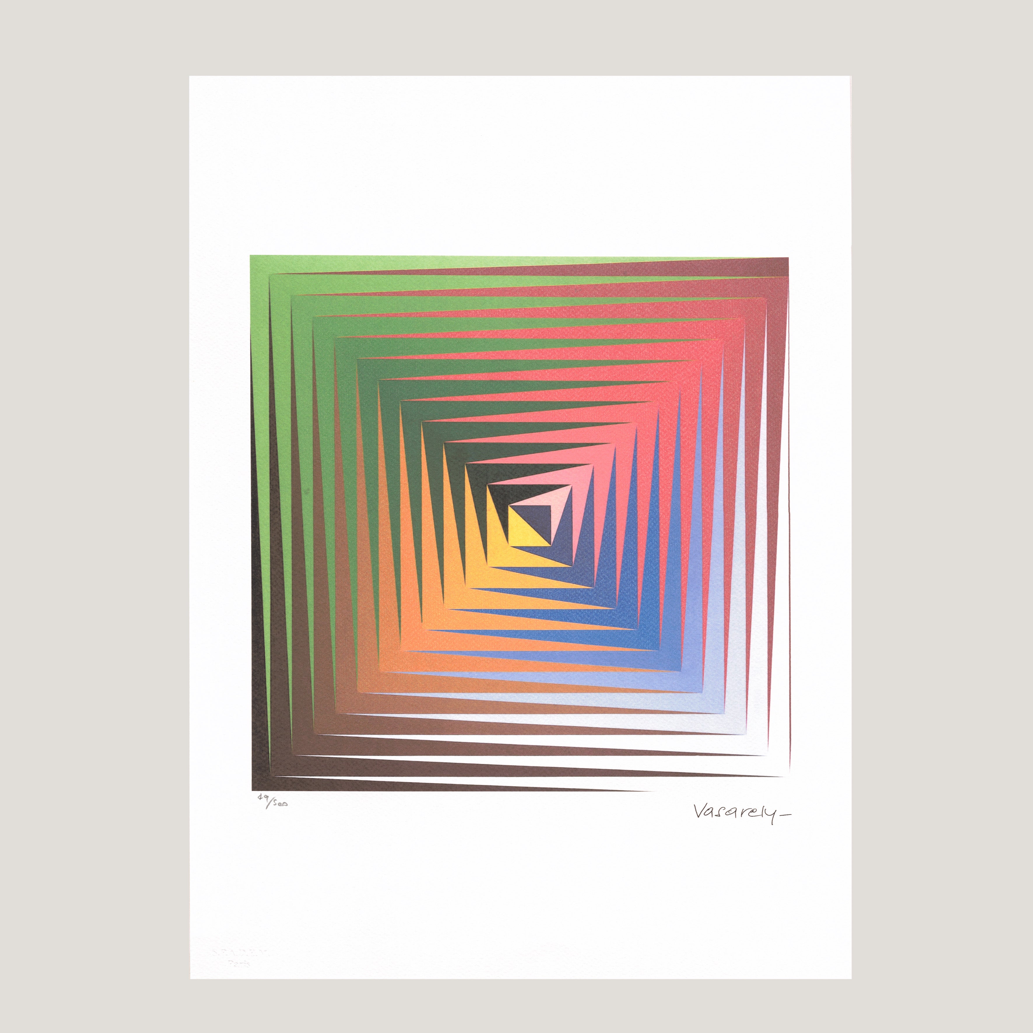 Grafický list 35x50 cm v limitovaném nákladu. Tisk č. 79/500. Slepotiskové razítko S.P.A.D.E.M. Volný list. Certifikát, ruční papír Arches France Infinity. Licence: Victor Vasarely Museum. Editor: S.P.A.D.E.M.