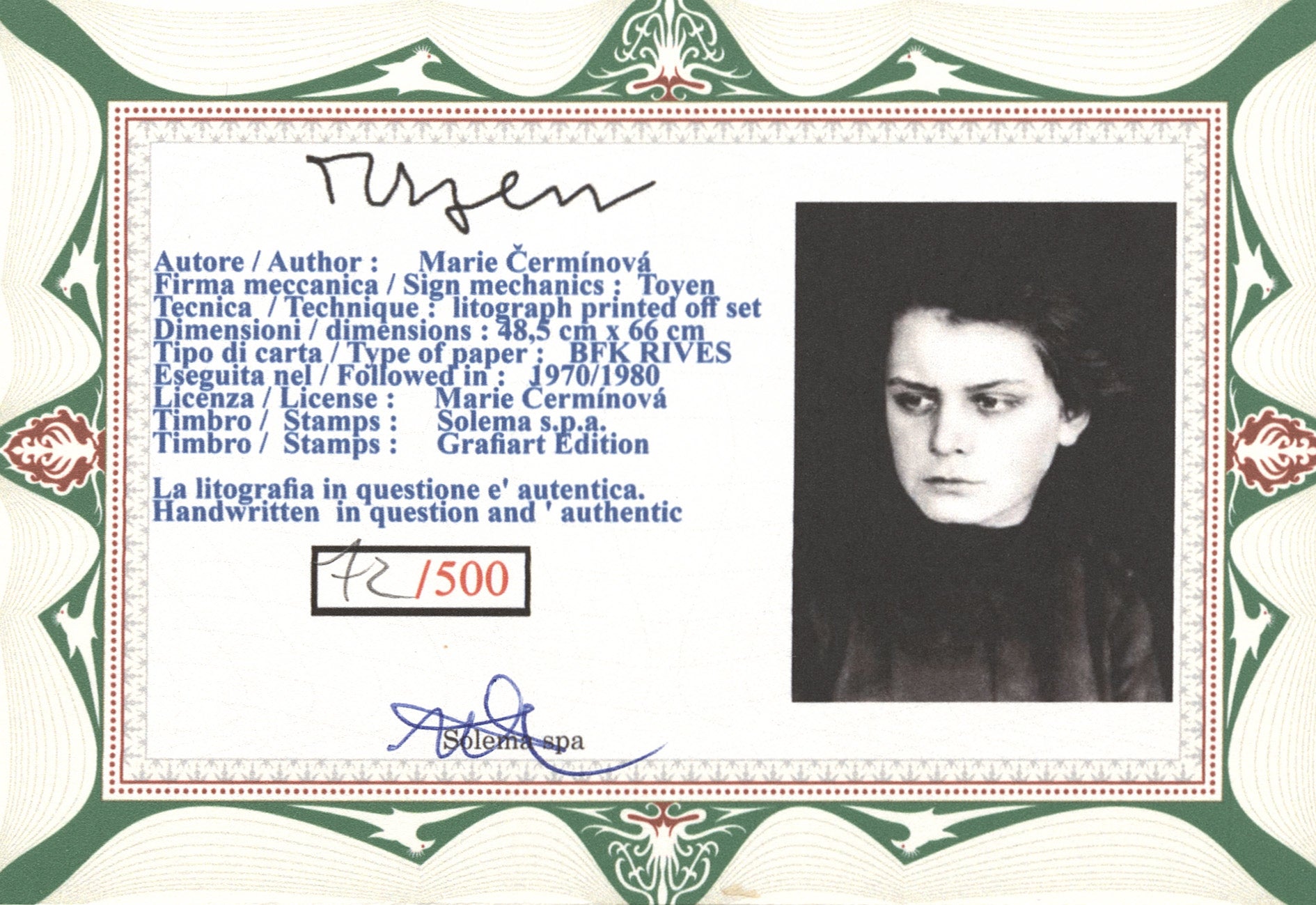 Certifikovaný grafický list, 47,7 x 66,5 cm. Číslováno 72/500. Certifikát, ruční papír BFK RIVES. Signováno vpravo dole Toyen. Slepotiskové razítko: Solema s.p.a., Grafiart Edition.