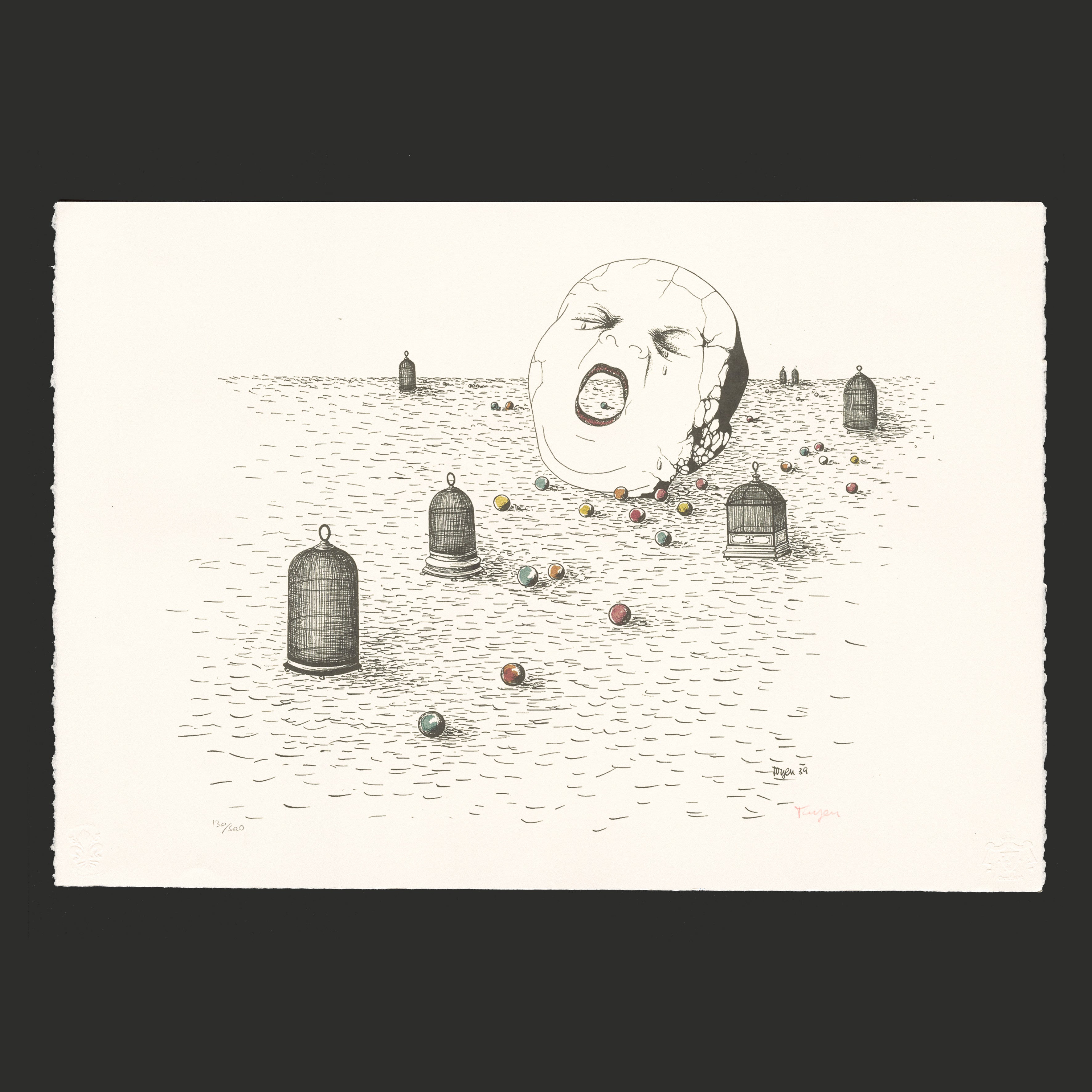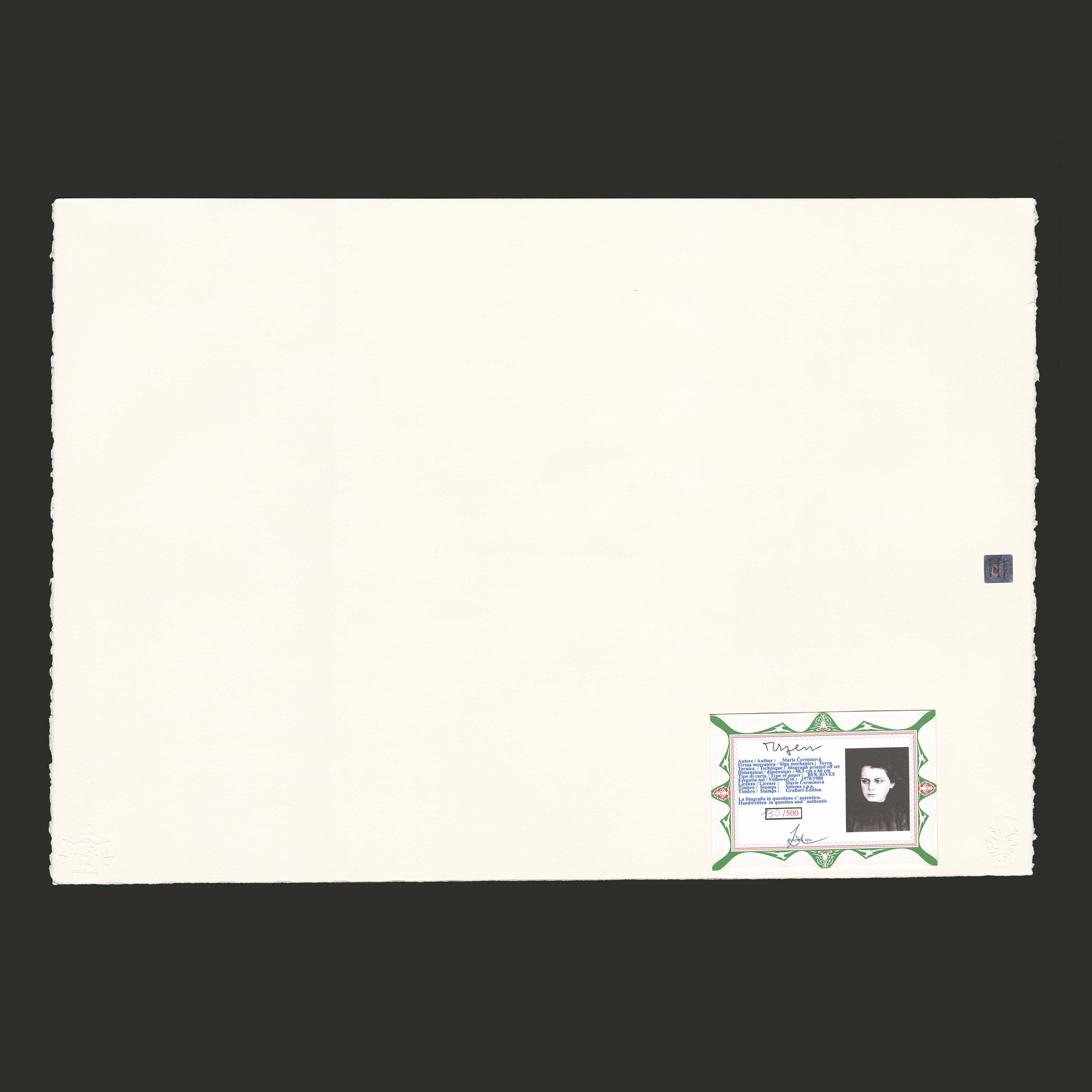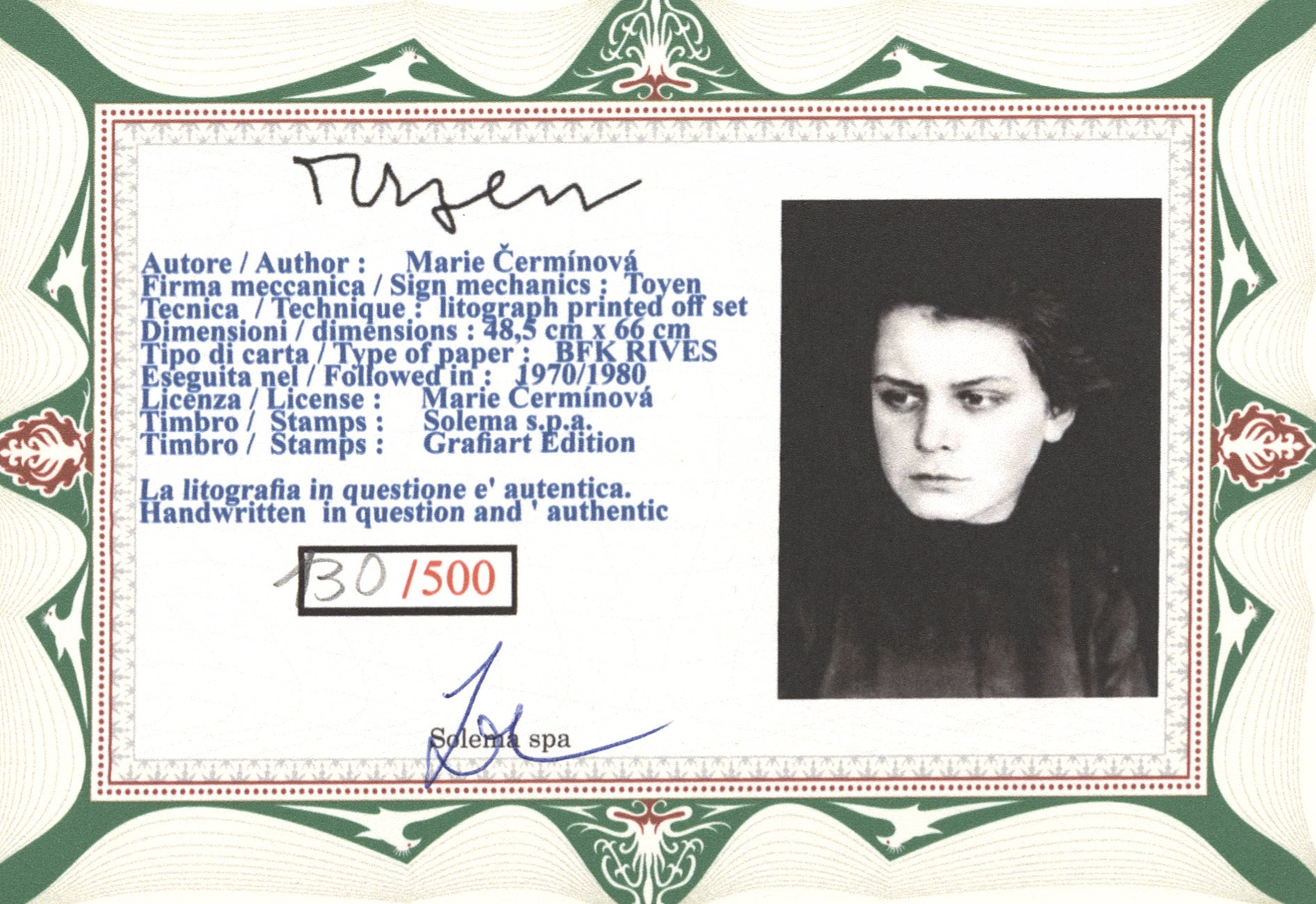 Certifikovaný grafický list, 47,7 x 66,5 cm. Číslováno 130/500. Certifikát, ruční papír BFK RIVES. Signováno vpravo dole Toyen. Slepotiskové razítko: Solema s.p.a., Grafiart Edition.