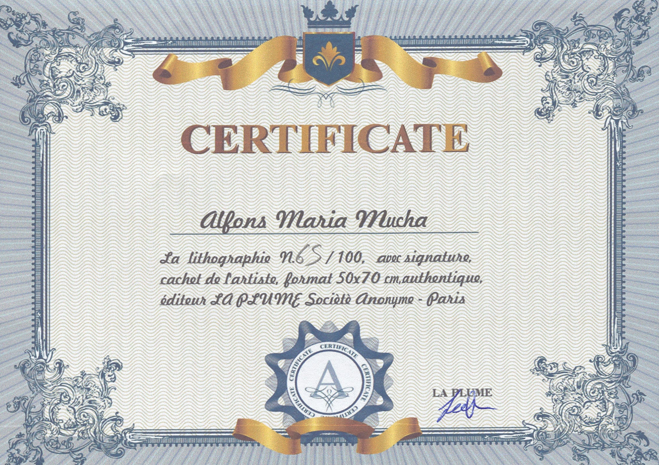 Certifikovaný grafický list, 50 x 70 cm. Číslováno, certifikát, ruční papír. Signováno vpravo dole A. Mucha. LA PLUME Societe Anonyme - Paris. Číslo konkrétního grafického listu se může lišit od uvedeného vyobrazení.