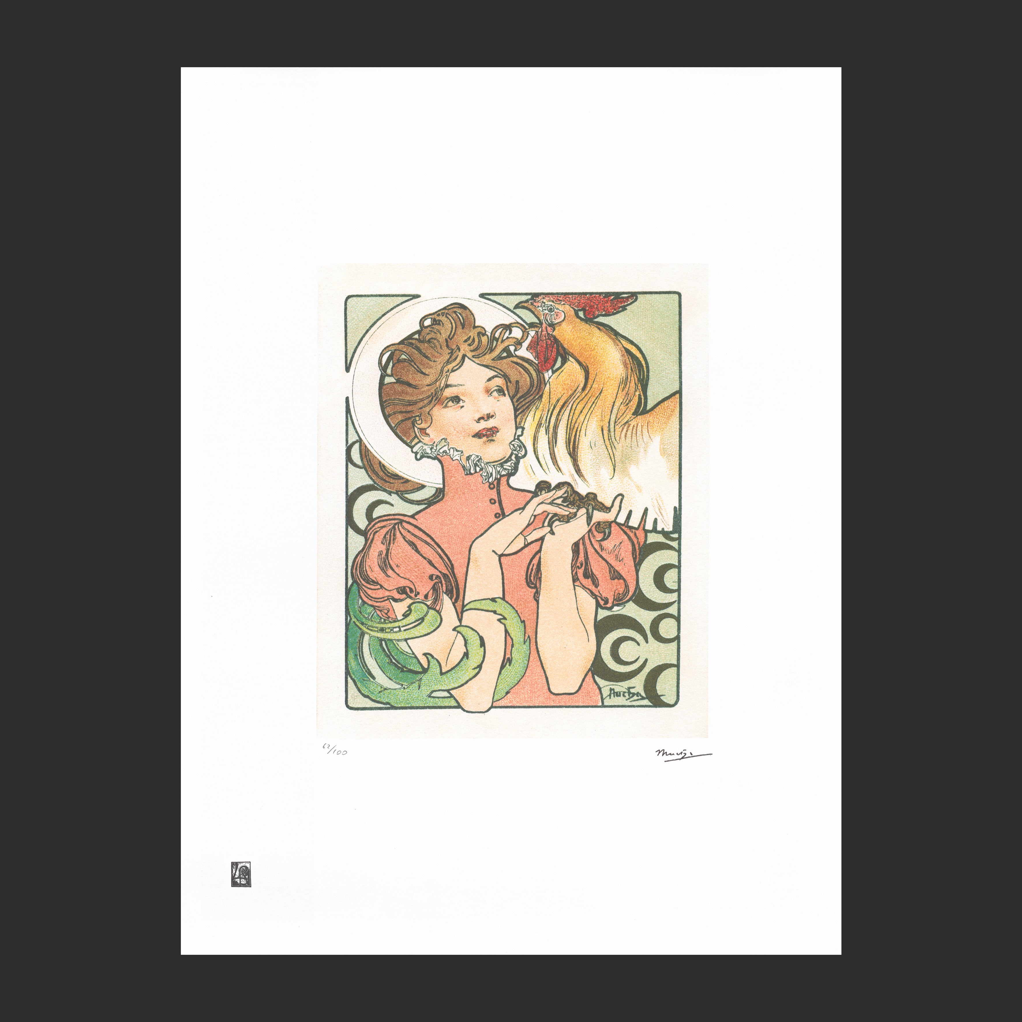 Certifikovaný grafický list, 50 x 70 cm. Číslováno, certifikát, ruční papír. Signováno vpravo dole A. Mucha. LA PLUME Societe Anonyme - Paris. Číslo konkrétního grafického listu se může lišit od uvedeného vyobrazení.