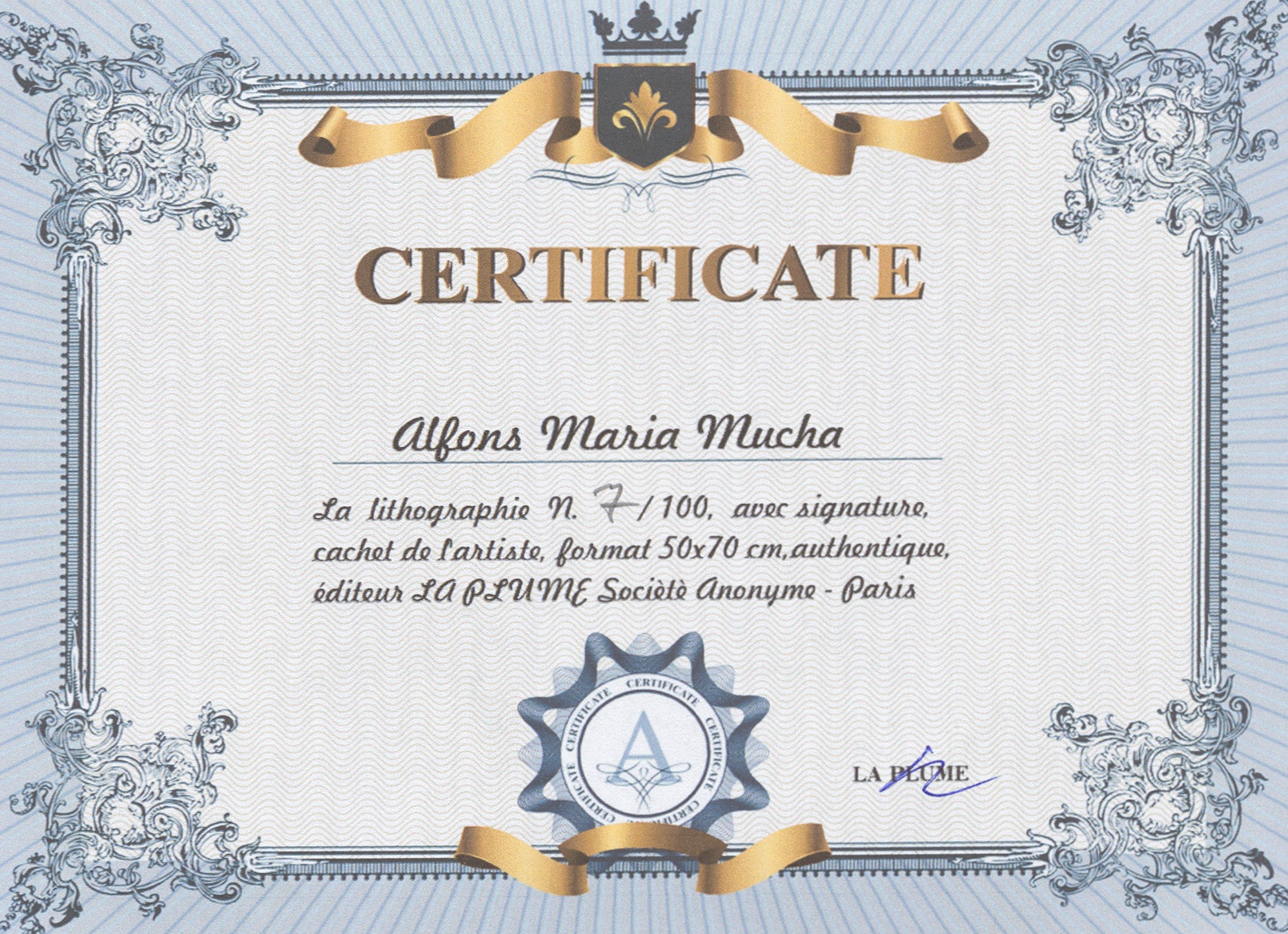 Certifikovaný grafický list, 50 x 70 cm. Číslováno, certifikát, ruční papír. Signováno vpravo dole A. Mucha. LA PLUME Societe Anonyme - Paris. Číslo konkrétního grafického listu se může lišit od uvedeného vyobrazení.