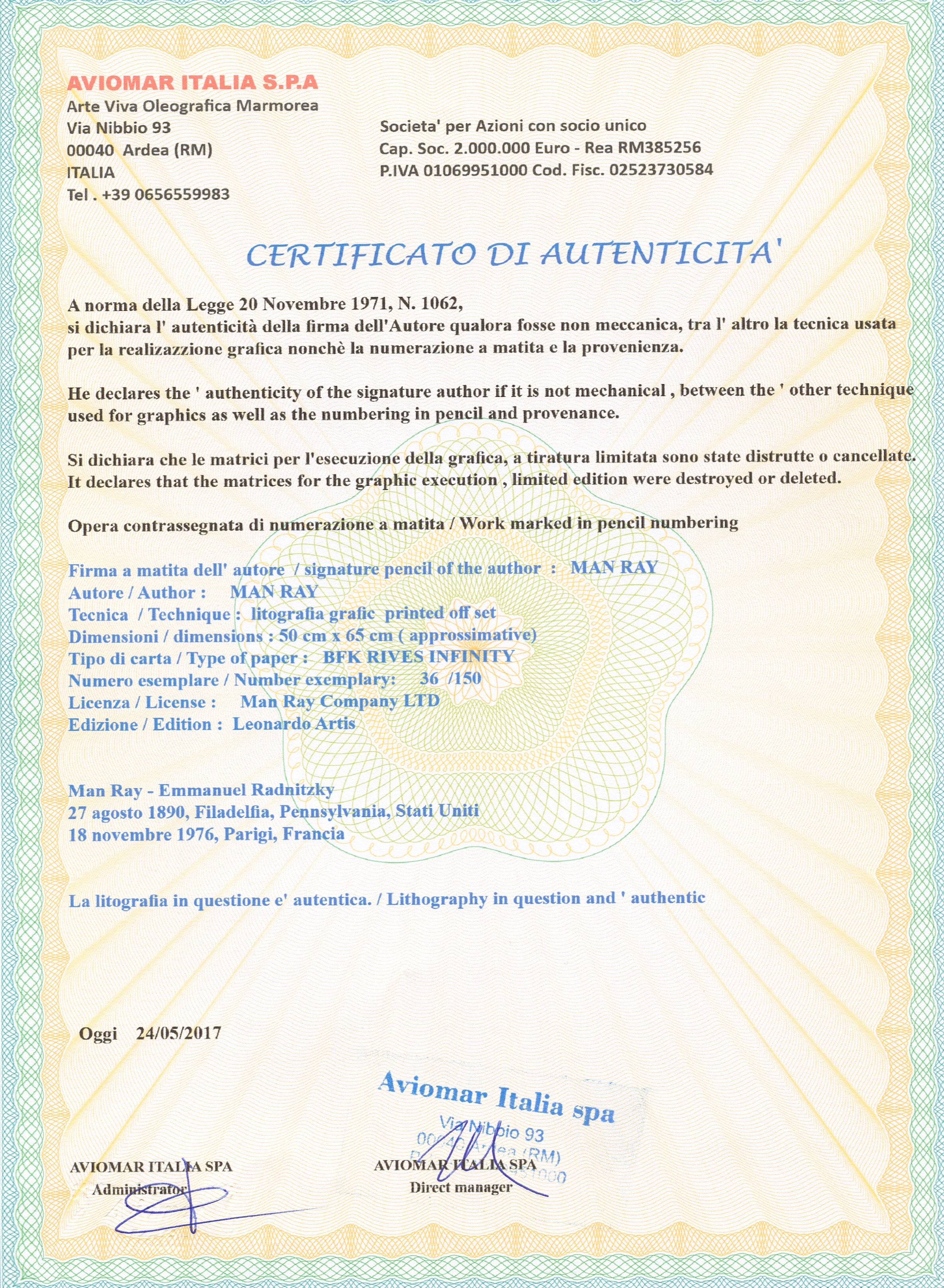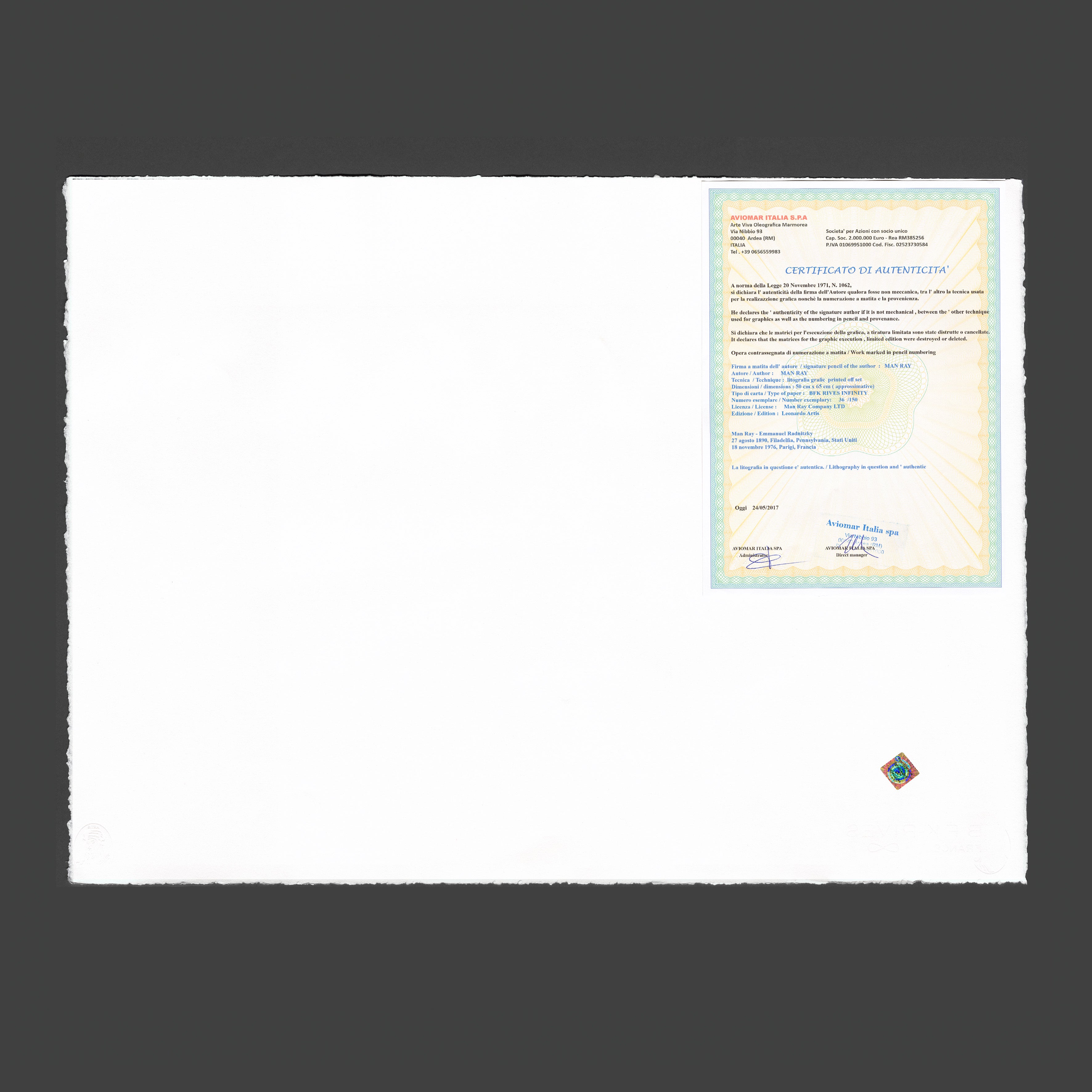Man Ray (1890-1976) byl americký malíř, fotograf, tvůrce koláží a konstruovaných objektů, sochař i filmař. Patří mezi význačné představitele umělecké avantgardy 20. století. Narodil se v Americe a většinu své tvůrčí kariéry strávil ve Francii.