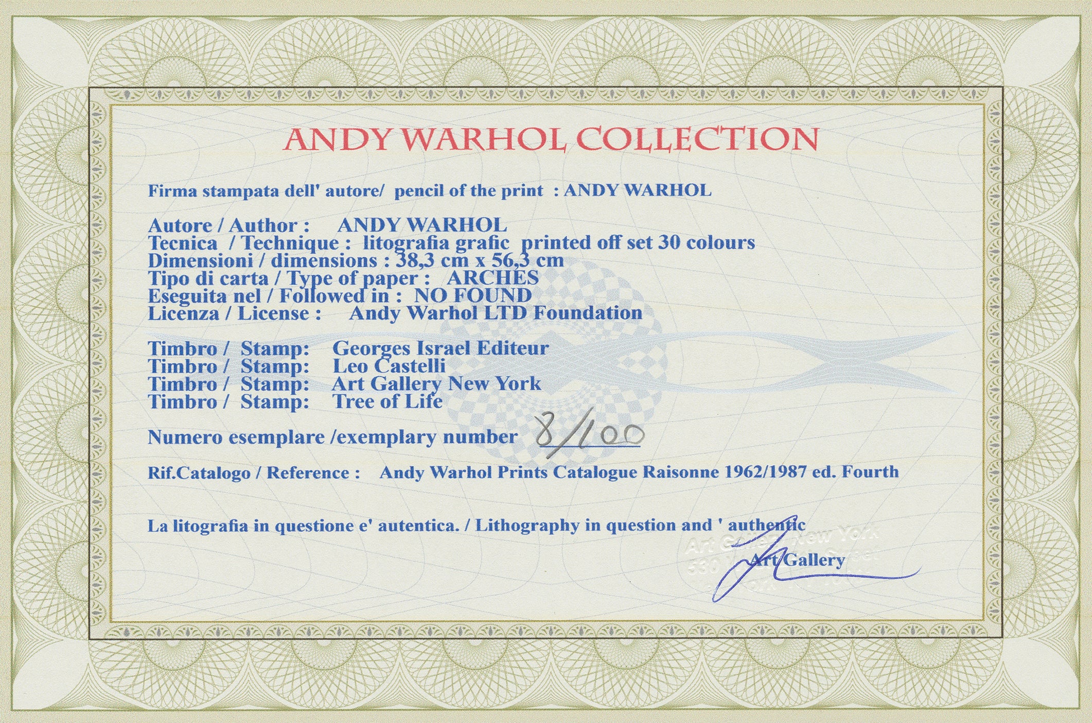 Certifikovaný grafický list, 38 x 56 cm. Číslováno 8/100, certifikát, slepotisk © ANDY WARHOL, ruční papír Fabriano Privilege. Signováno vpravo dole Andy Warhol. Na zadní straně razítka: ANDY WARHOL Factory.