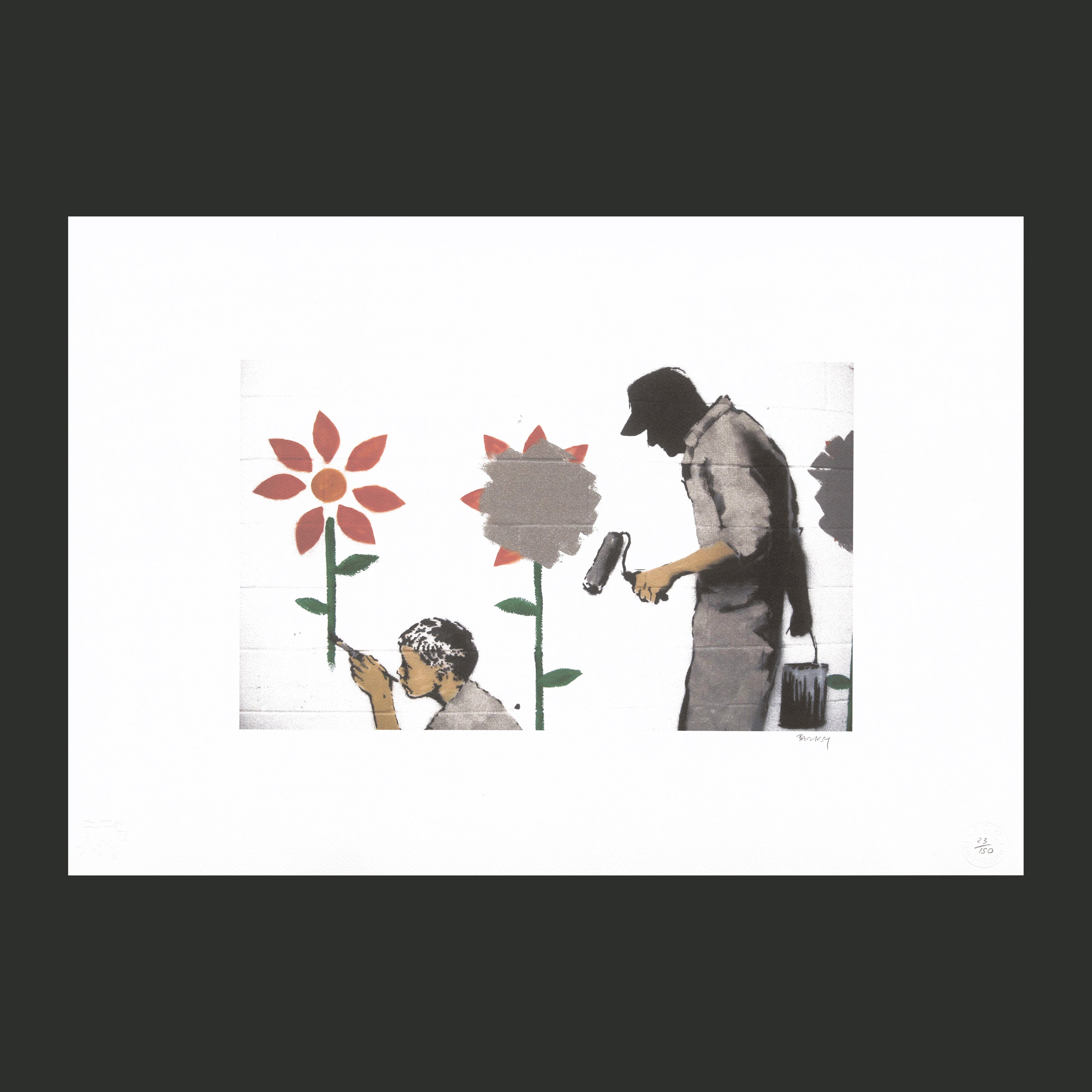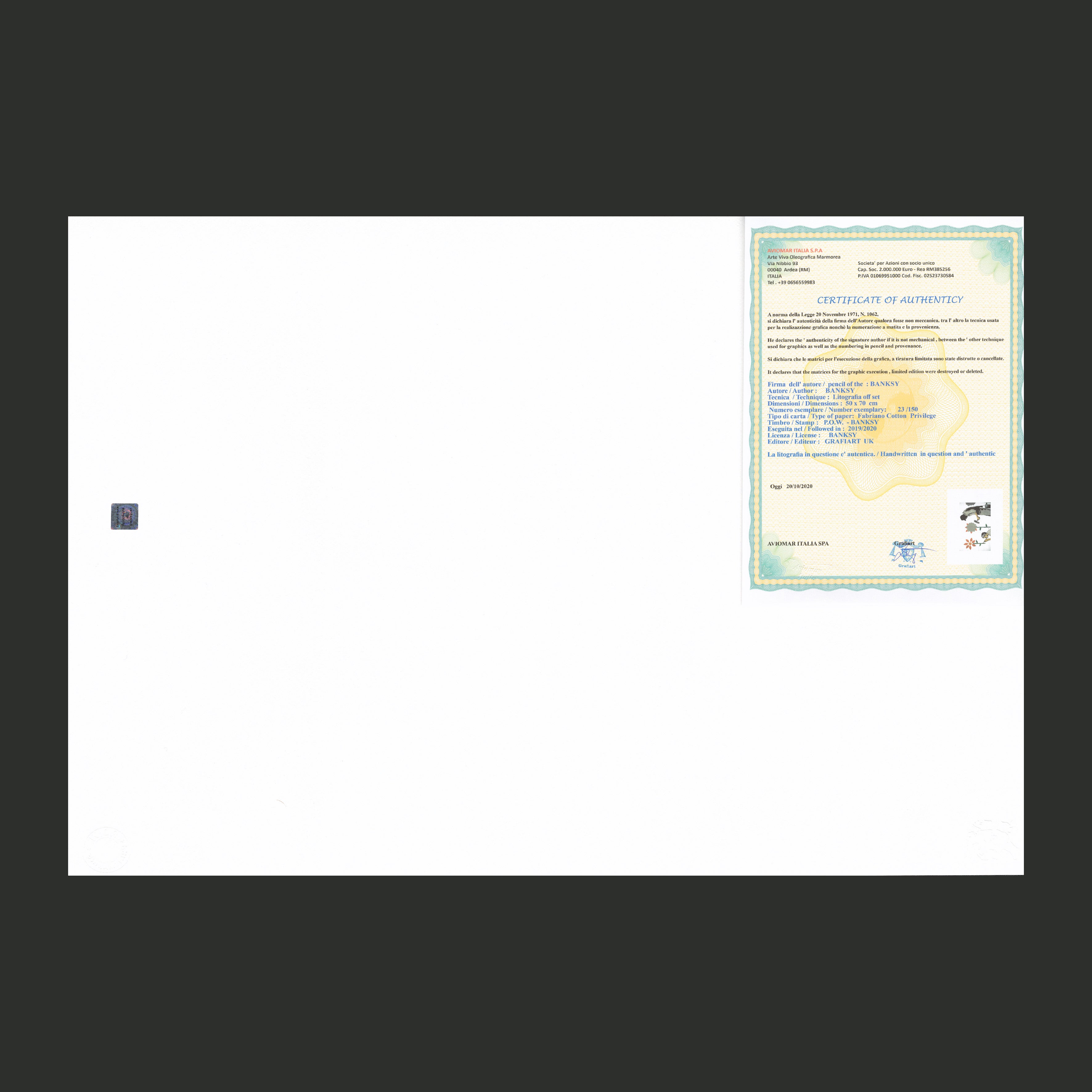 Grafický list, 50 x 70 cm. Číslováno, slepotisk P.O.W.-BANKSY, ruční papír Fabriano Cotton Privilege. Signováno vpravo dole BANKSY, certifikát. Číslo konkrétního grafického listu se může lišit od uvedeného vyobrazení.