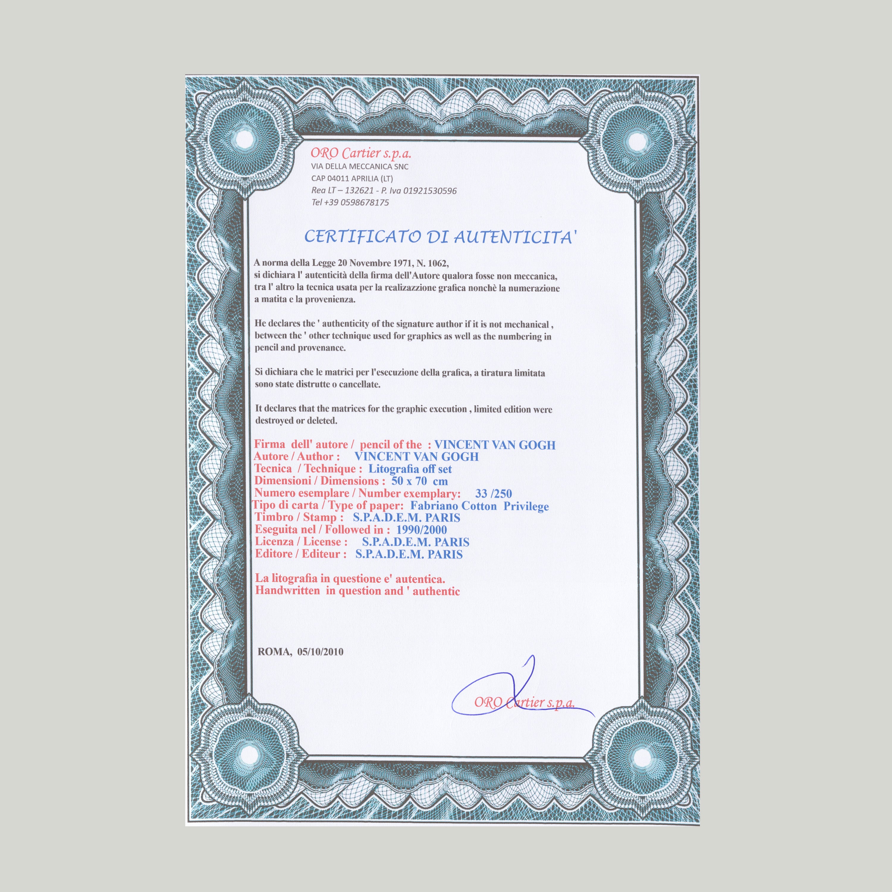 Certifikovaný grafický list, 50x70 cm. Číslováno 33/250. Certifikát, ruční papír Fabriano Cotton Privilege. Signováno vpravo dole Vincent van Gogh. Slepotisk S.P.A.D.E.M. Paris. Číslováno tužkou