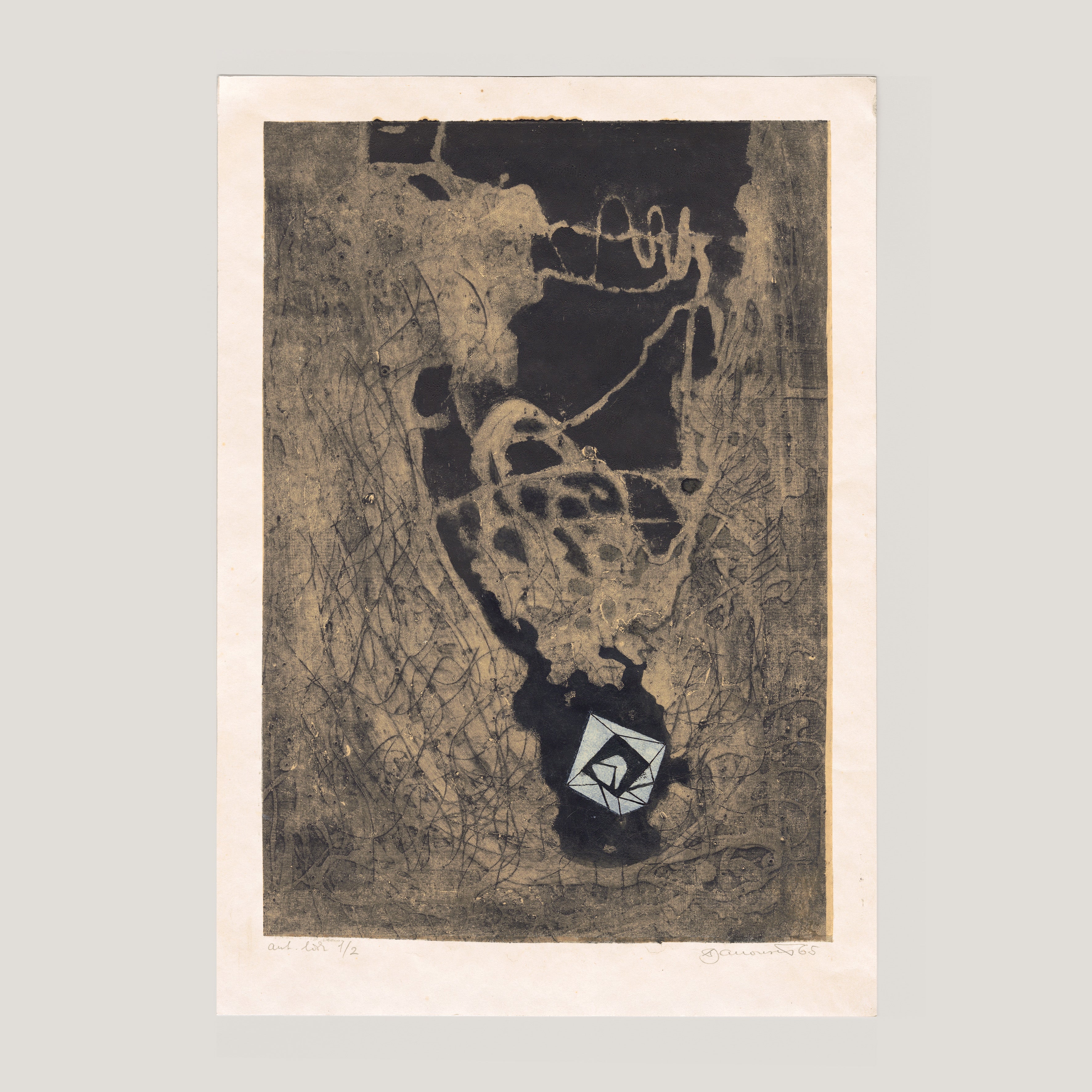 Kombinovaná technika. Tisková plocha 25x37 cm, grafický list 29x42,4 cm, signováno tužkou Dušan Janoušek 65, číslováno 1/2, volný list.
