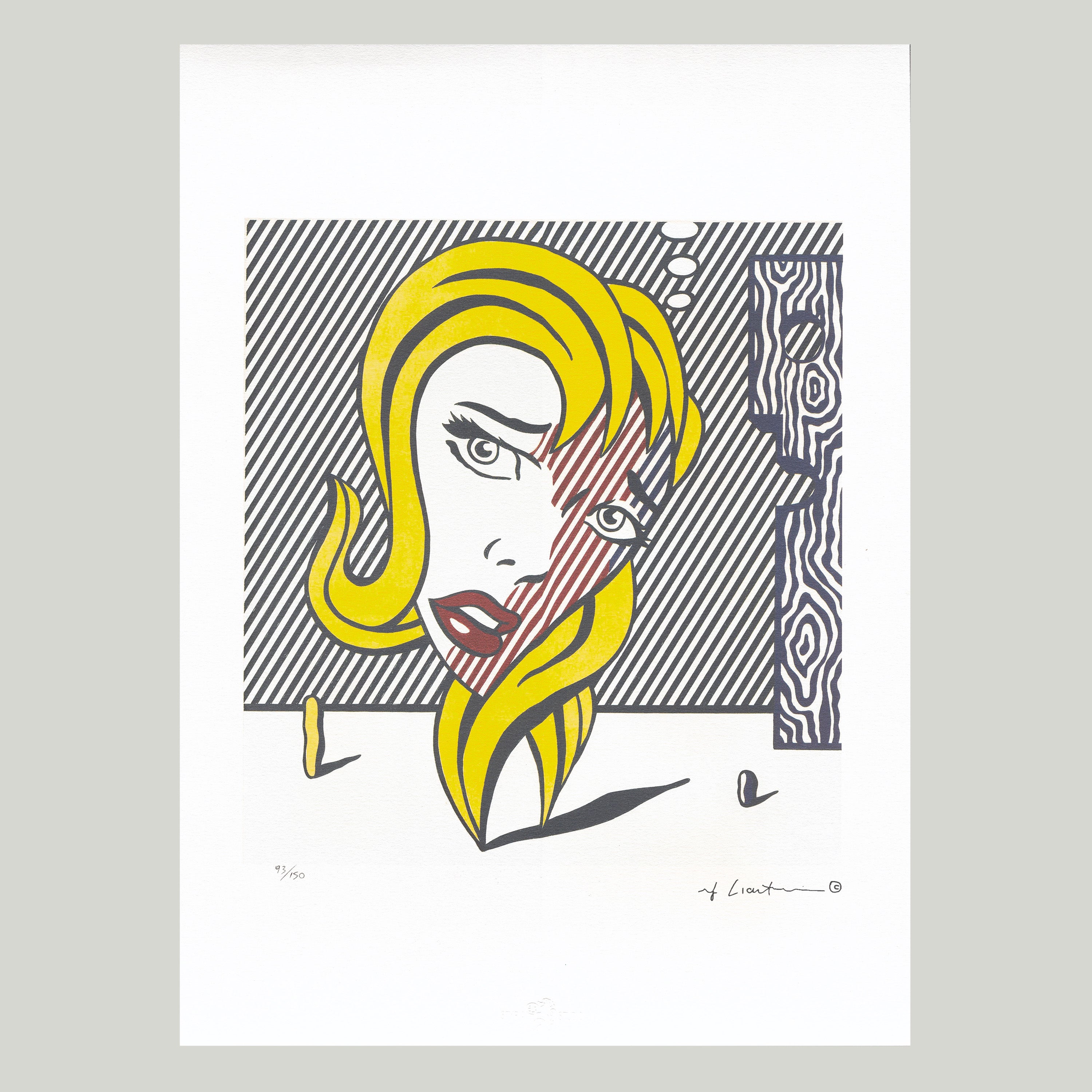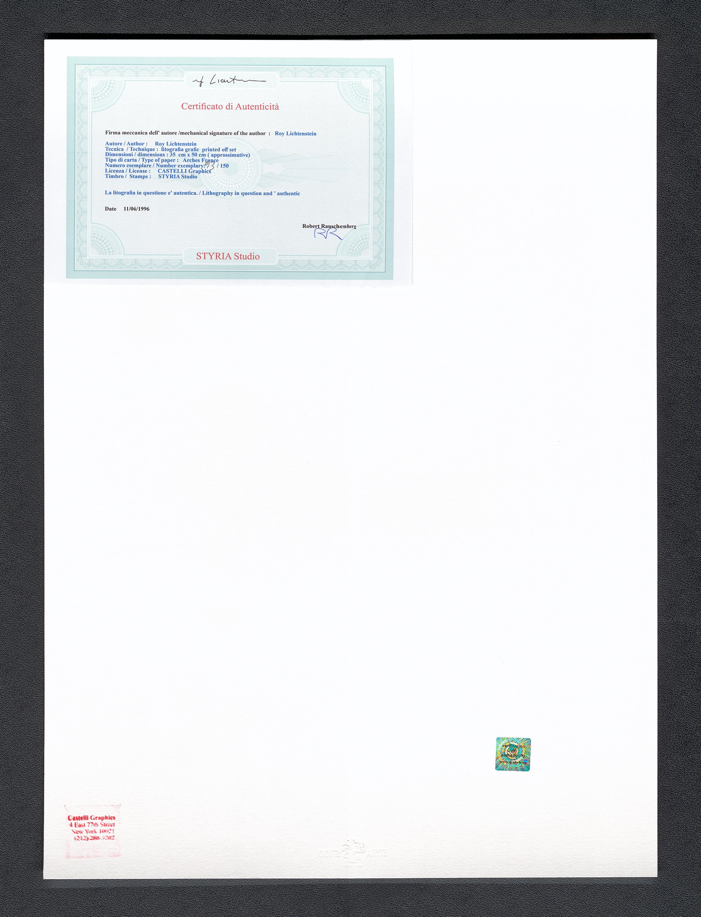 Certifikovaný grafický list, 35 x 50 cm. Certifikát, slepotisk STYRIA Studio, ruční papír Arches France. Signováno vpravo dole Roy Lichtenstein ©. Na zadní straně razítkoCASTELLI Graphics.