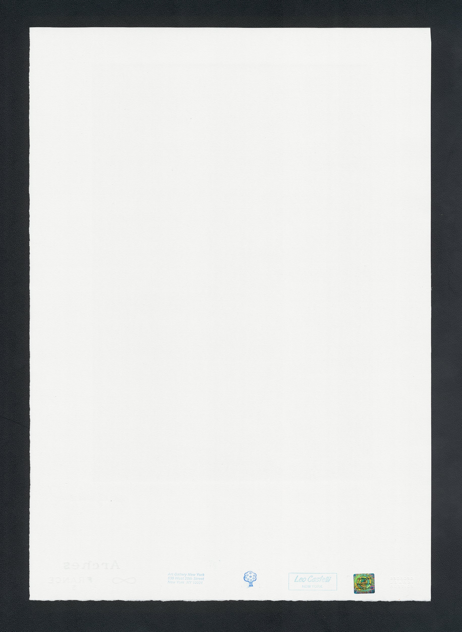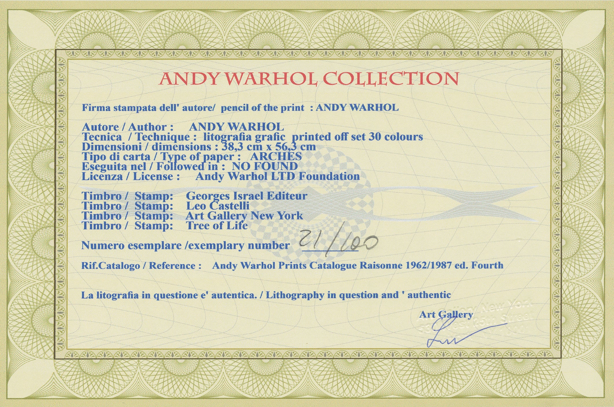 Certifikovaný grafický list, 38 x 56 cm, 21/100. Certifikát, slepotisk © ANDY WARHOL, ruční papír Fabriano Privilege. Signováno vpravo dole Andy Warhol. Na zadní straně razítka: ANDY WARHOL Factory.