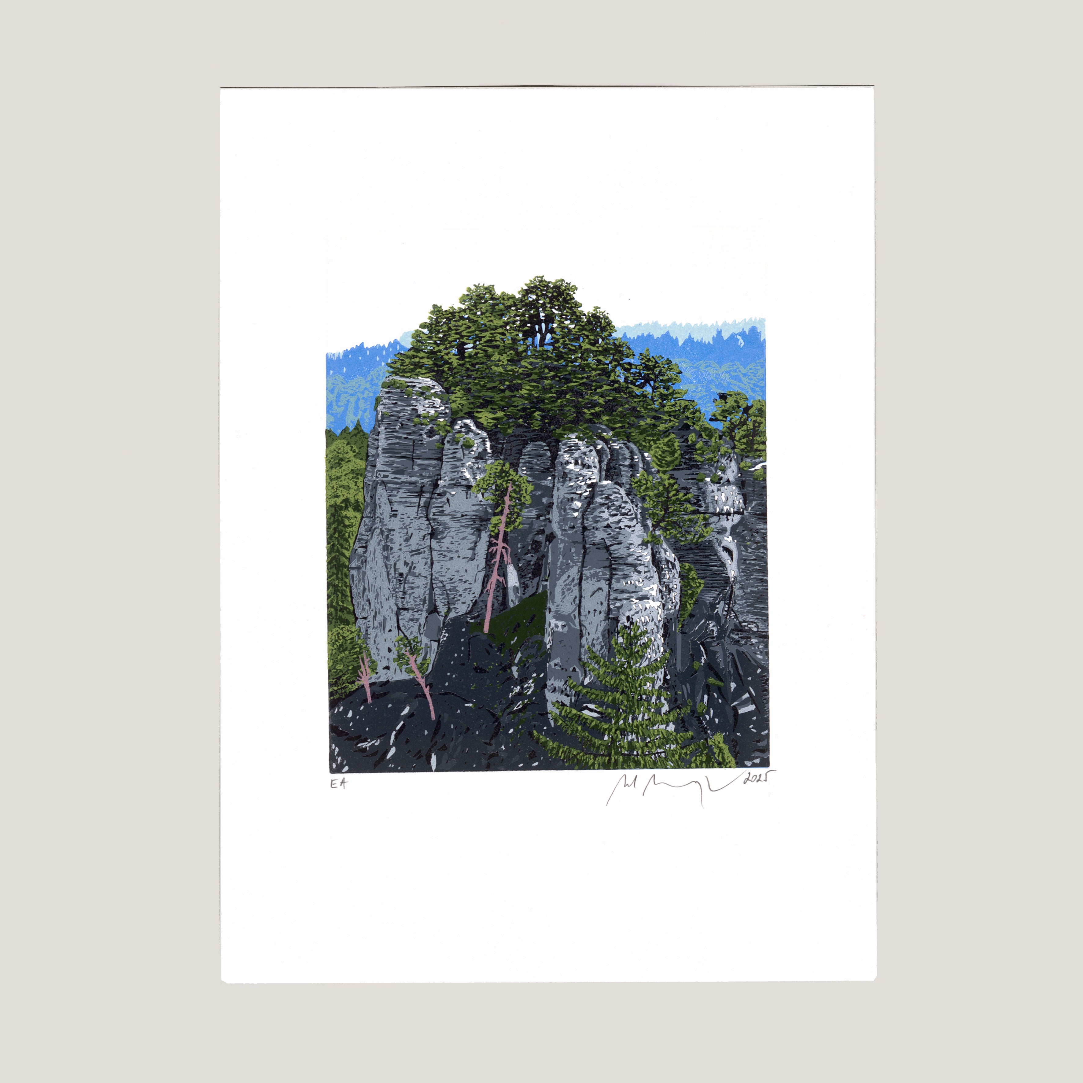 Barevný linoryt 14x18 cm tisková plocha, 21x29,6 cm grafický list číslováno EA, signováno M. Manojlín 2025