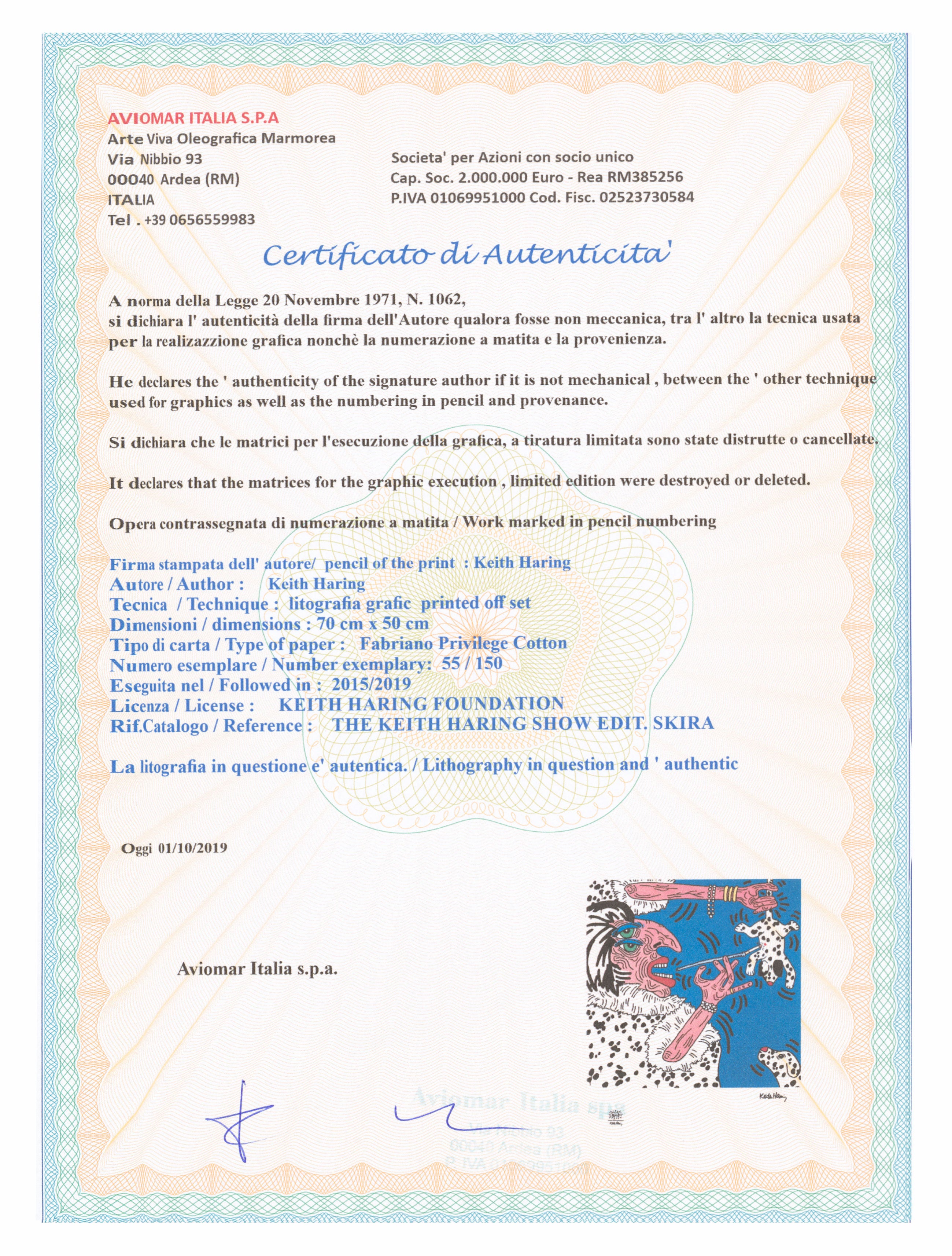 Certifikovaný grafický list, 50 x 70 cm. Číslováno, certifikát, slepotisk a licence KEITH HARING FOUNDATION, ruční papír Fabriano Privilege Cotton. Signováno vpravo dole Keith Haring. Číslo konkrétního grafického listu se může lišit od uvedeného vyobrazení.