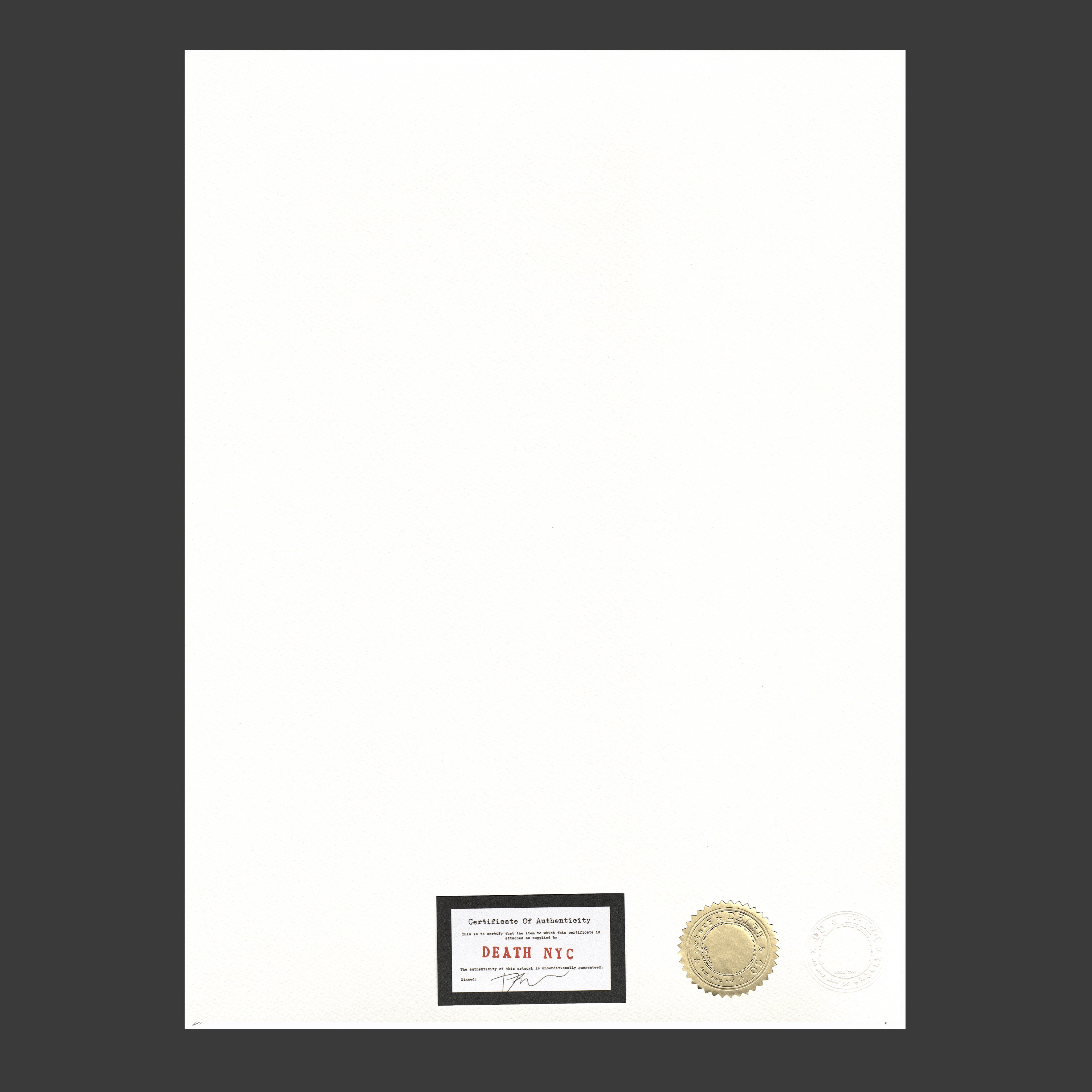 Grafický list, 32 x 45 cm. Ruční papír © Fine Art 300g. Signováno vpravo dole Death NYC. Slepotisk vlevo dole © DEATH NYC, NEW YORK CITY. Certifikát © DEATH NYC + zlatá nalepovací pečeť.