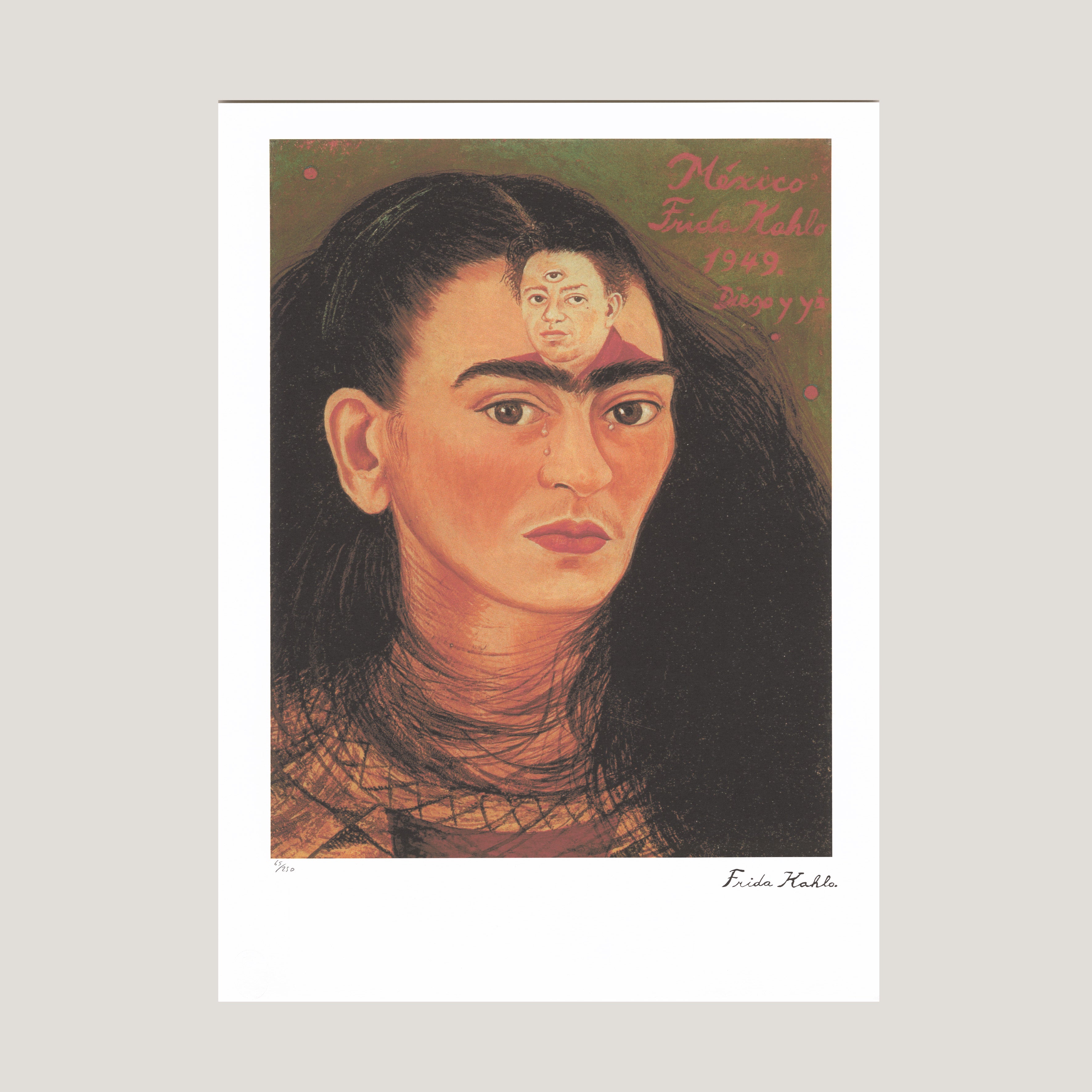 Grafický list 50x70 cm v limitovaném nákladu. Tisk č. 65/250. Slepotiskové razítko Leonardo Artis. Volný list. Certifikát, ruční papír Arches. Licence: Frida Kahlo Museum. Editor: Oro Cartier Limited Editions