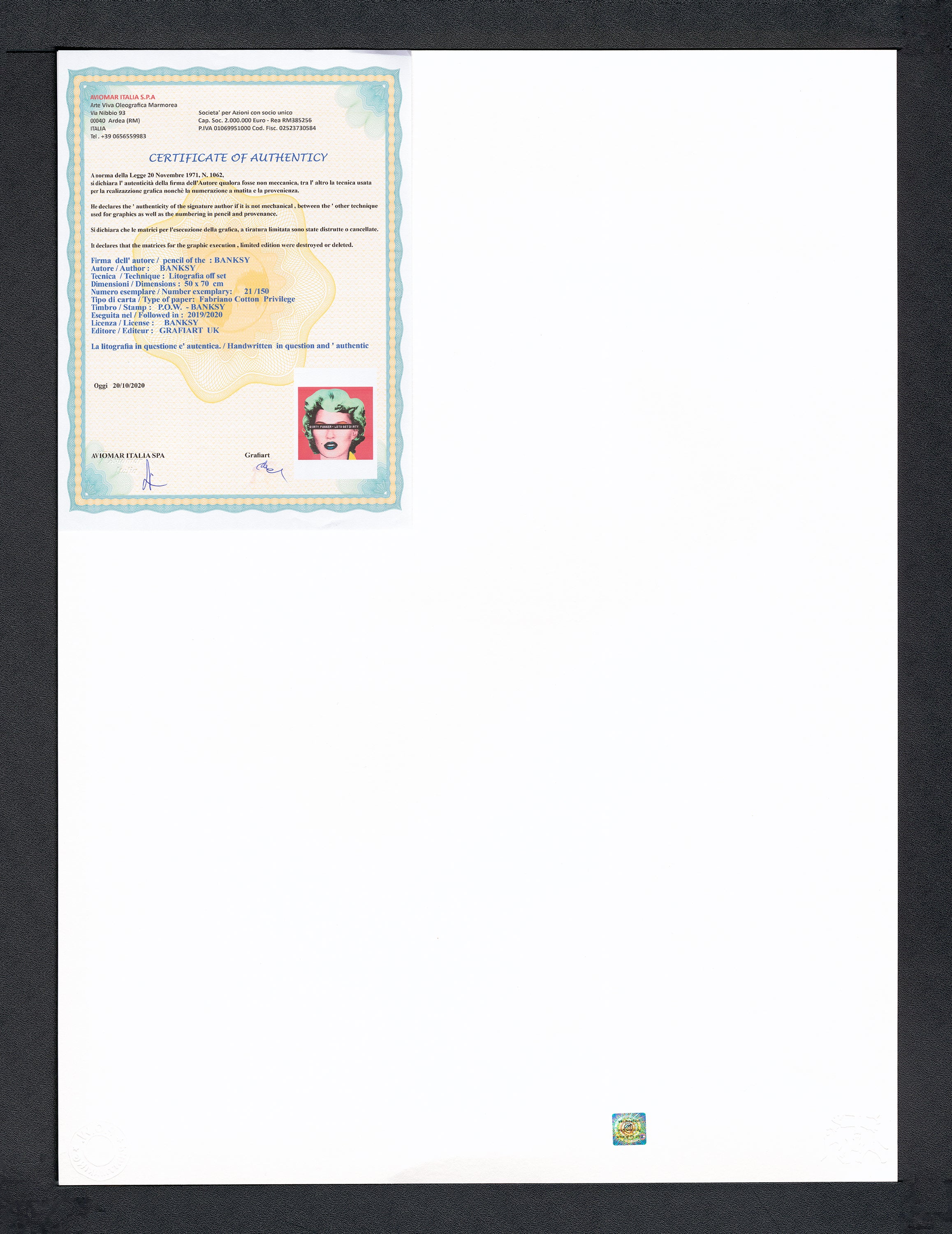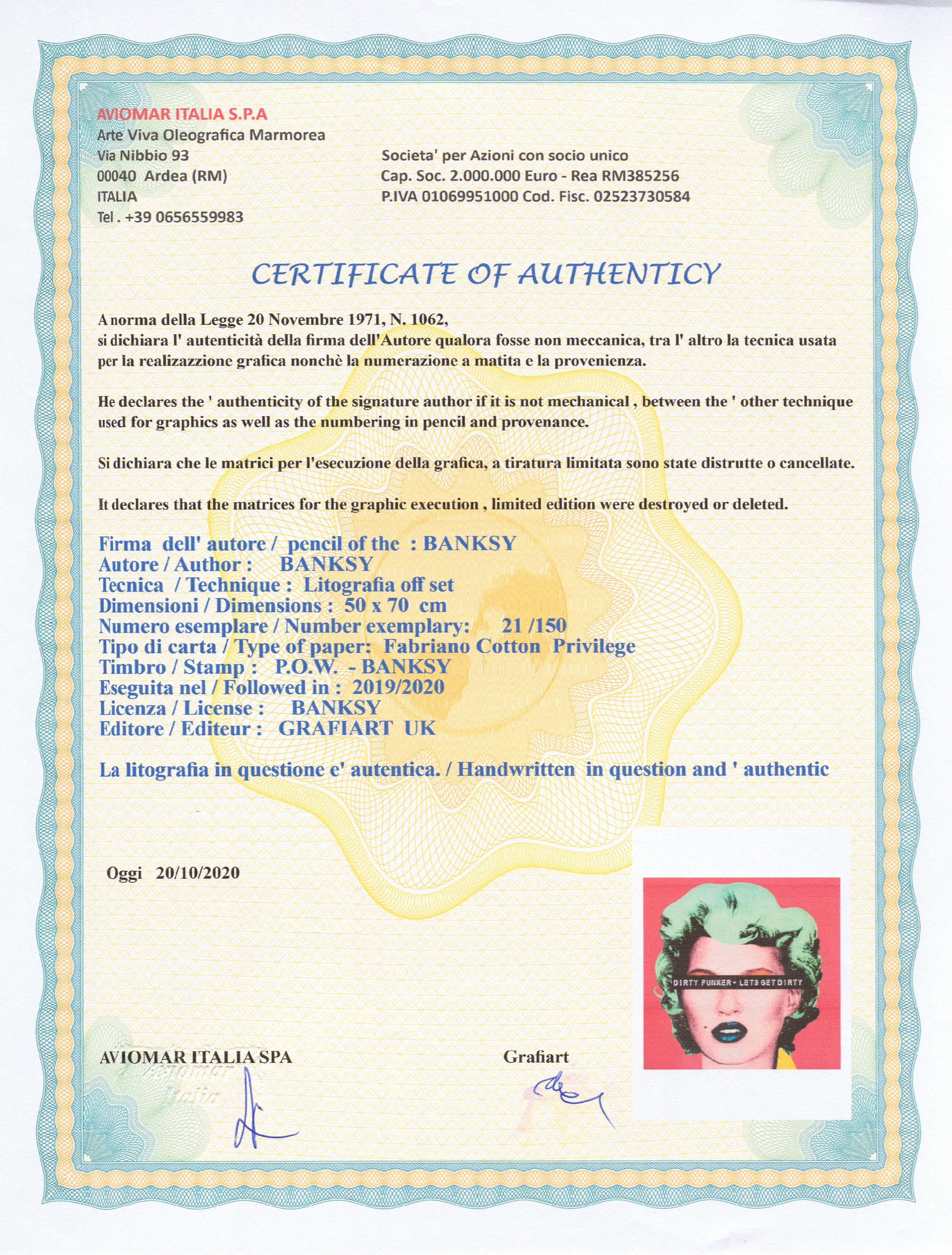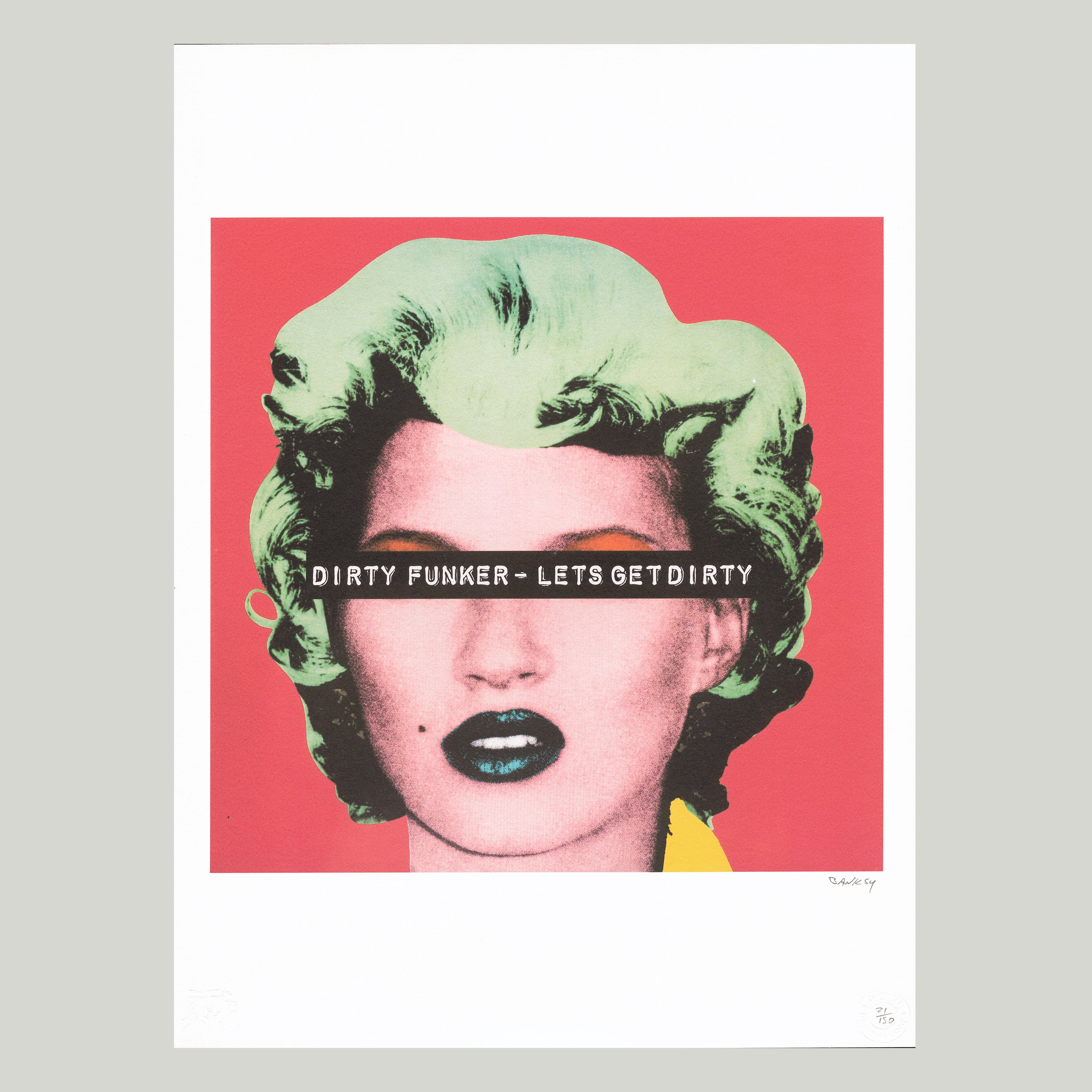 Grafický list, 50 x 70 cm. Číslováno, slepotisk P.O.W.-BANKSY, ruční papír Fabriano Cotton Privilege. Signováno vpravo dole BANKSY.