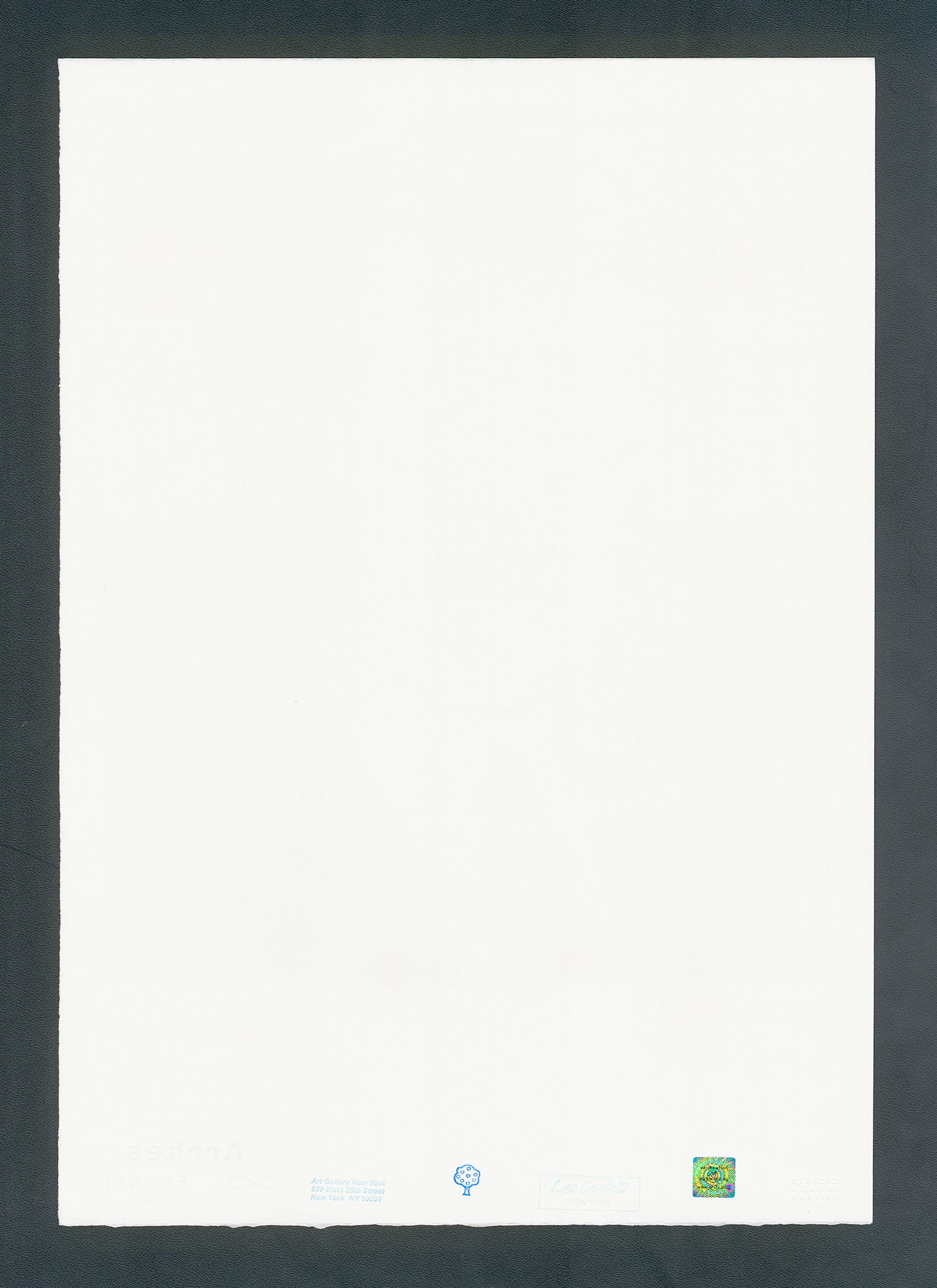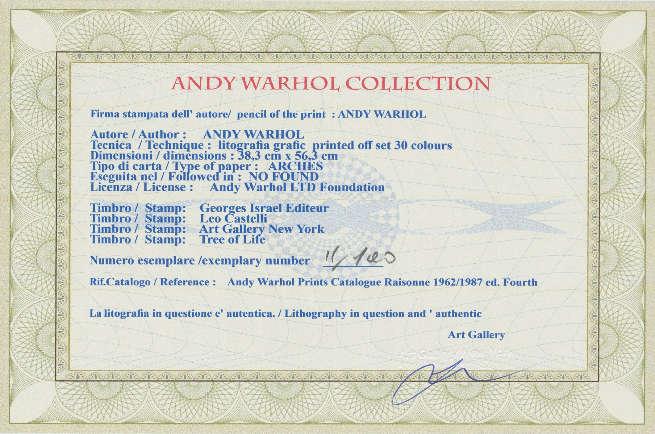 Certifikovaný grafický list, 38 x 56 cm, 11/100. Certifikát, slepotisk © ANDY WARHOL, ruční papír Fabriano Privilege. Signováno vpravo dole Andy Warhol. Na zadní straně razítka: ANDY WARHOL Factory.