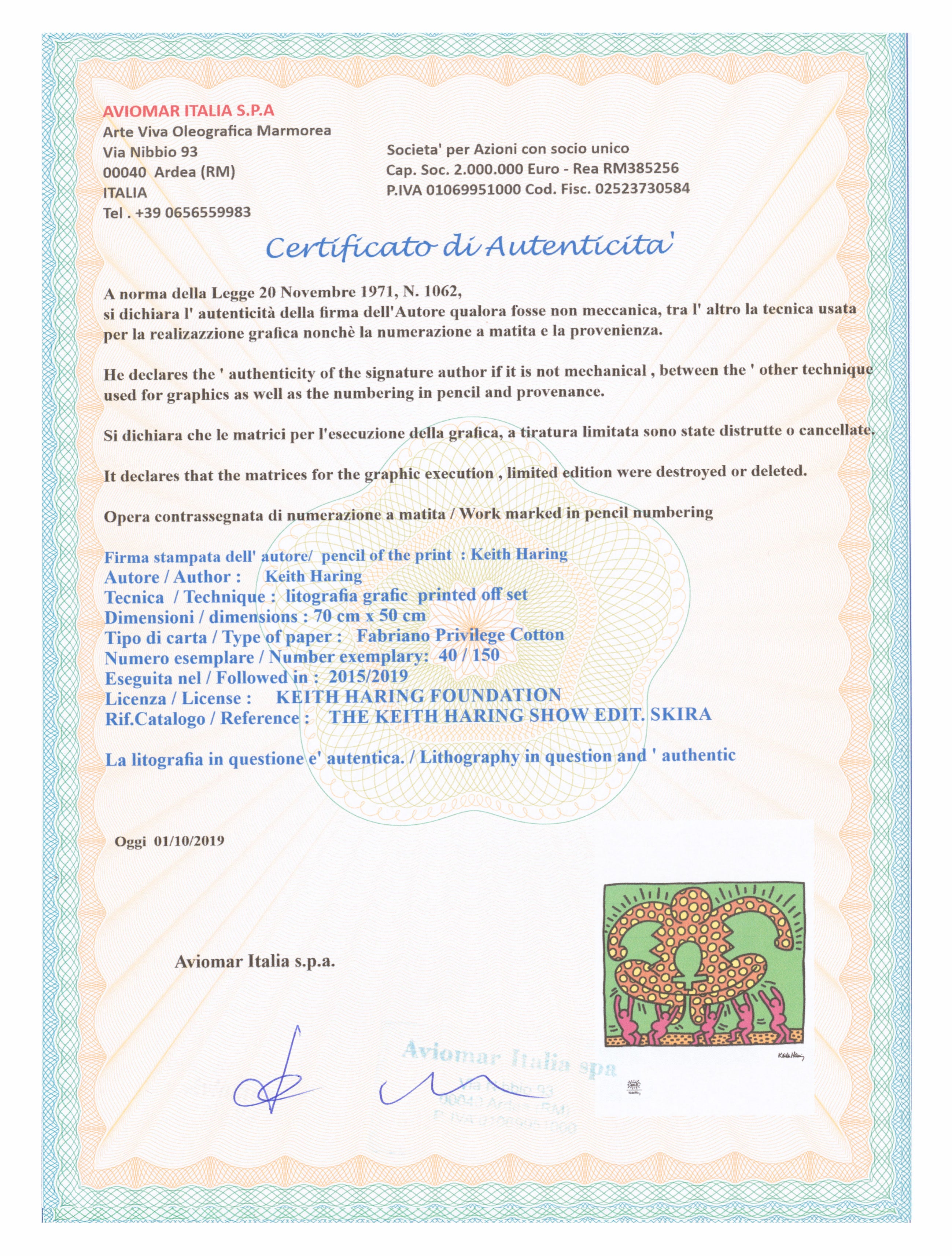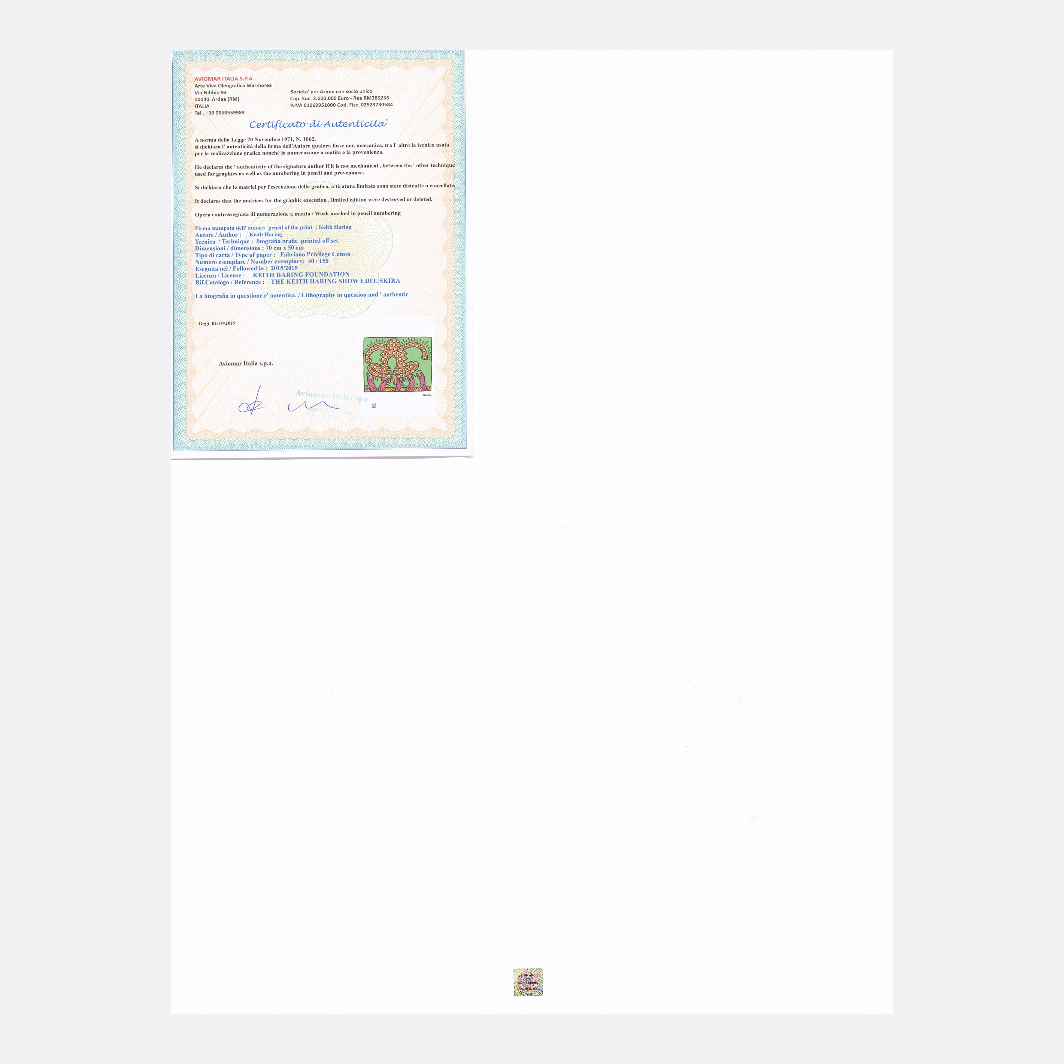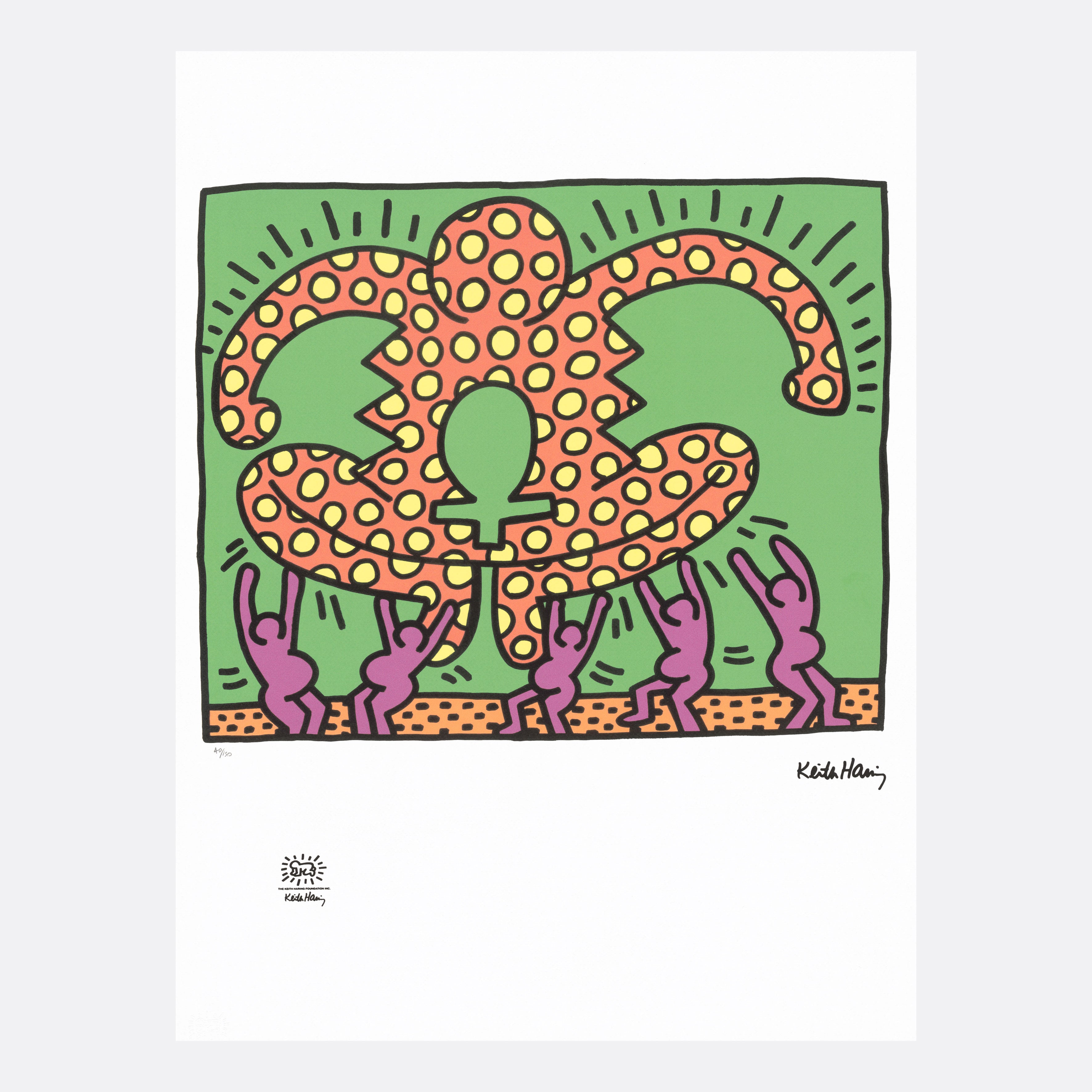 Certifikovaný grafický list, 50 x 70 cm. Číslováno, certifikát, slepotisk a licence KEITH HARING FOUNDATION, ruční papír Fabriano Privilege Cotton. Signováno vpravo dole Keith Haring. Číslo konkrétního grafického listu se může lišit od uvedeného vyobrazení.