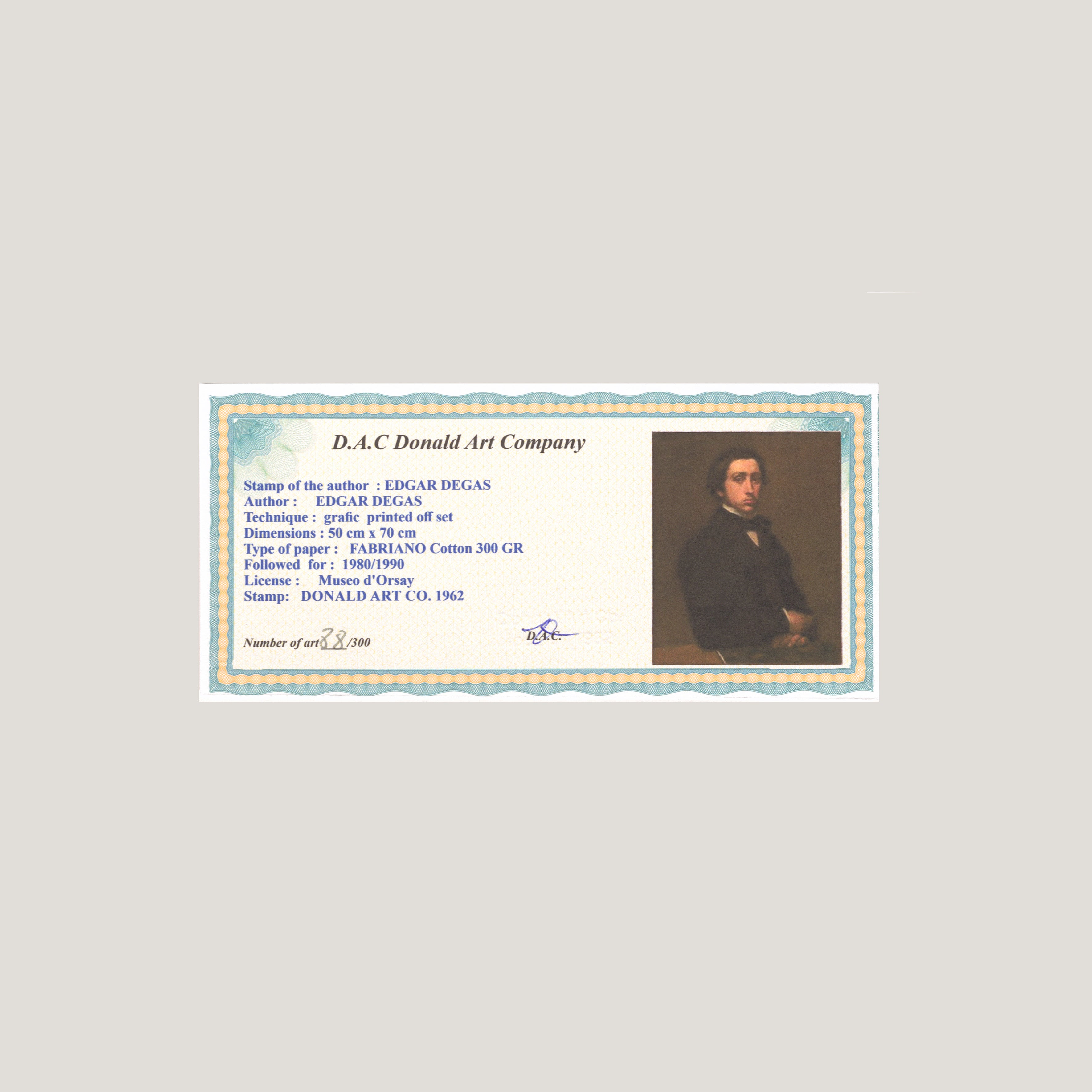 Grafický list 50x70 cm v limitovaném nákladu. Tisk č. 88/300. Slepotiskové razítko DONALD ART CO. 1962. Volný list. Papír FABRIANO Cotton 300 GR. Licence: Museo d´Orsay