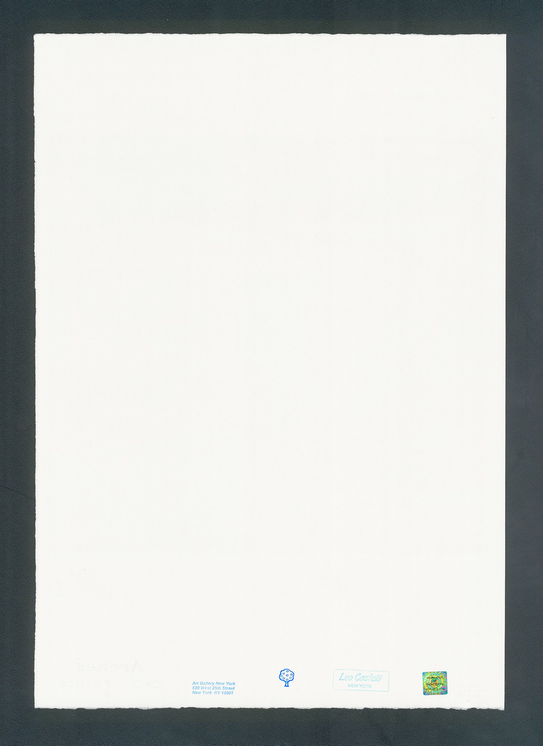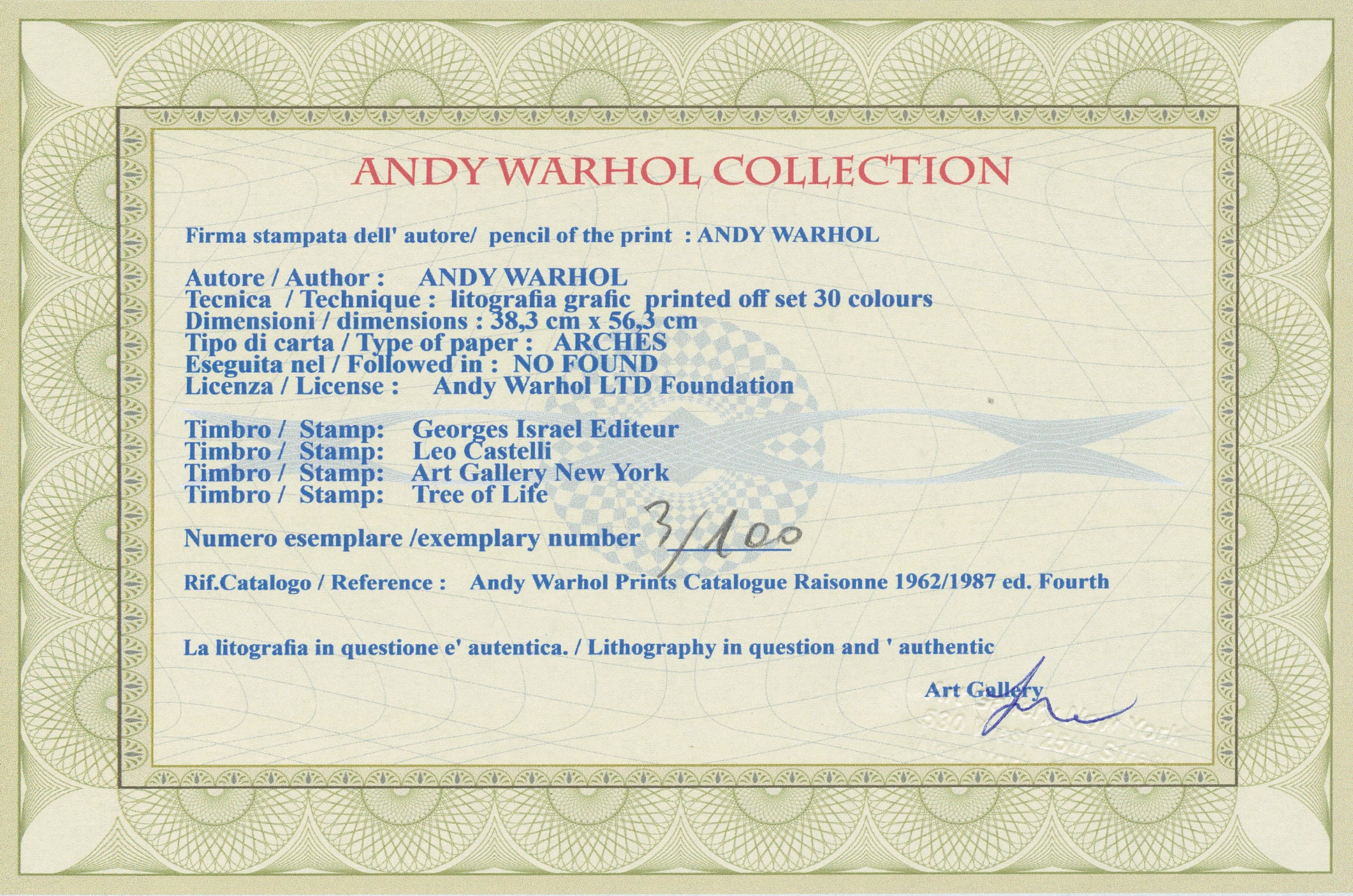 Certifikovaný grafický list, 38 x 56 cm. Certifikát, slepotisk © ANDY WARHOL, ruční papír Fabriano Privilege. Signováno vpravo dole Andy Warhol. Na zadní straně razítka: ANDY WARHOL Factory.
