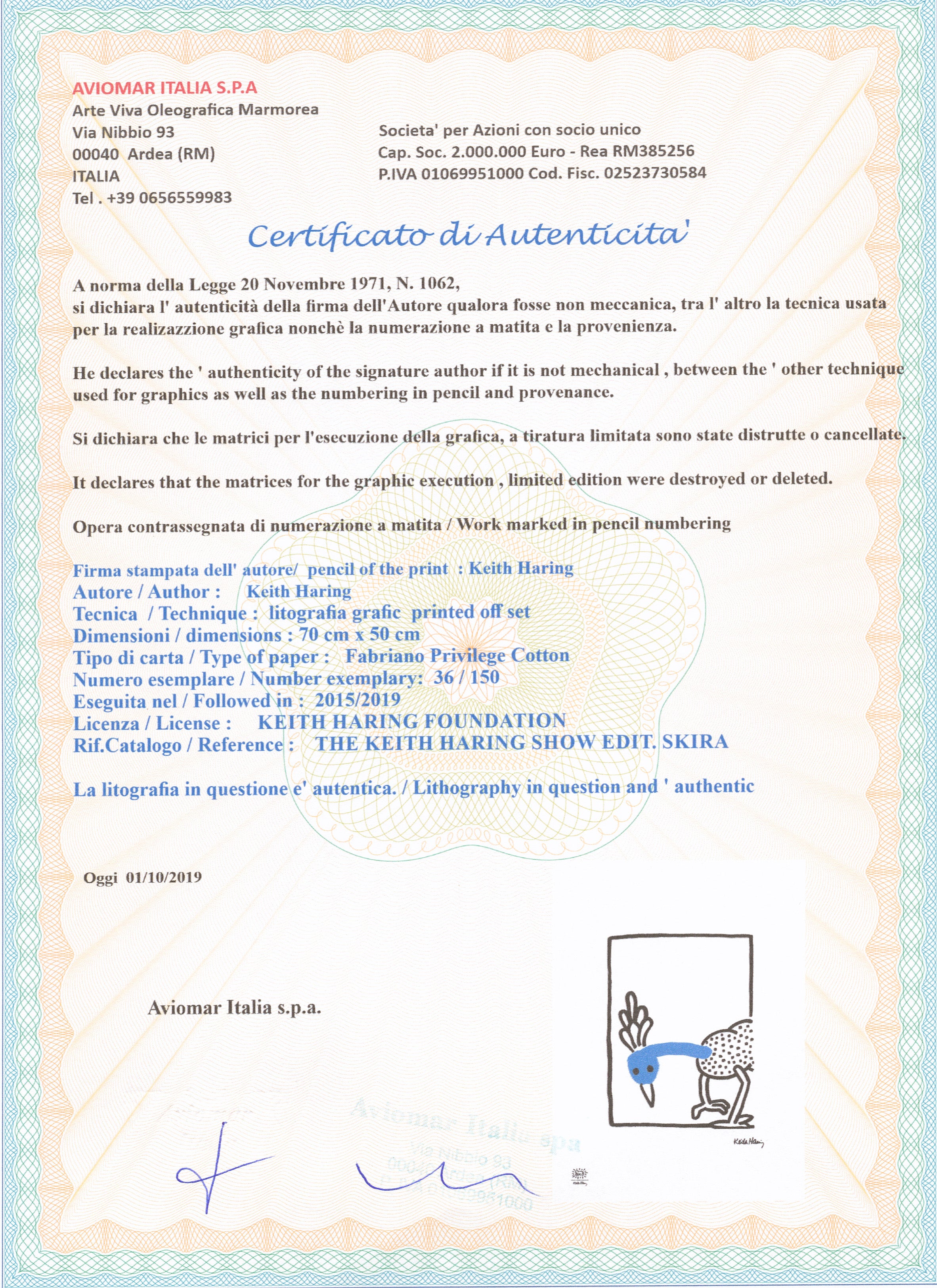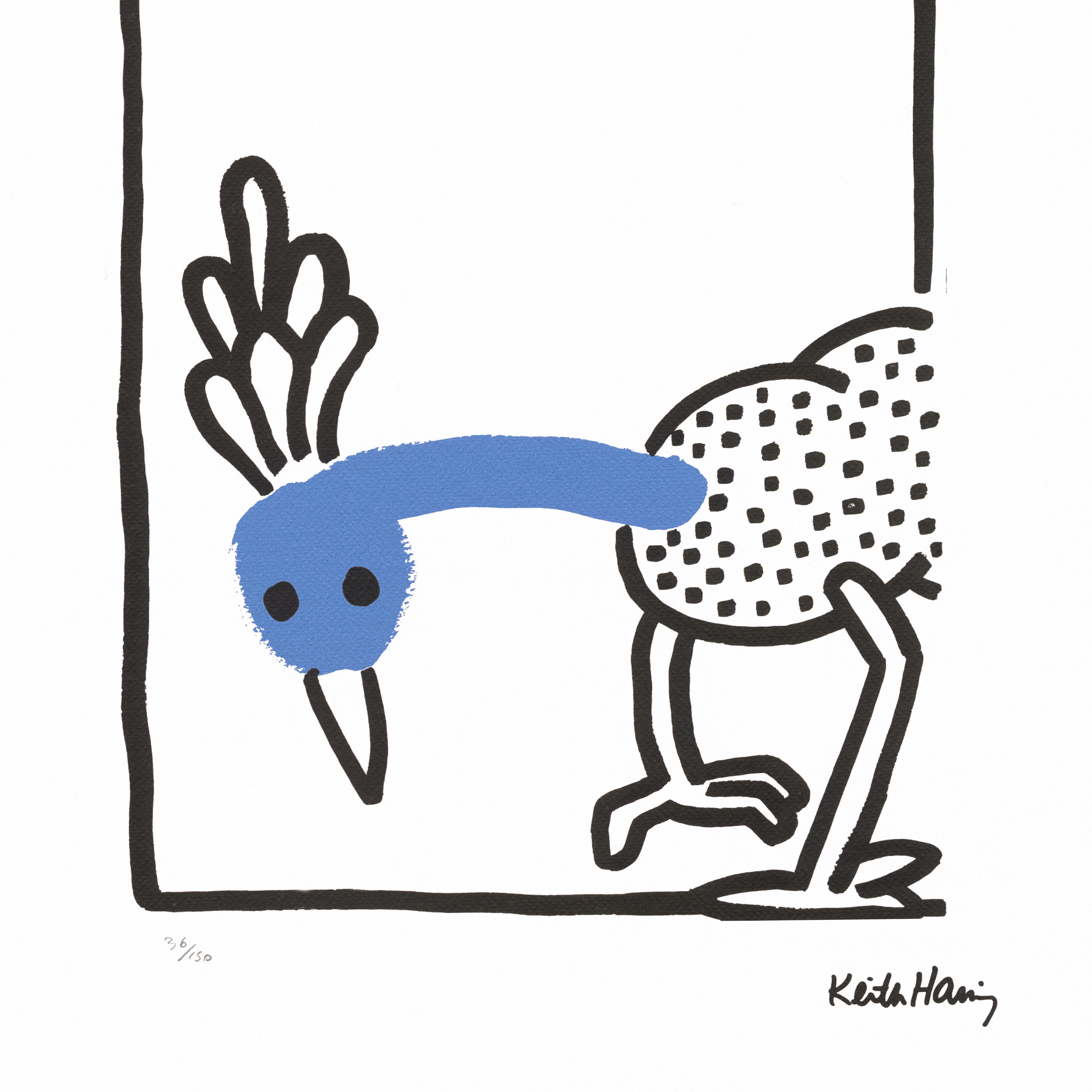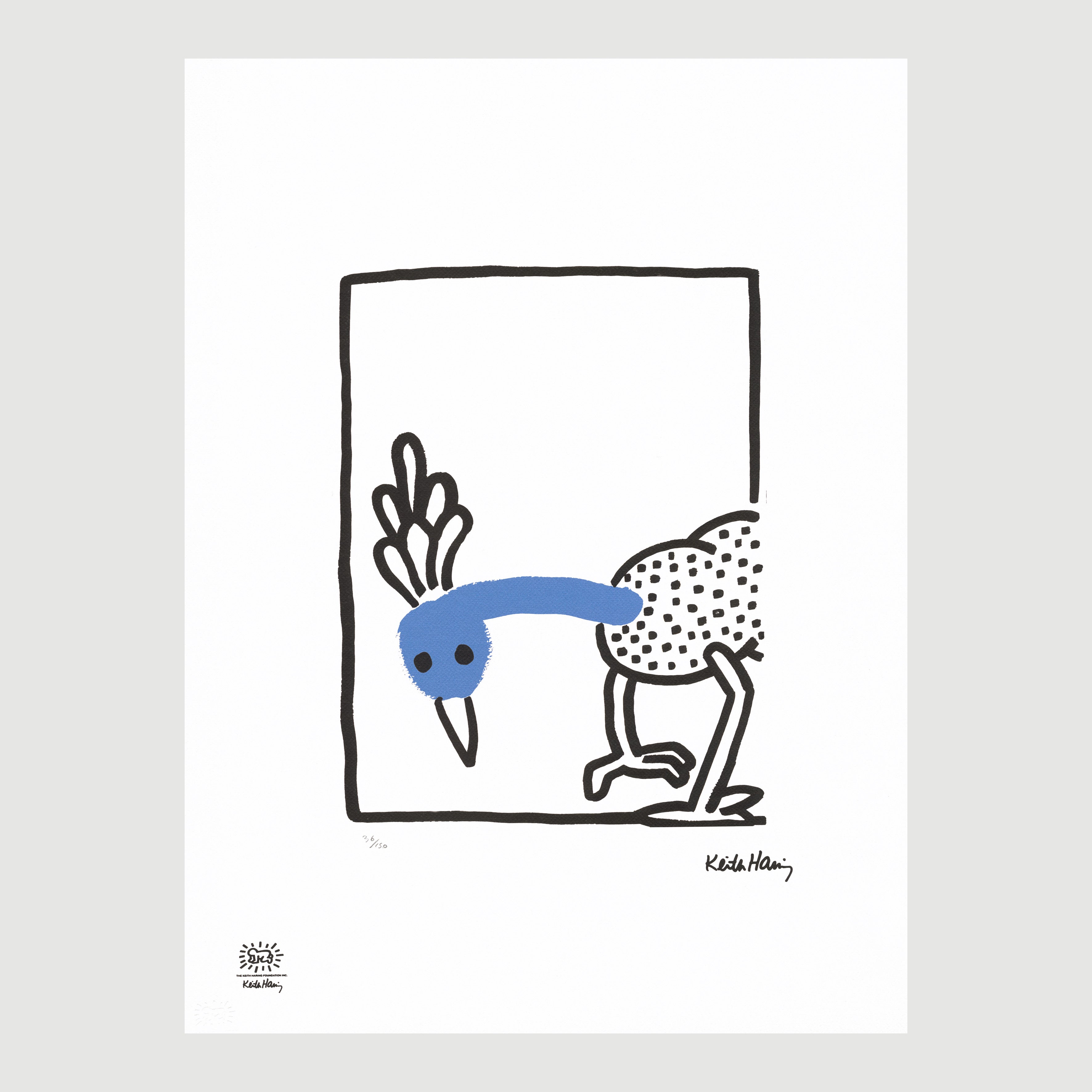 Certifikovaný grafický list, 50 x 70 cm. Číslováno 36/150. Certifikát, slepotisk a licence KEITH HARING FOUNDATION, ruční papír Fabriano Privilege Cotton. Signováno vpravo dole Keith Haring.