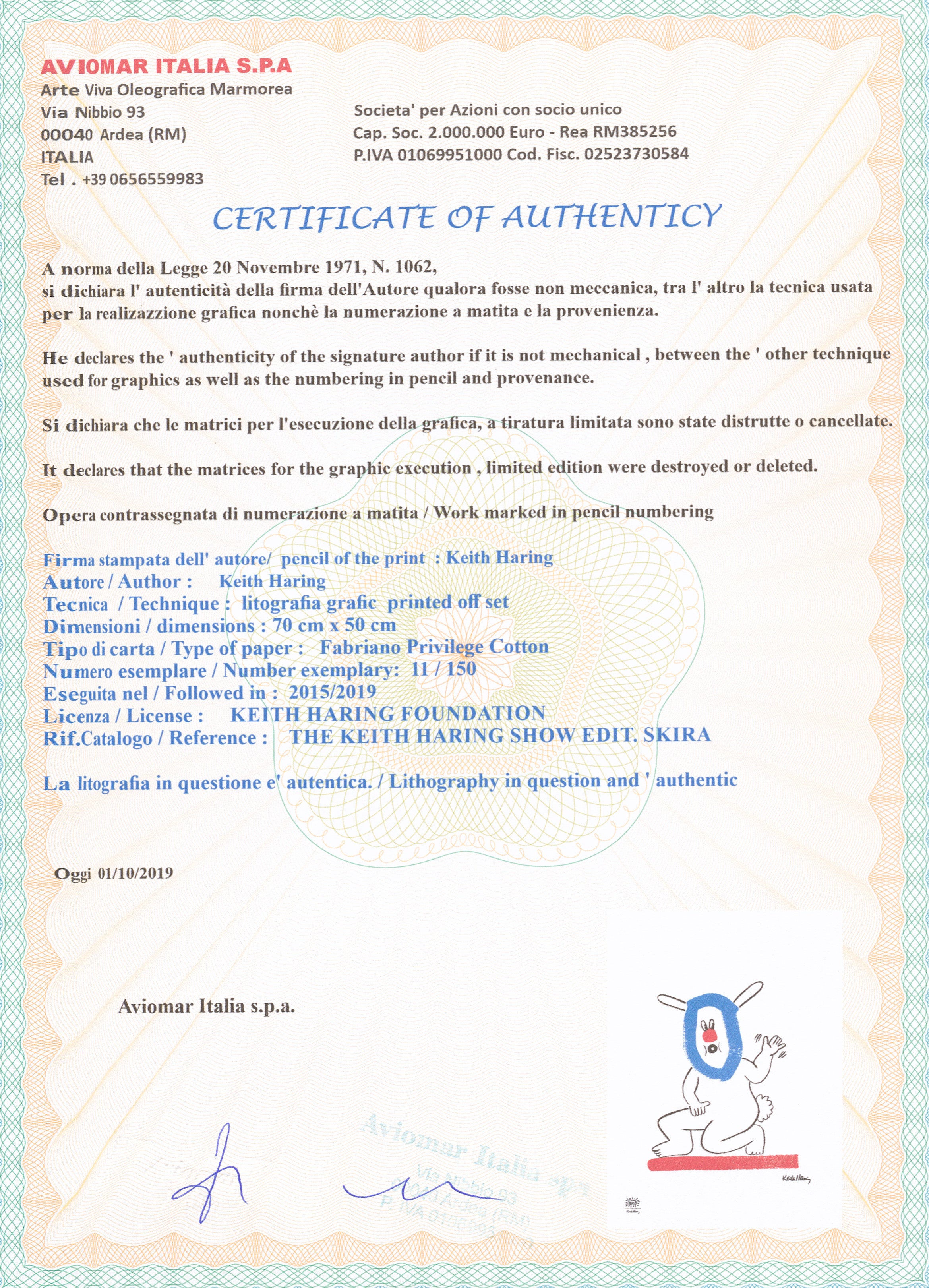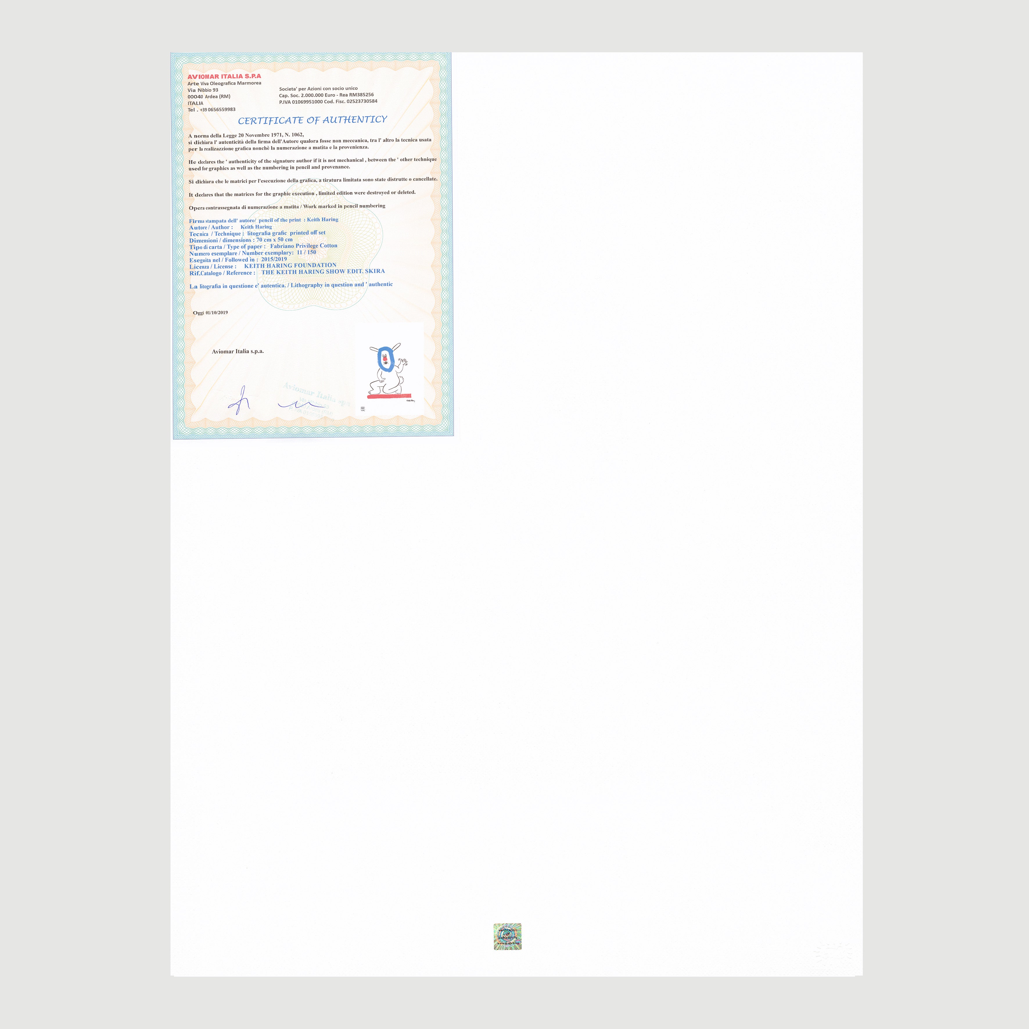Certifikovaný grafický list, 50 x 70 cm. Číslováno 11/150. Certifikát, slepotisk a licence KEITH HARING FOUNDATION, ruční papír Fabriano Privilege Cotton. Signováno vpravo dole Keith Haring.