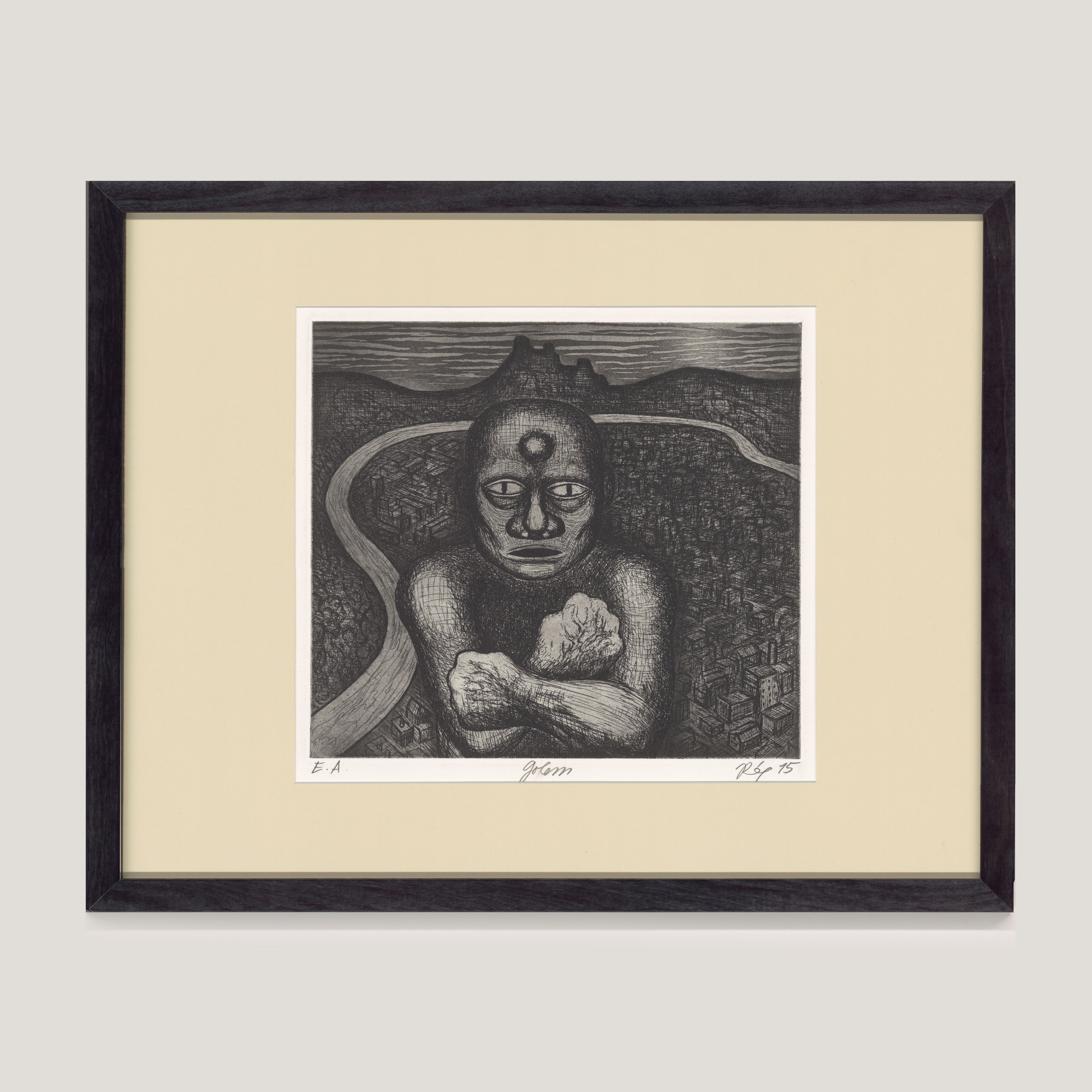 Grafika malíře a sochaře Jaroslava Róny. Lept, akvatinta. Signovaný autorský tisk. Tisková plocha 28x25,5 cm, grafický list 49,8x34,6 cm rám, 53x43 cm, cena včetně rámu